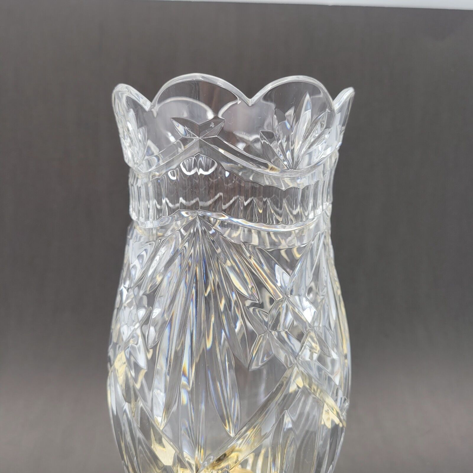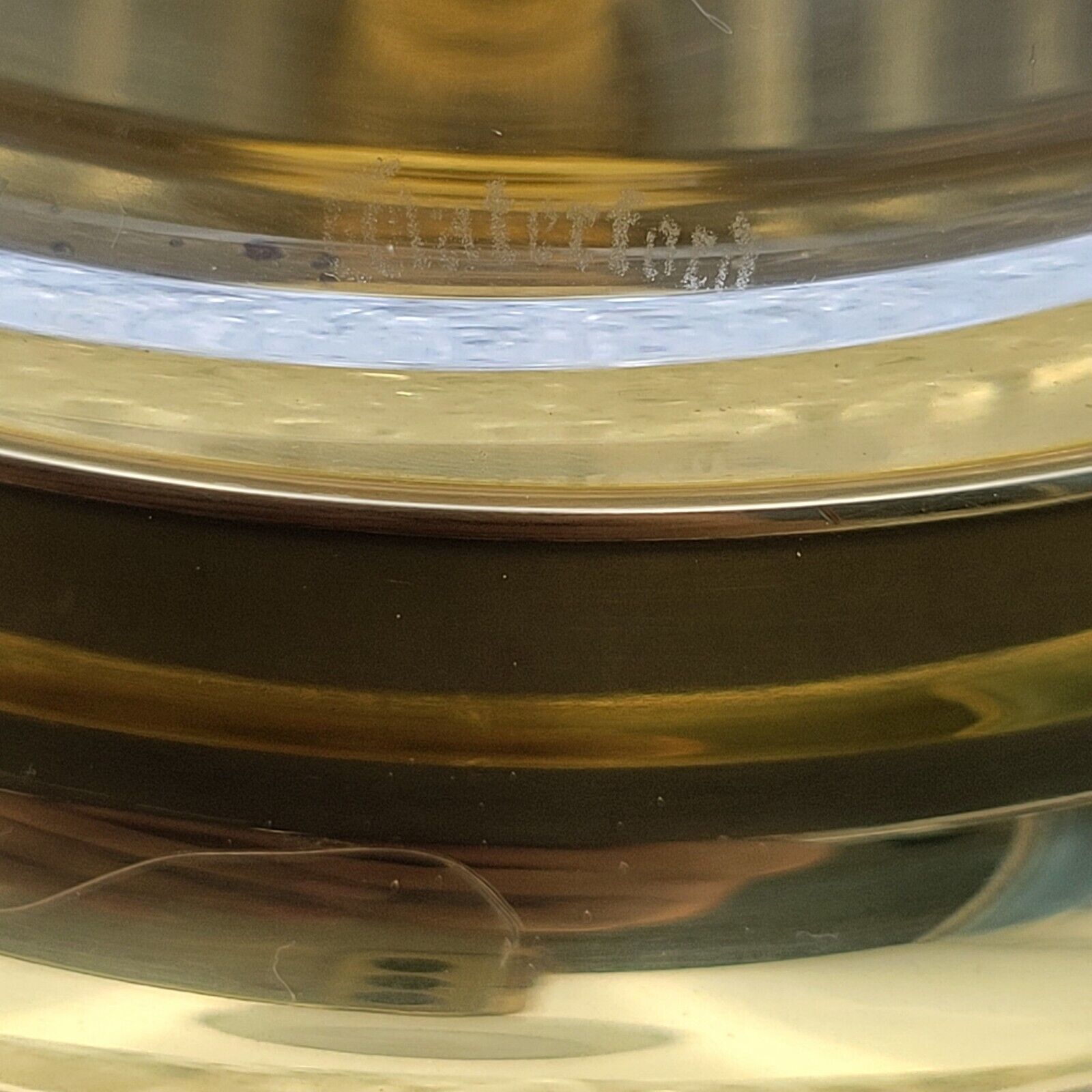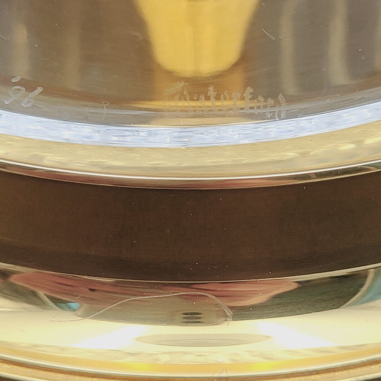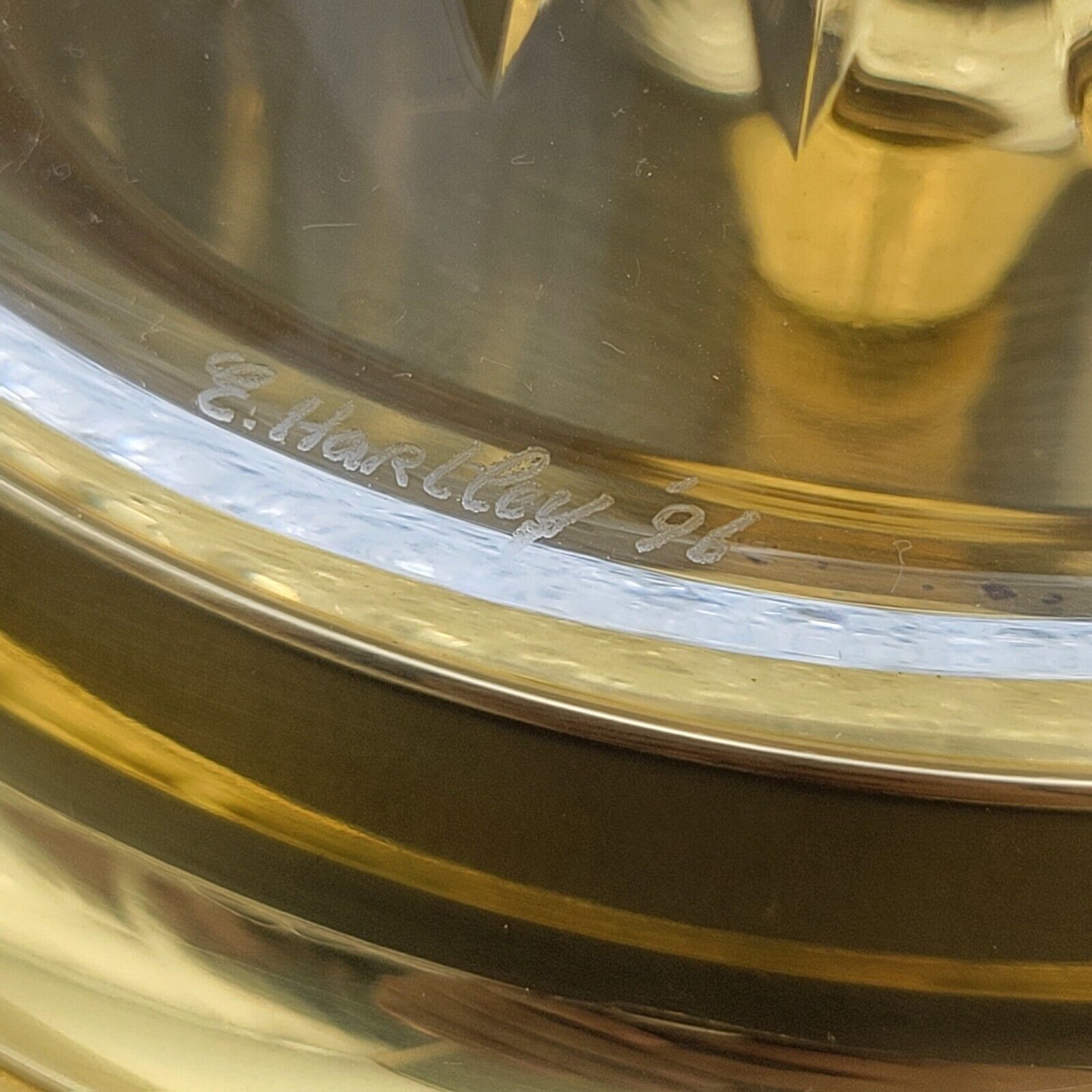 This stunning Waterford crystal candle holder is a true piece of Americana. A part of the 'America's Heritage' collection, this candle holder is a Thomas Jefferson Hurricane Lamp that has been signed by the artist. The clear crystal material adds a touch of elegance to any decor, making it perfect for any occasion. The detailing of the crystal perfectly captures the essence of America, making it a wonderful addition to any patriotic collection. The candle holder comes in its original box, adding to its appeal as a collector's item.