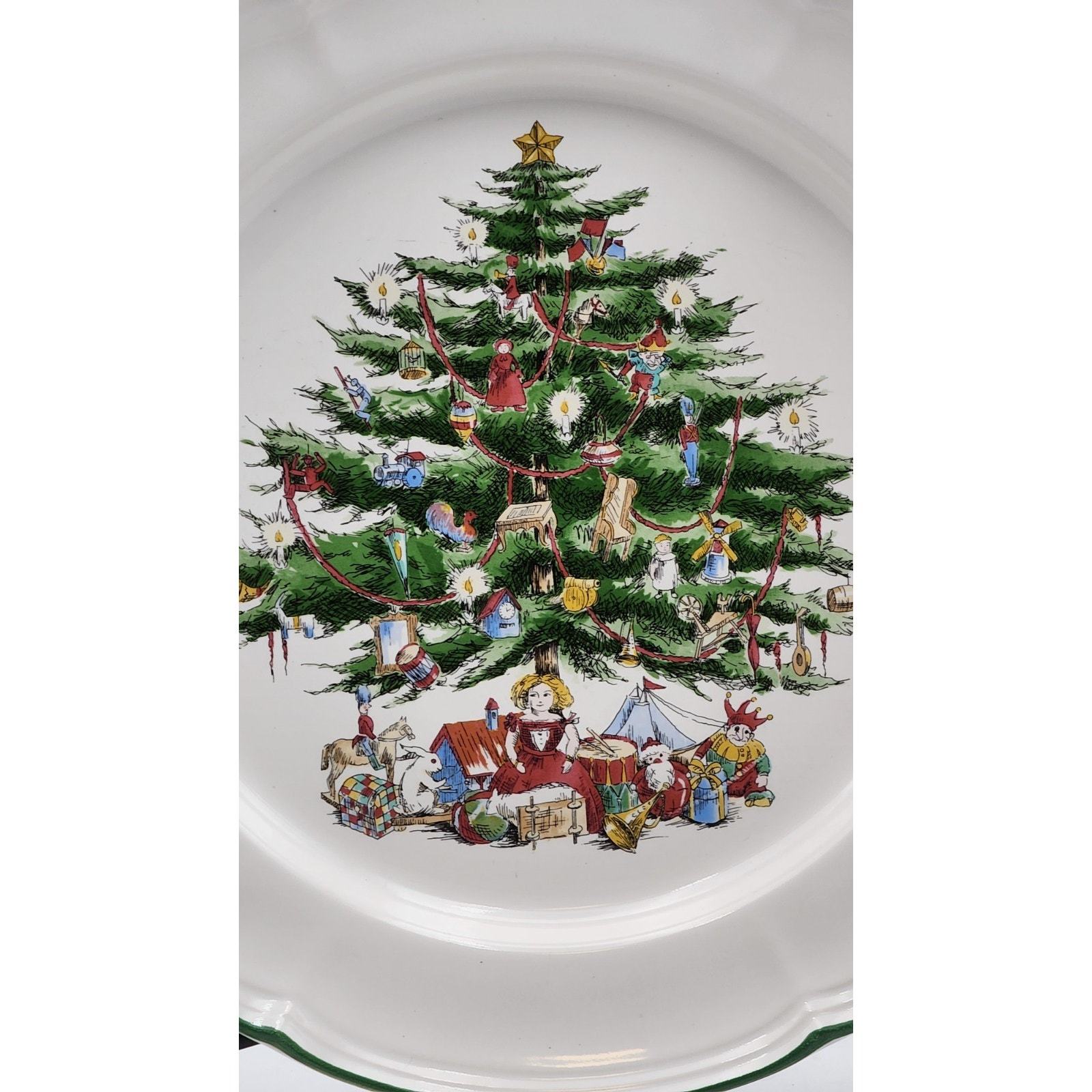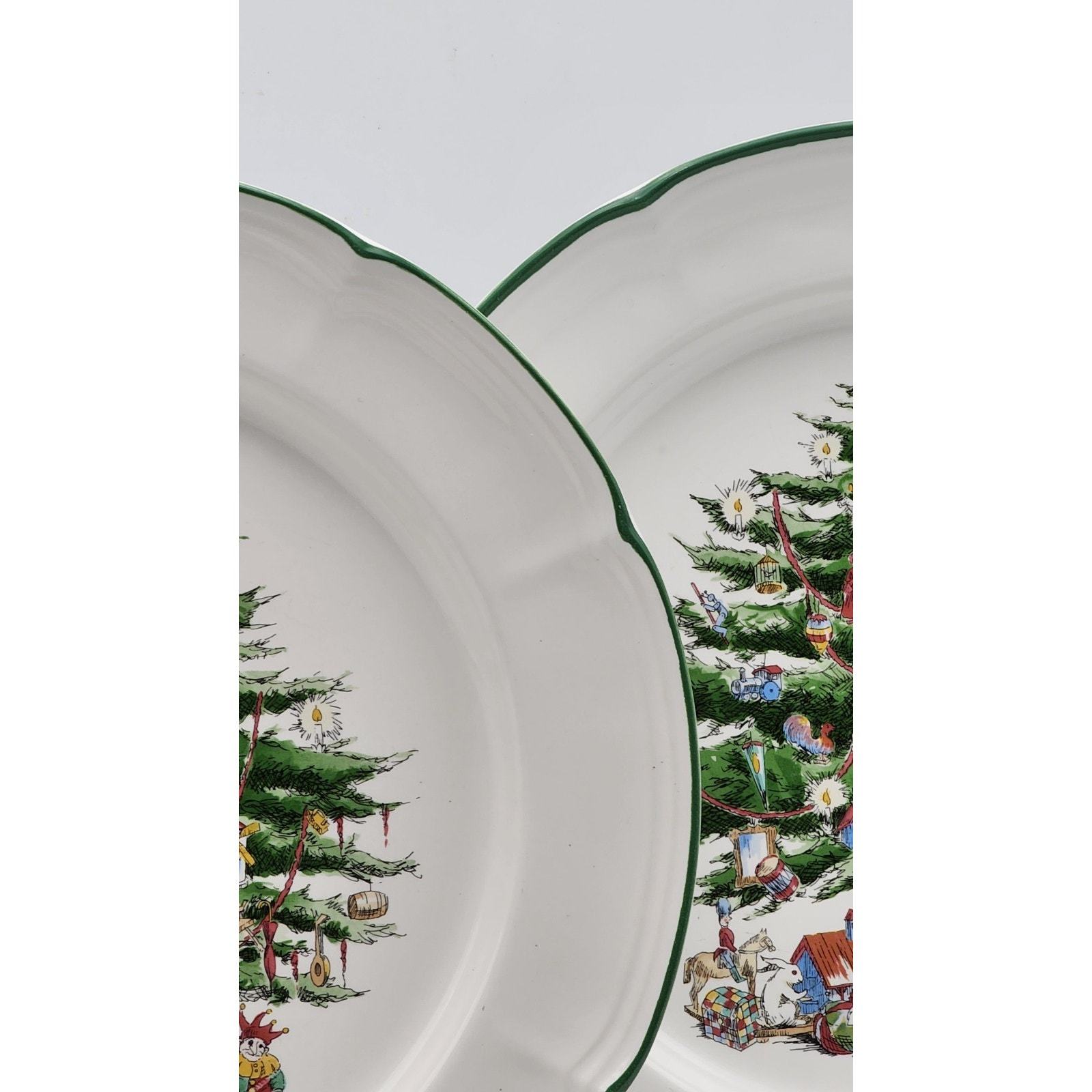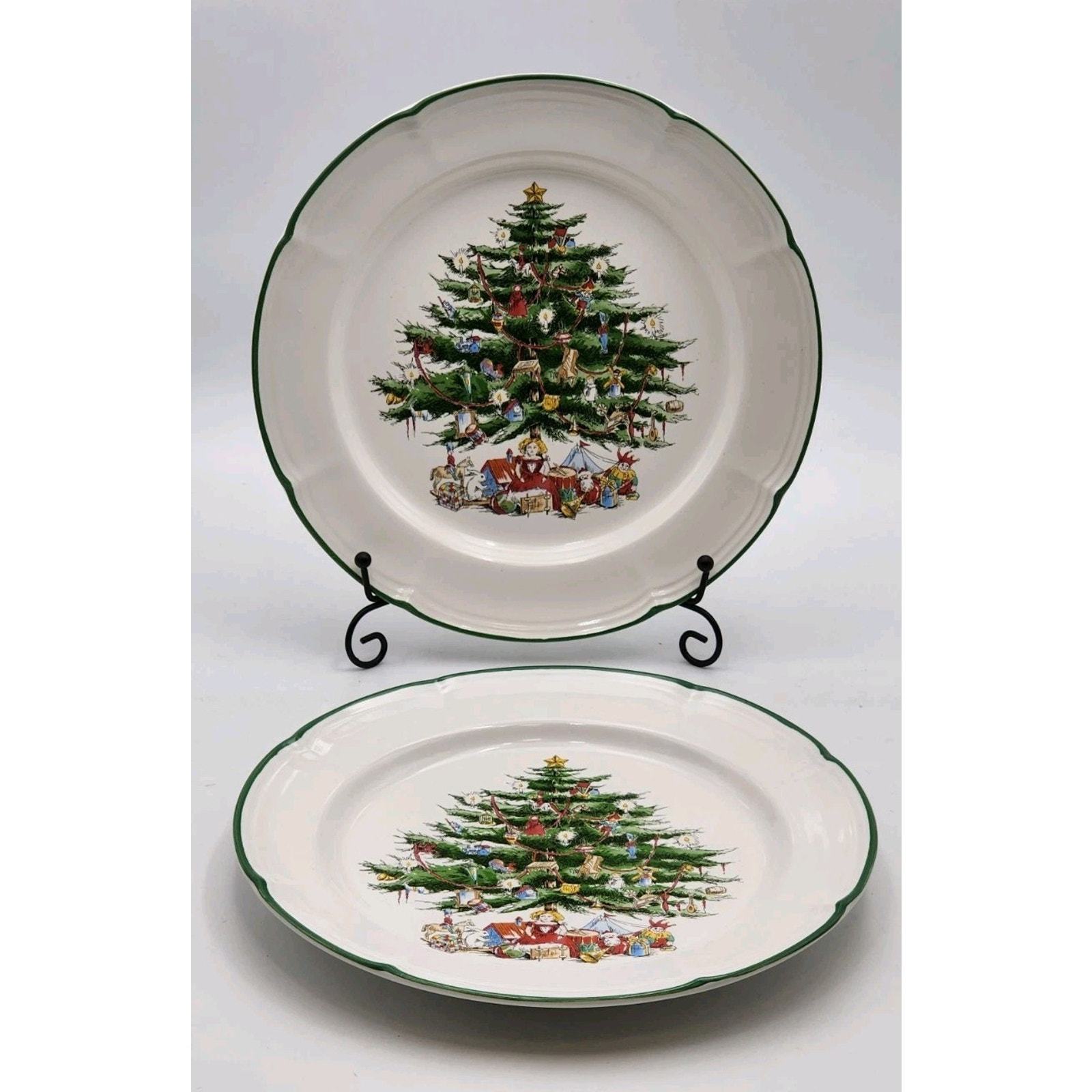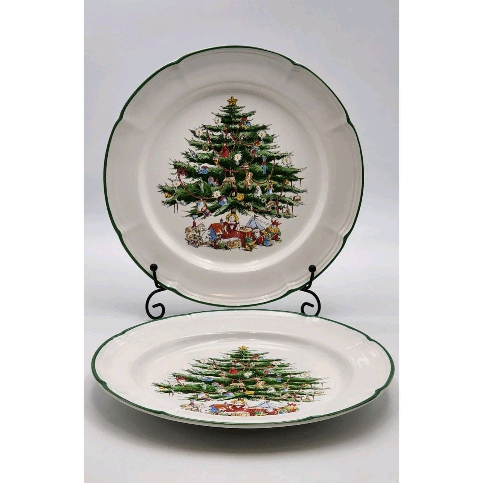 Celebrate the holiday season in style with this beautiful set of two vintage The Cellar Yuletide Christmas Tree Plates. Produced in 1992 and made in Japan exclusively for Macy's, these plates feature a charming Christmas tree design, beautifully adorned with gifts and festive decorations. The green trim adds a classic touch, making them perfect for both holiday meals and as collectible decor.