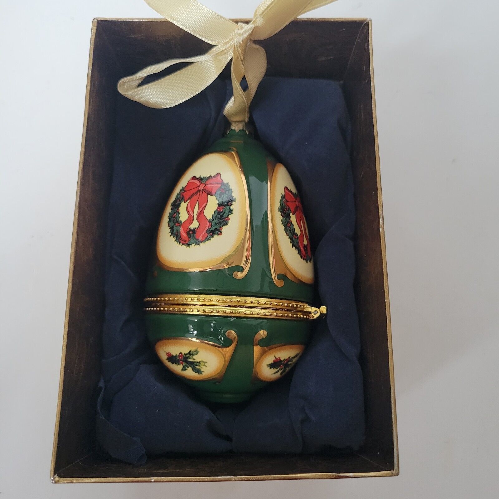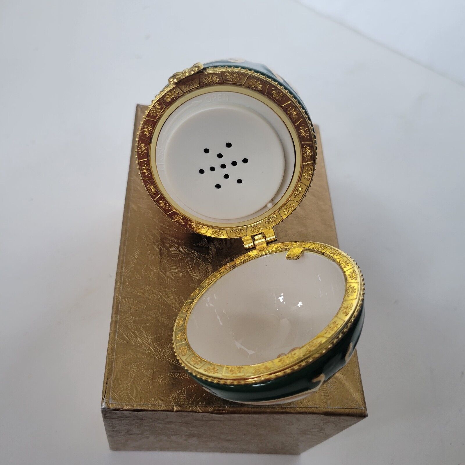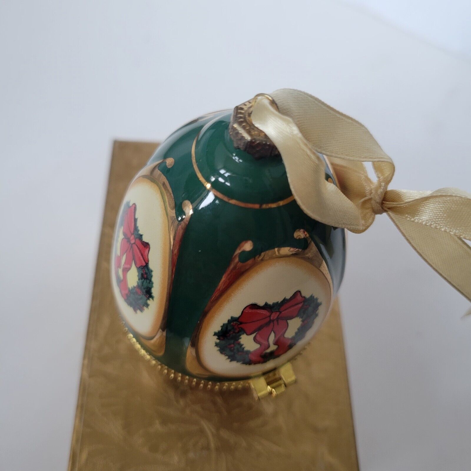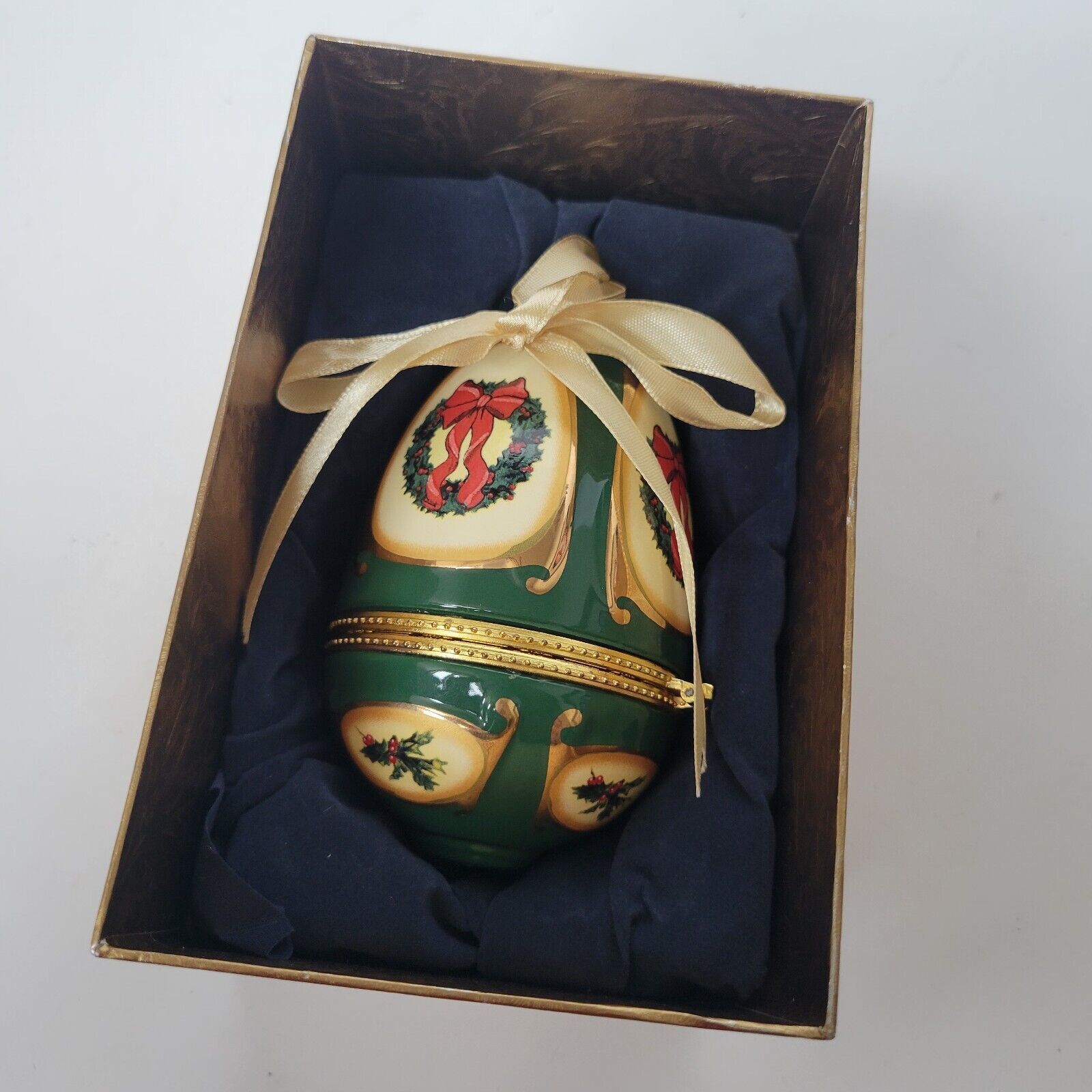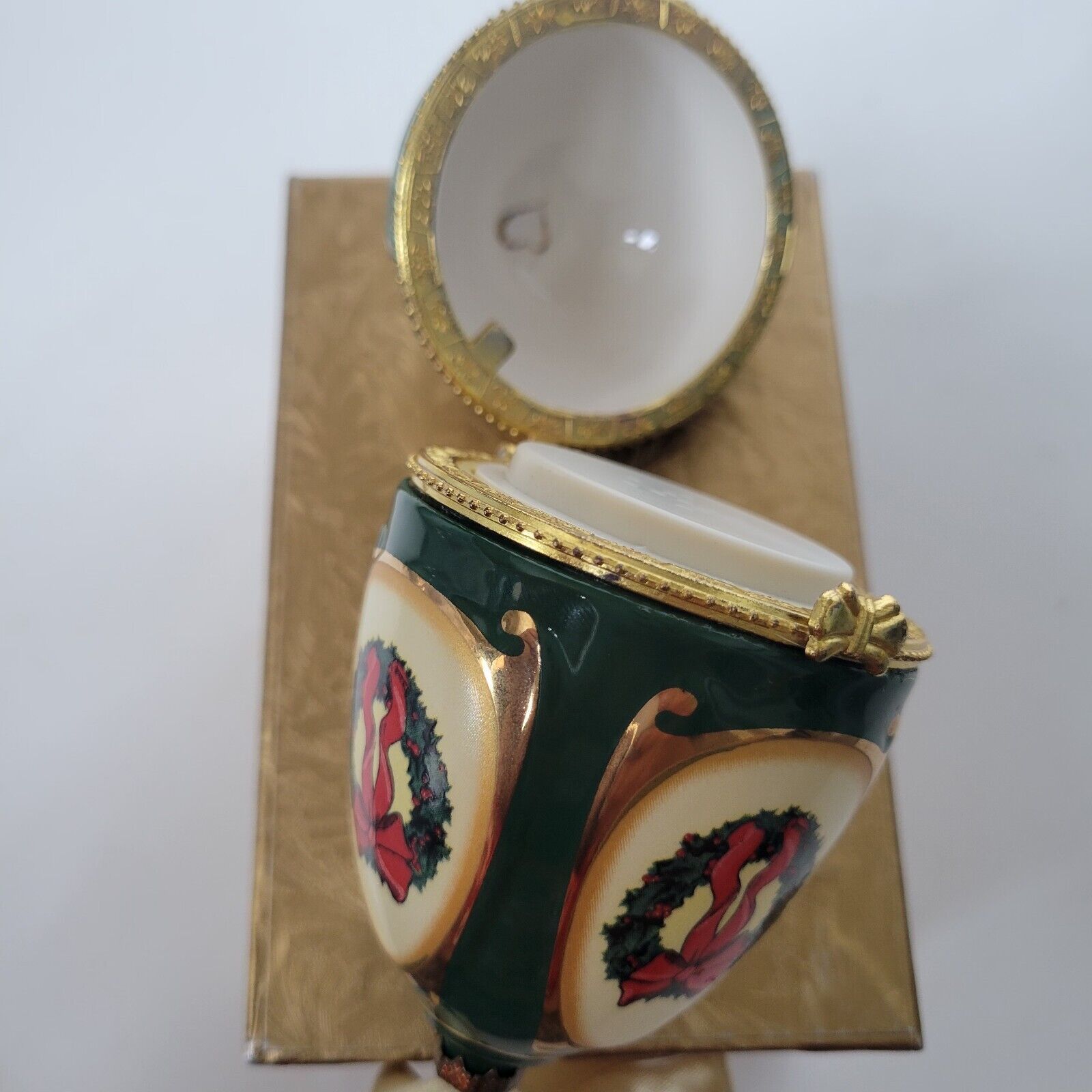 Ceramic Christmas Egg Ornament First Noel Trinket Box Green Goldtone No music