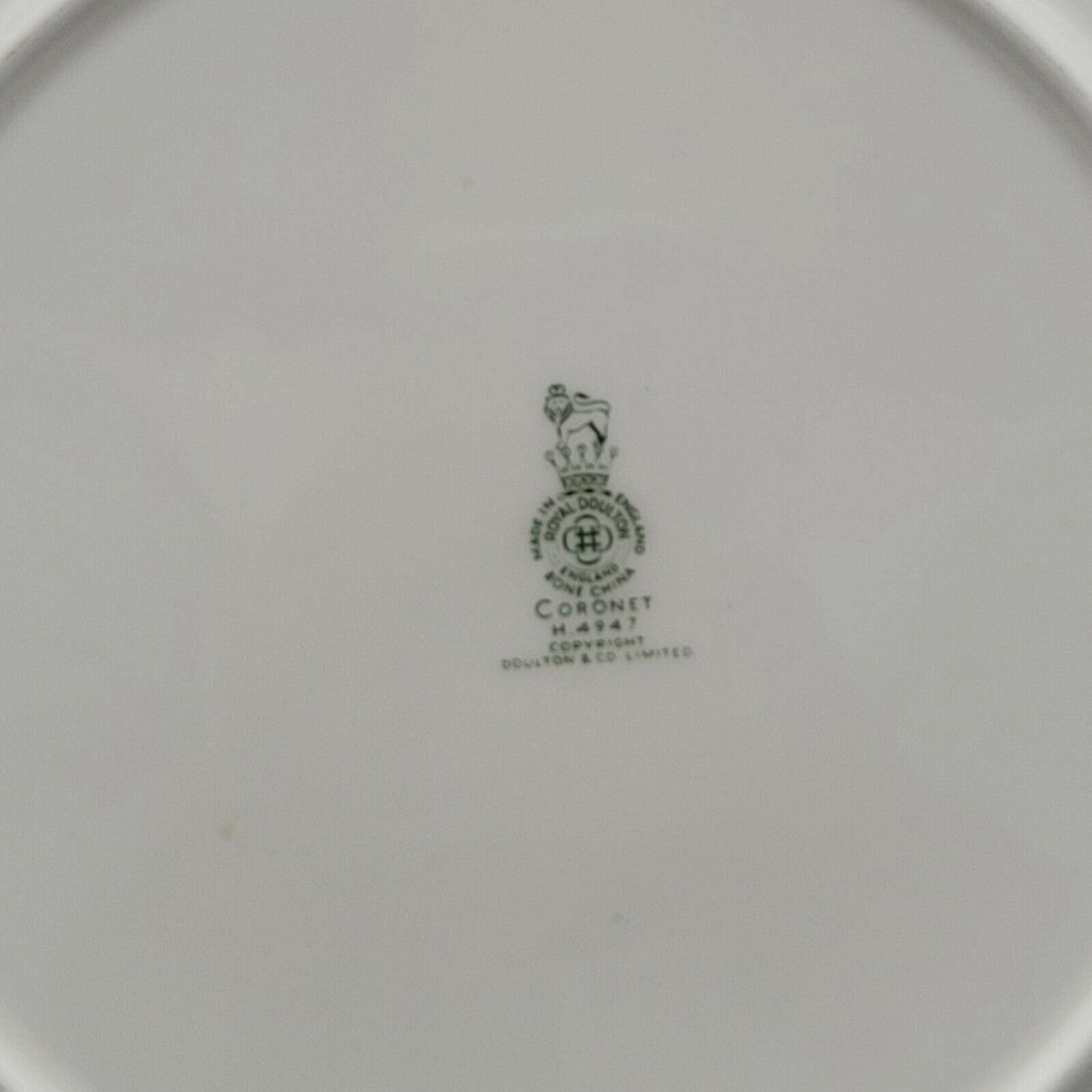 These plates are great for collectors or anyone looking for high-quality dinnerware. The 'Coronet' pattern is timeless and will complement any decor. Each plate is marked with the Royal Doulton stamp, ensuring its authenticity. Impress your guests with these beautiful salad plates.