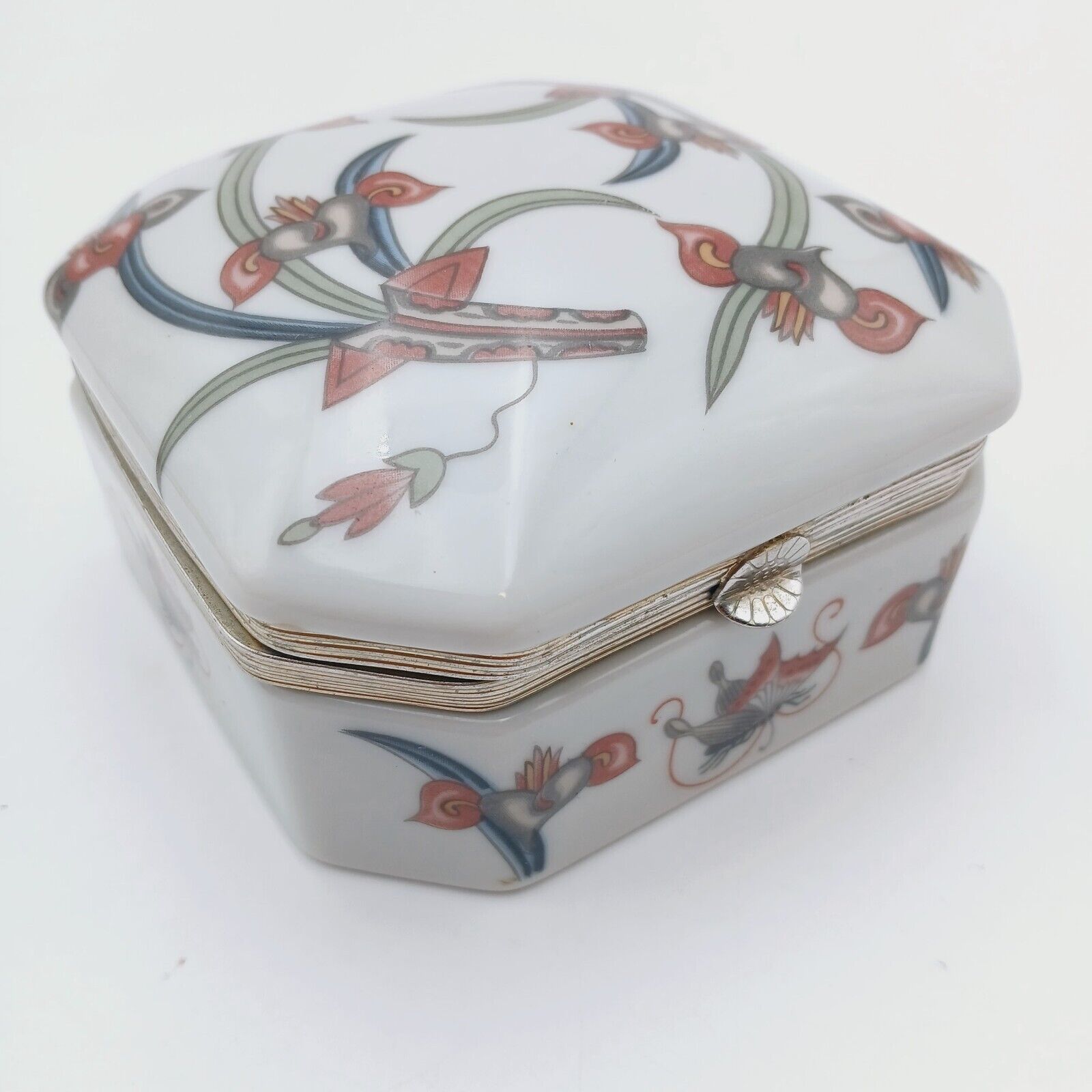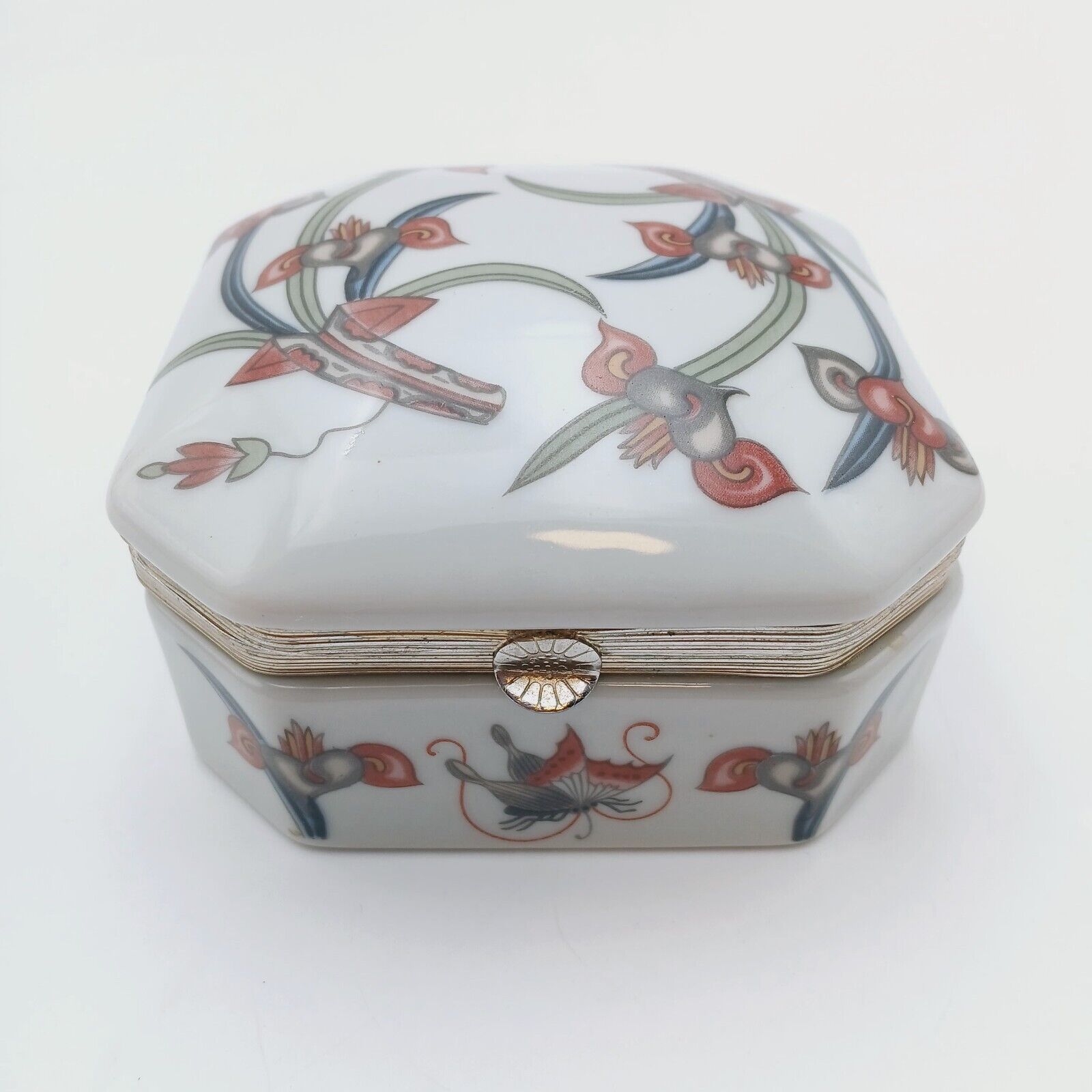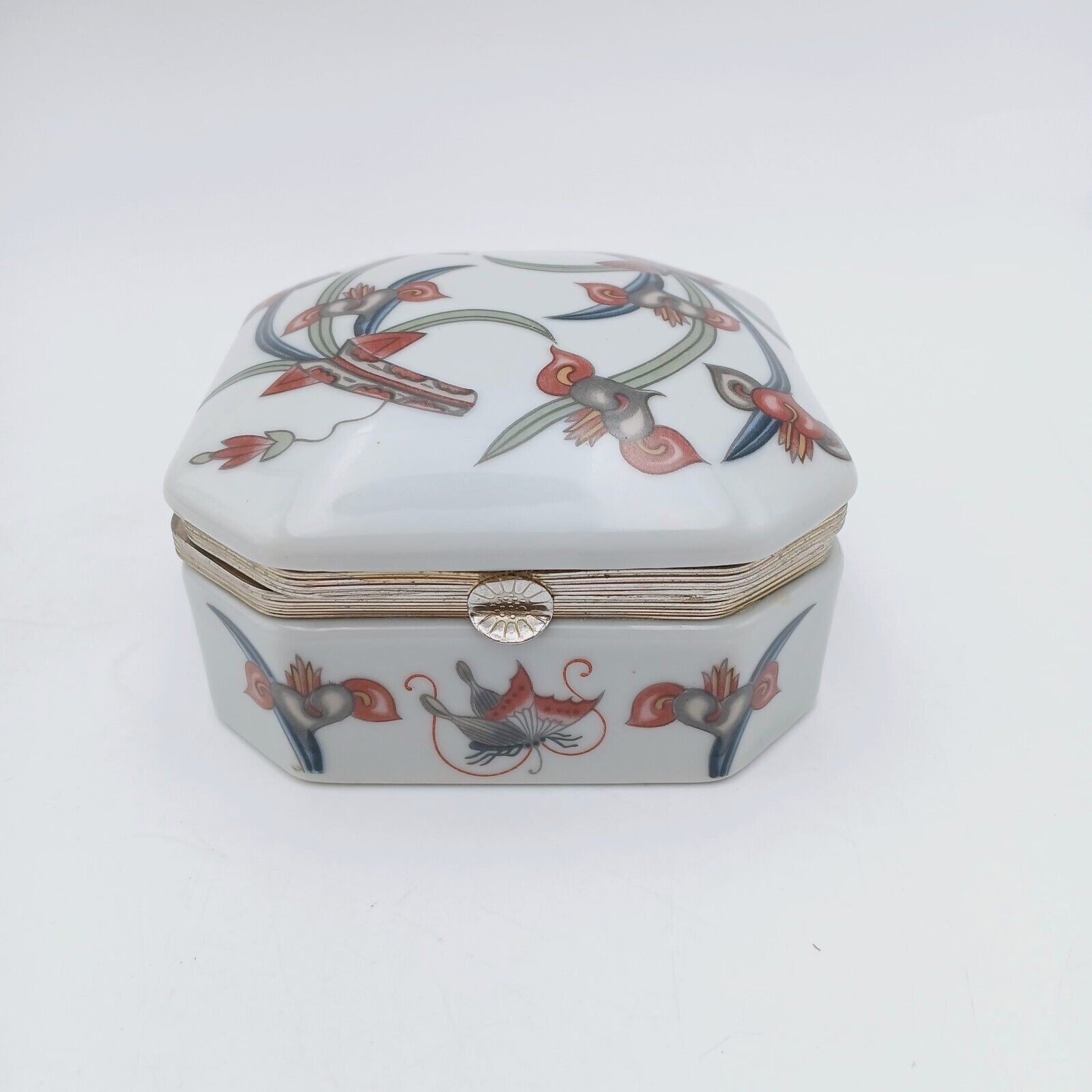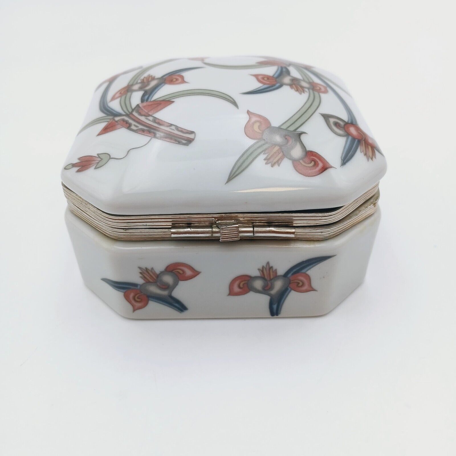 This vintage trinket box from Neiman Marcus is a beautiful addition to any collection. The floral pattern on the square shape features a heart subject, and is made of porcelain and metal. The box is medium-sized with a snap closure.