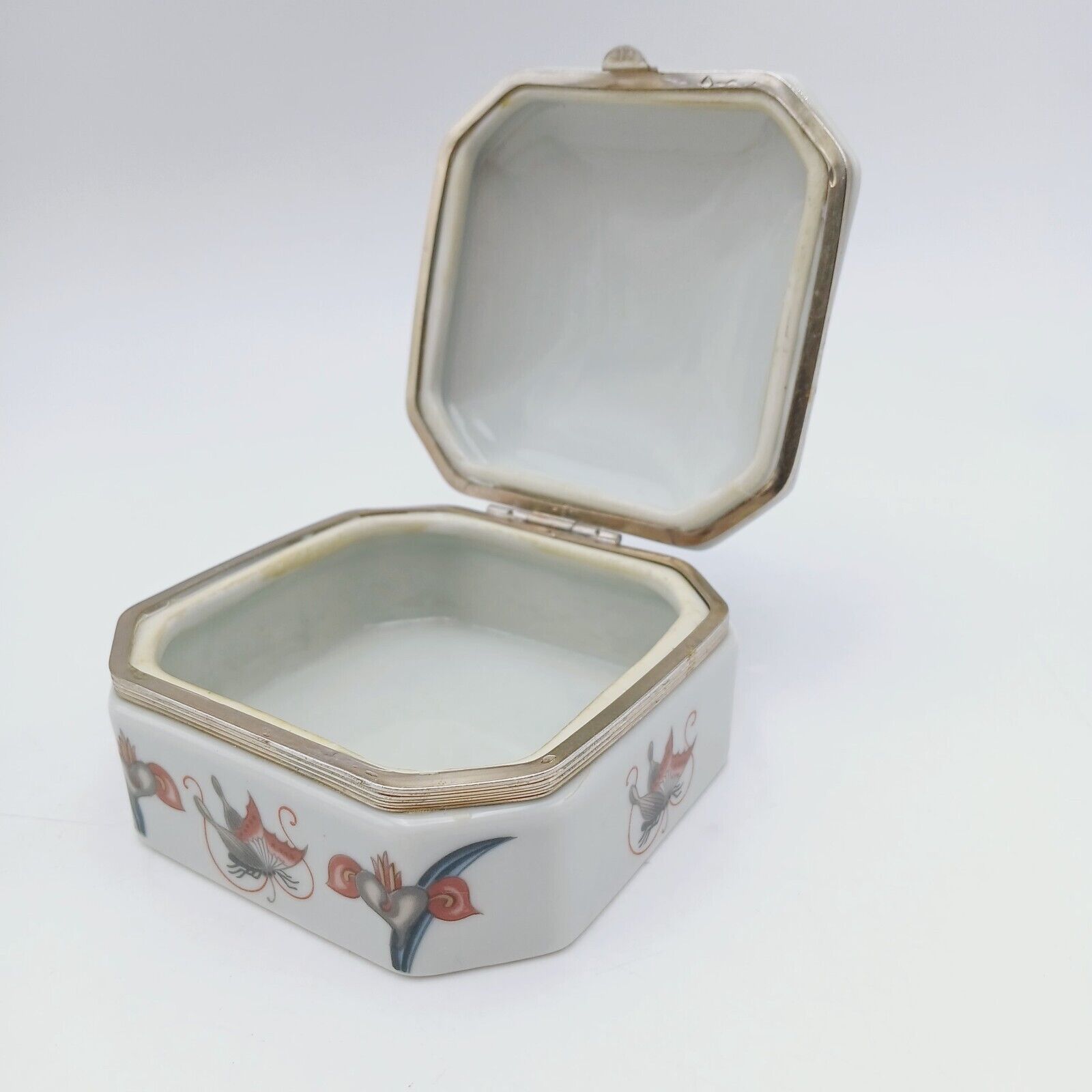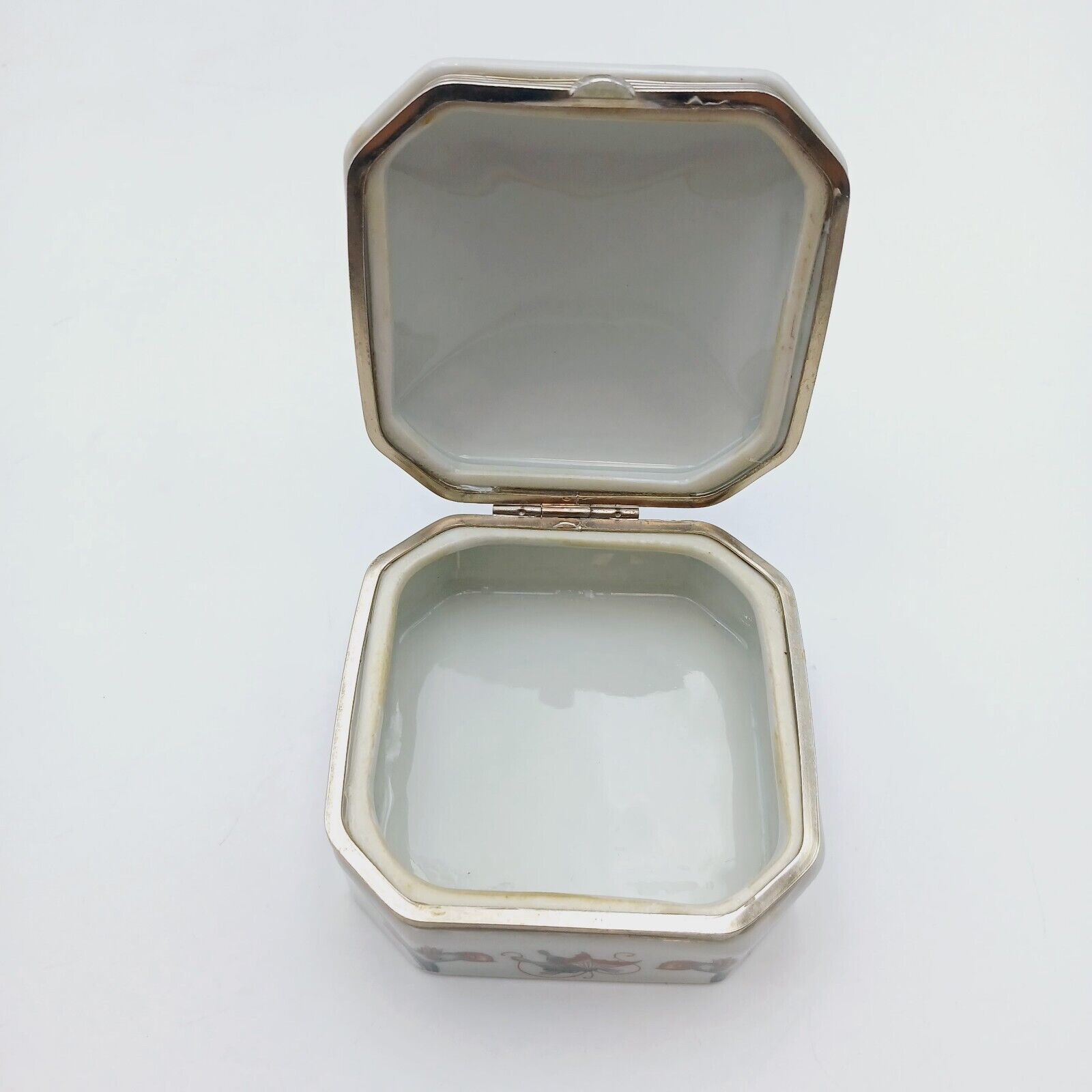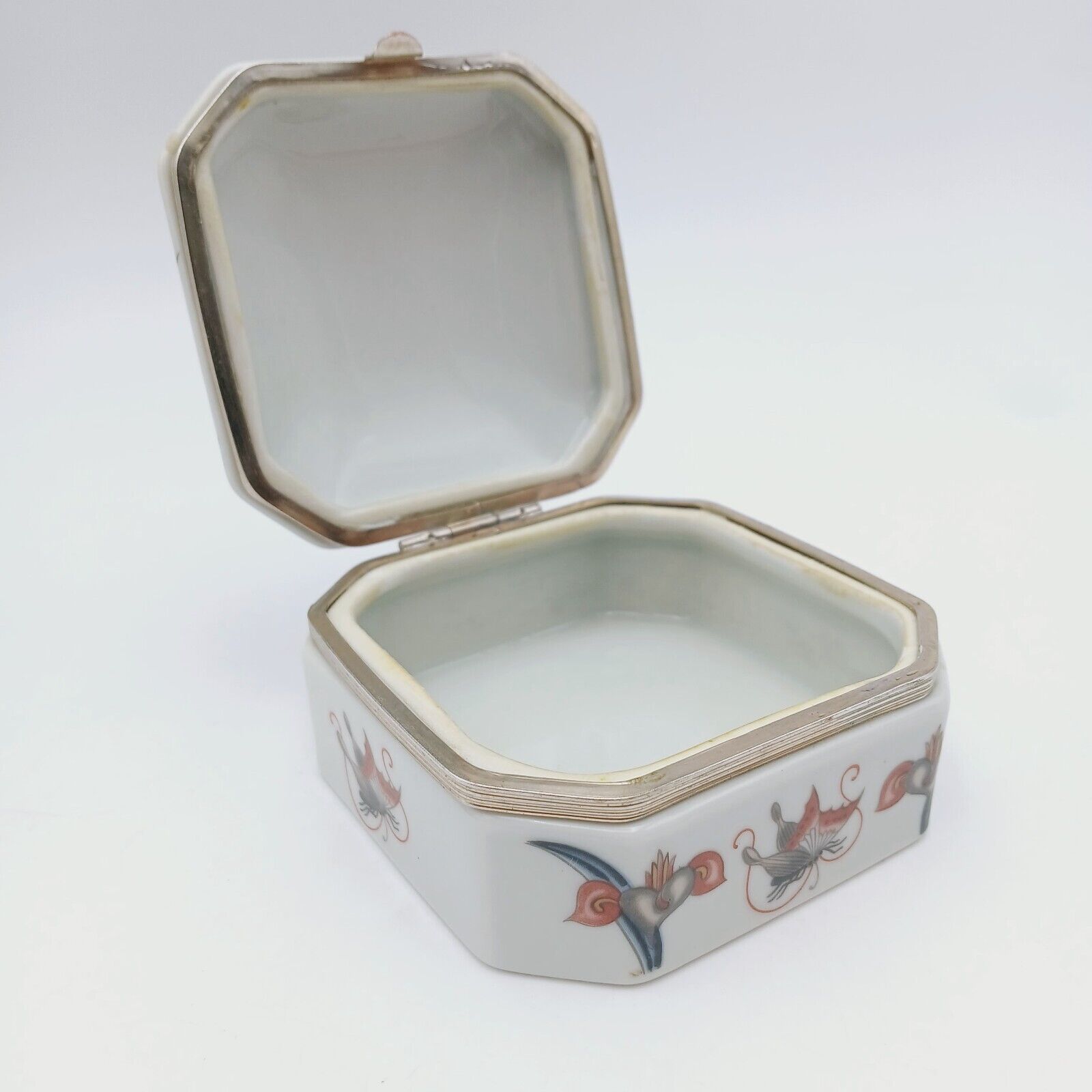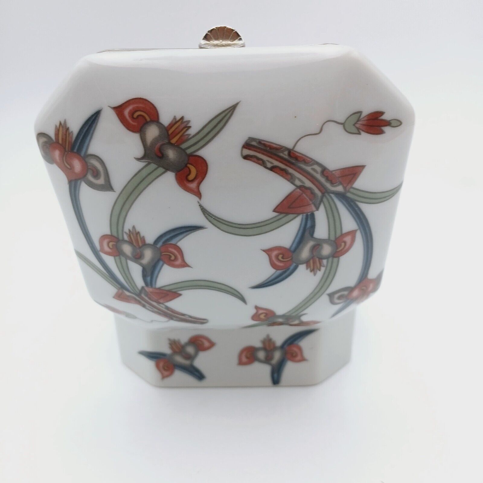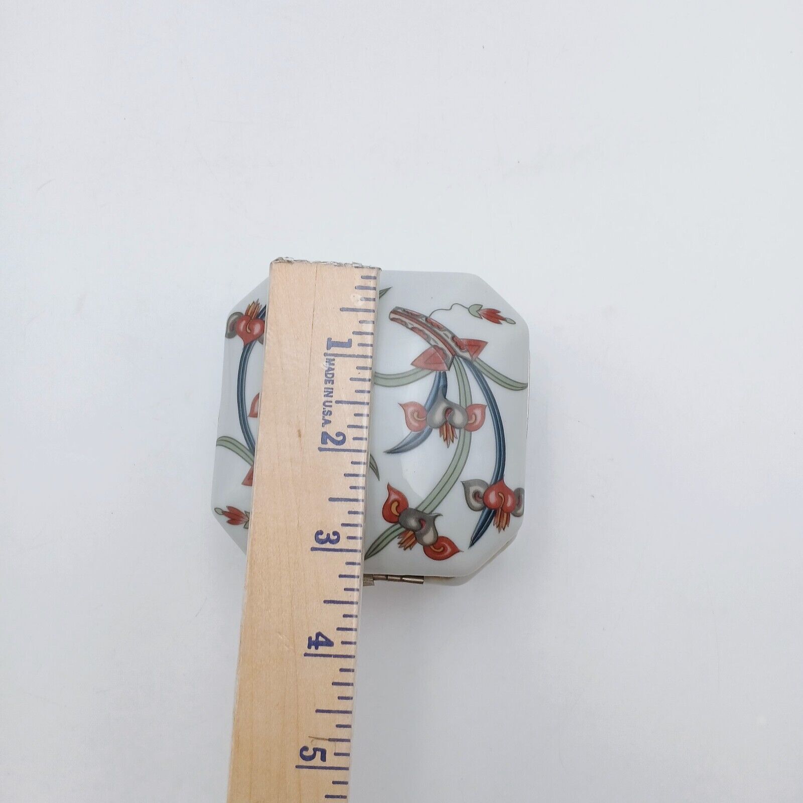 This vintage trinket box from Neiman Marcus is a beautiful addition to any collection. The floral pattern on the square shape features a heart subject, and is made of porcelain and metal. The box is medium-sized with a snap closure.