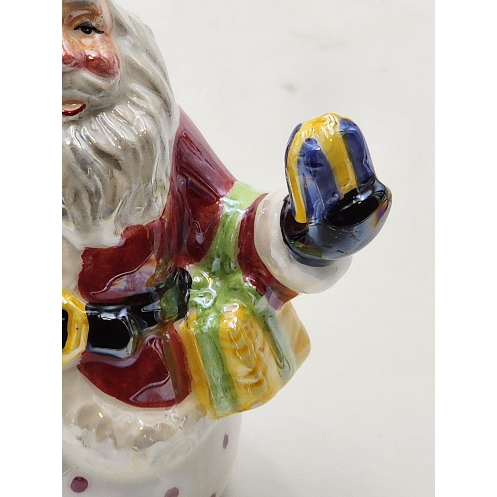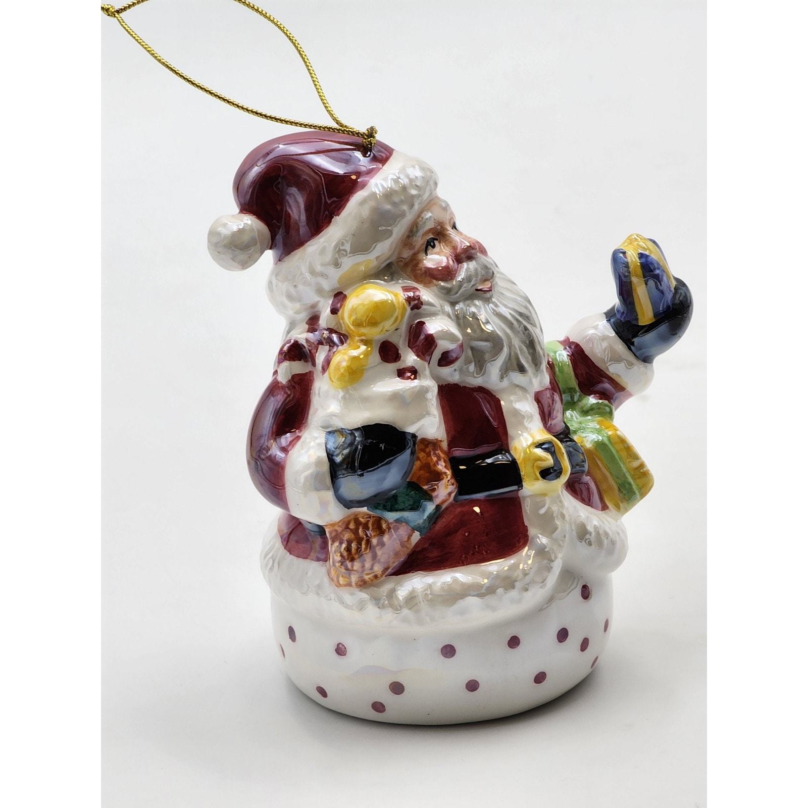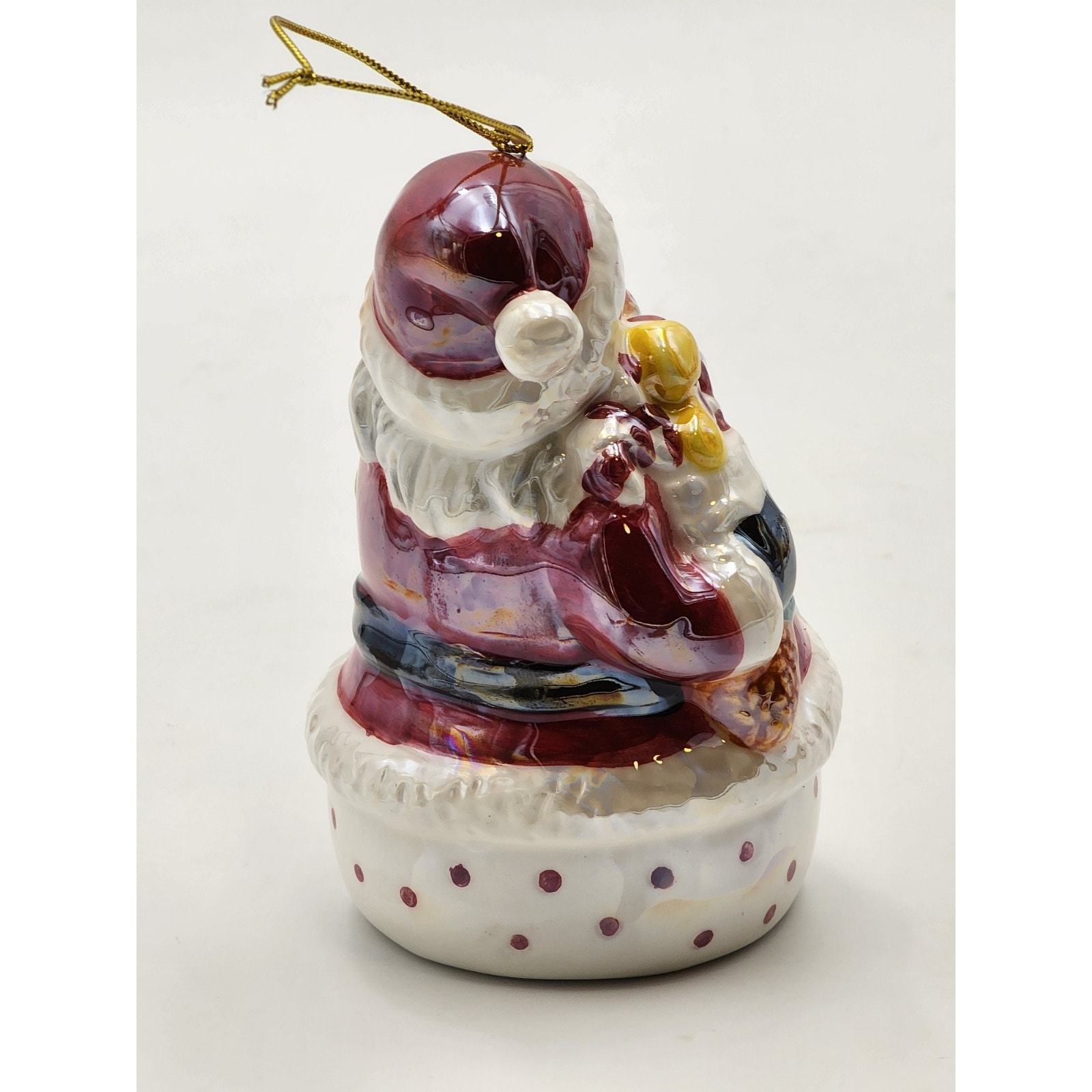 Vtg Iridescent Glazed Ceramic Santa with Presents Christmas Ornament
