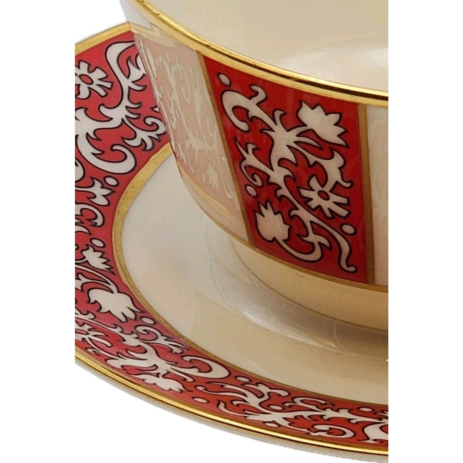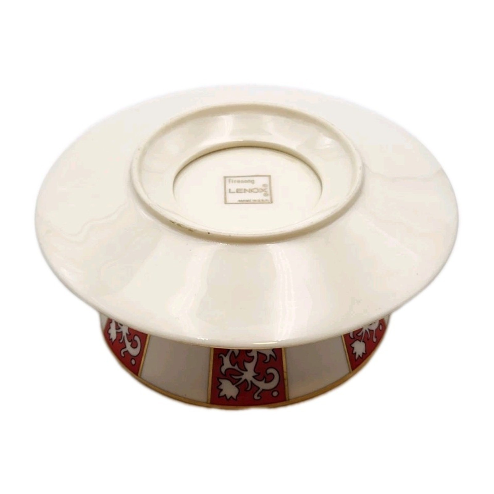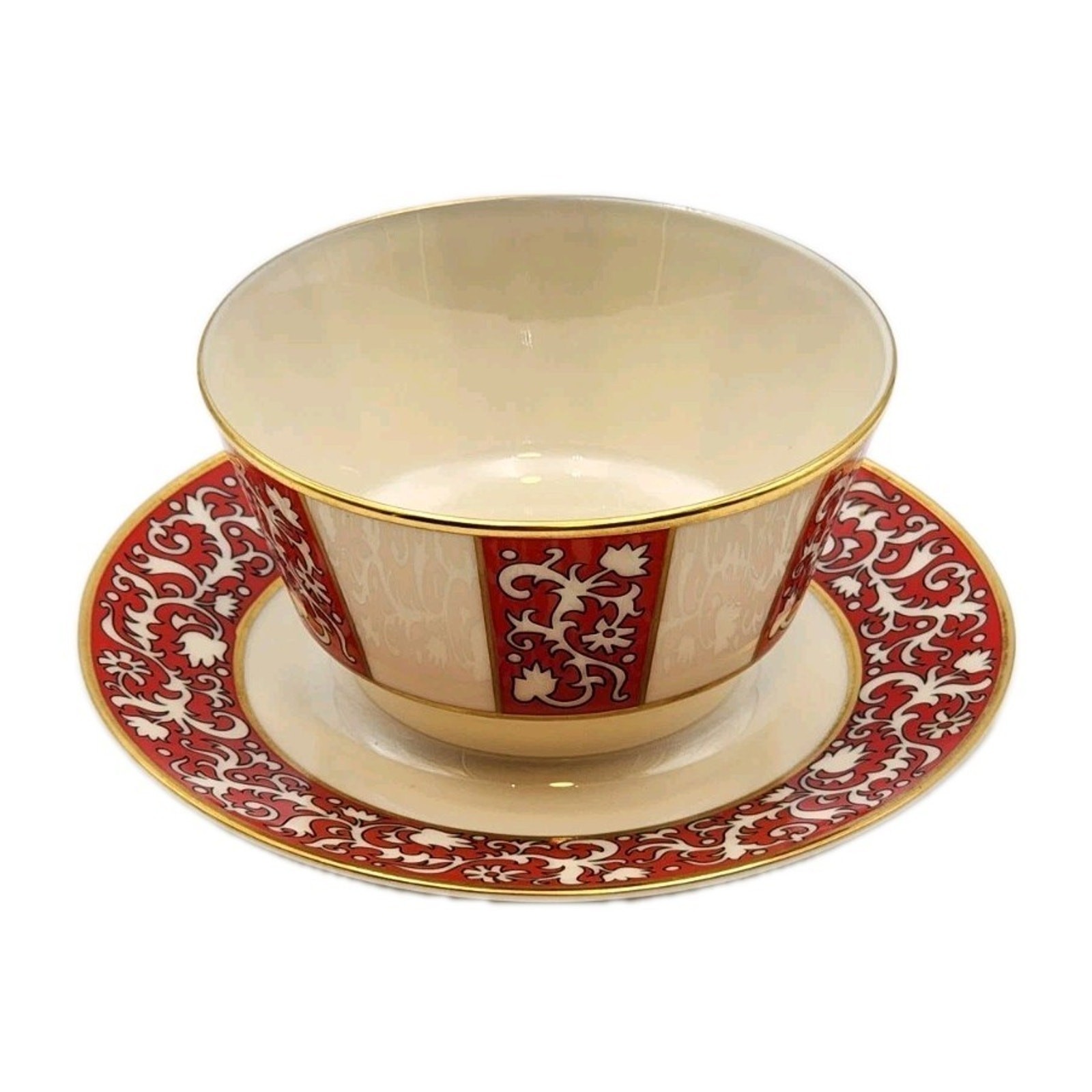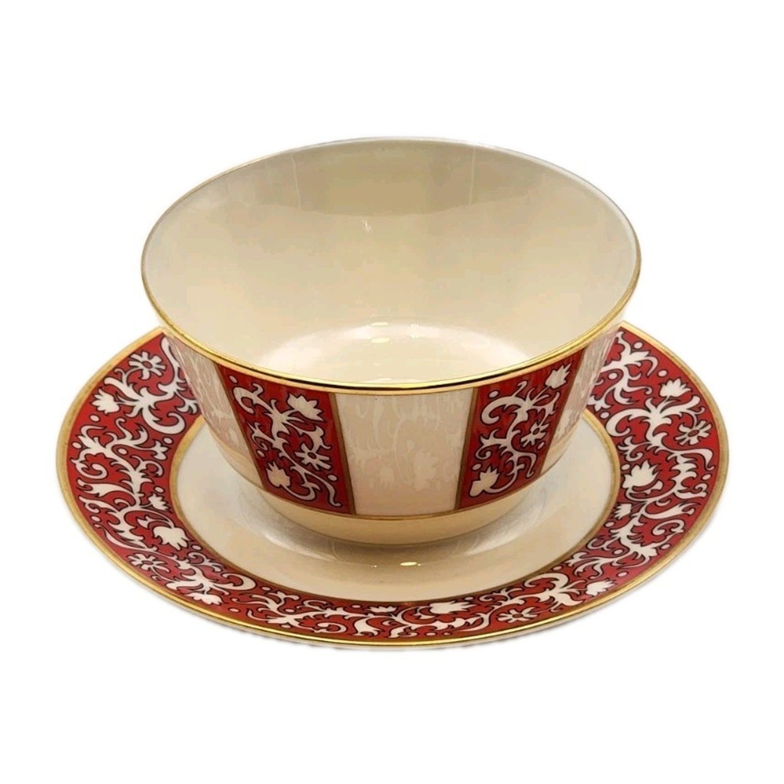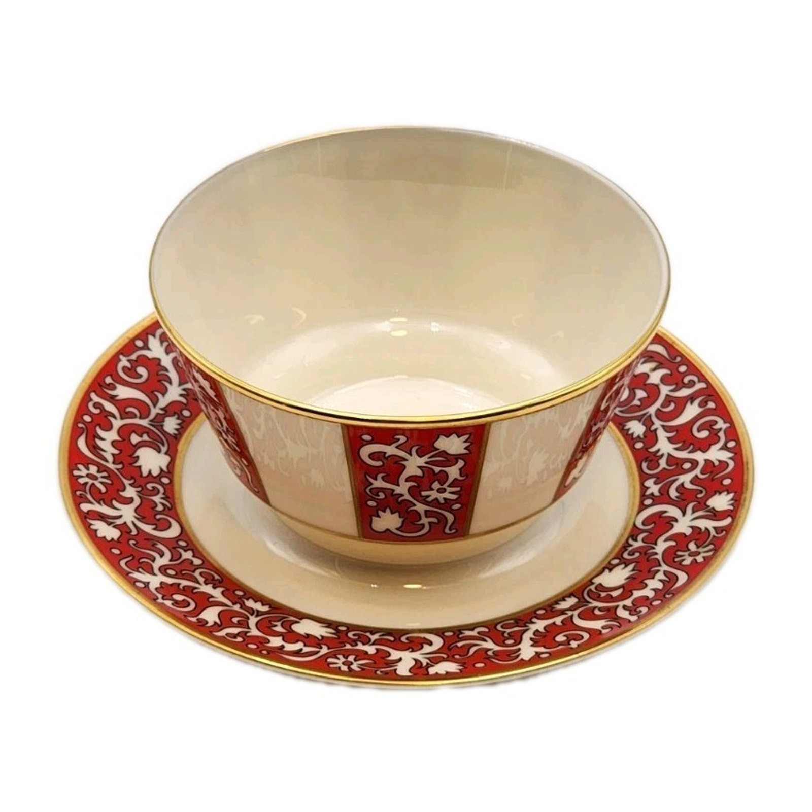 The Lenox Firesong Gravy Boat with Attached Underplate is a vintage piece made in the USA. It features a red FIRESONG pattern, crafted from high-quality bone china materials. This elegant gravy boat adds a touch of sophistication to any dining table, perfect for serving gravy or sauce in style. The attached underplate ensures easy transfer and catching of spills, making it a practical and stylish addition to your tableware collection.
