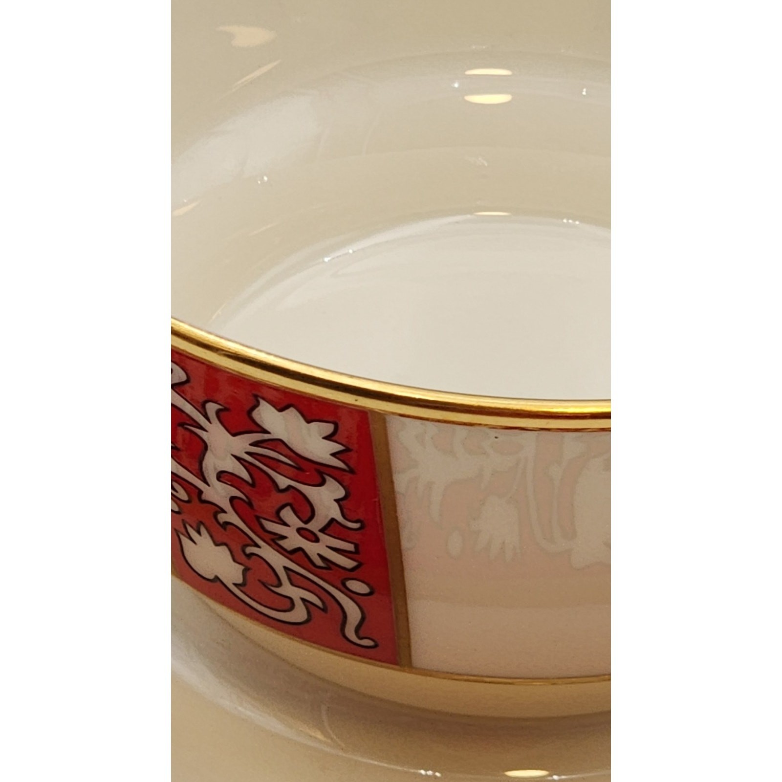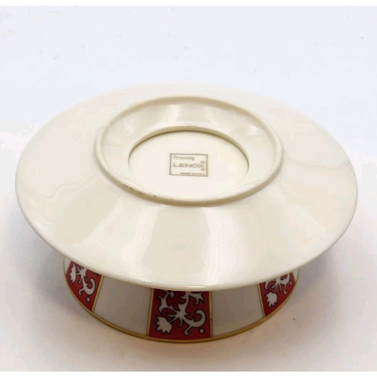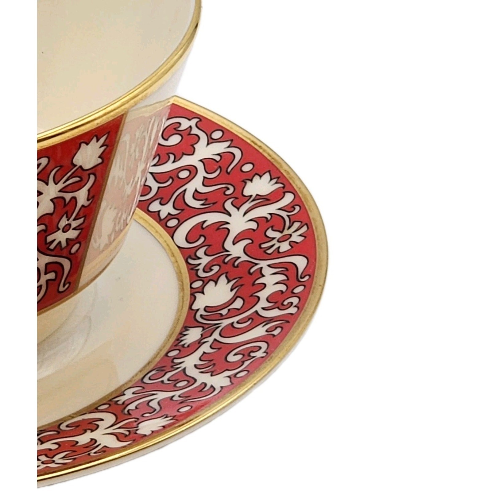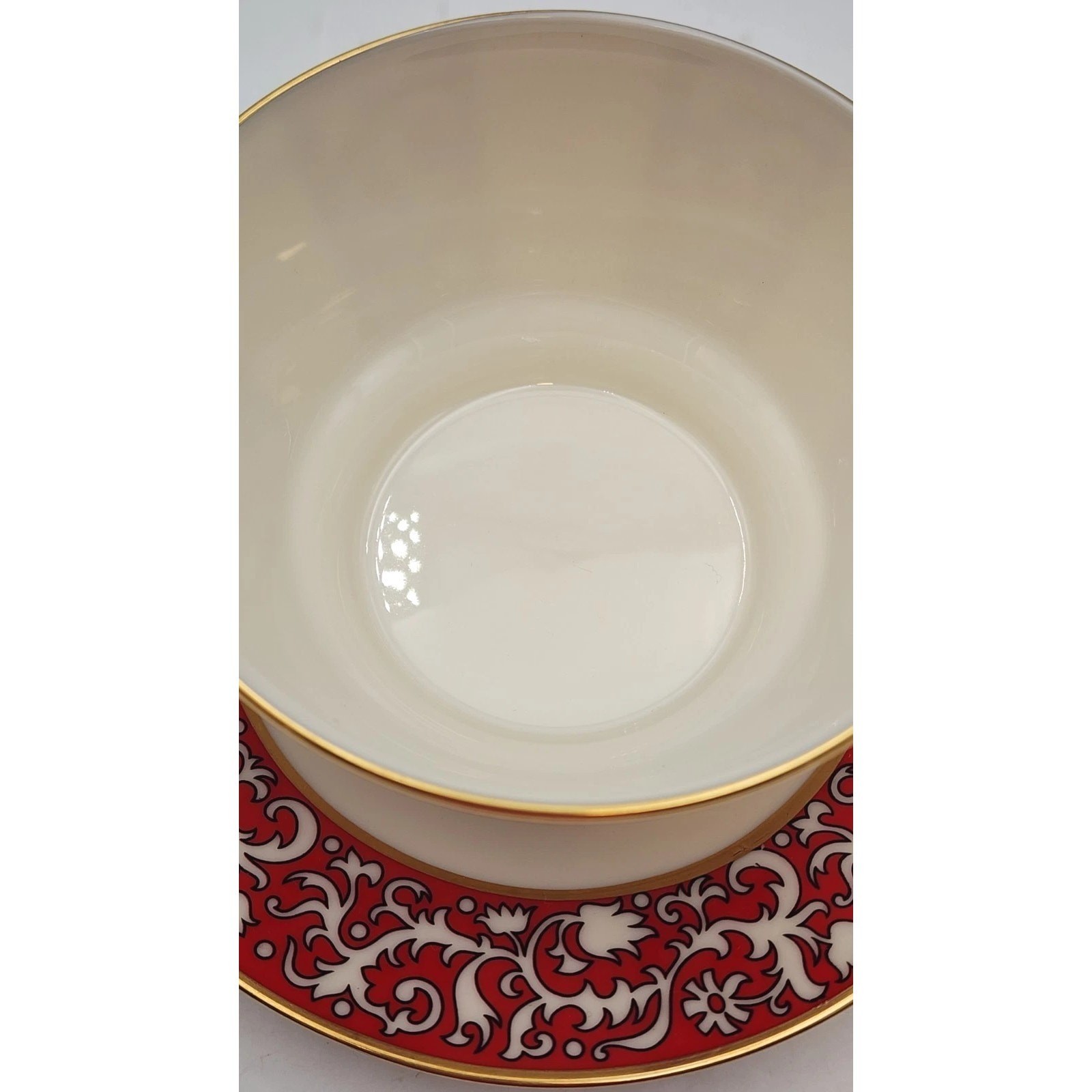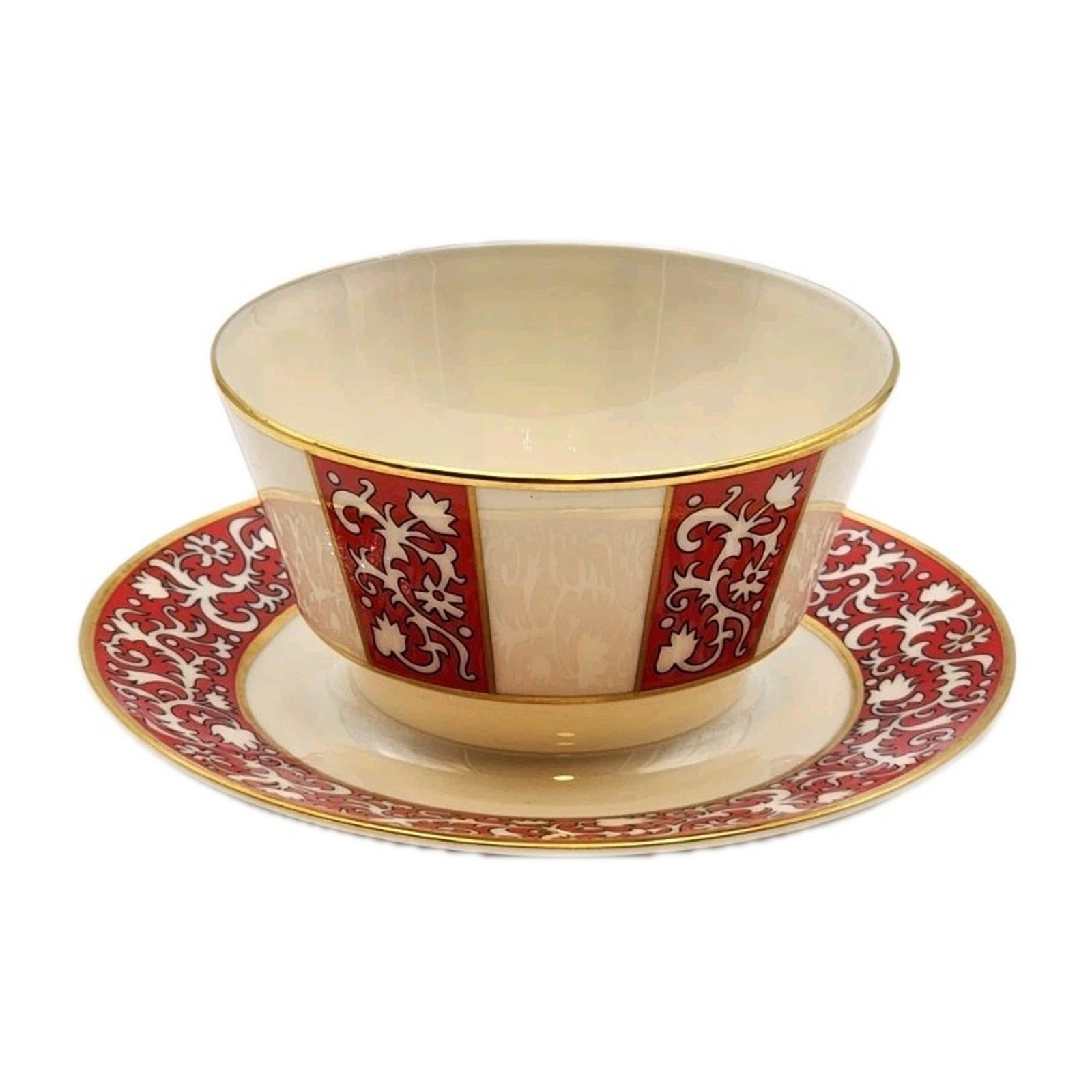 The Lenox Firesong Gravy Boat with Attached Underplate is a vintage piece made in the USA. It features a red FIRESONG pattern, crafted from high-quality bone china materials. This elegant gravy boat adds a touch of sophistication to any dining table, perfect for serving gravy or sauce in style. The attached underplate ensures easy transfer and catching of spills, making it a practical and stylish addition to your tableware collection.