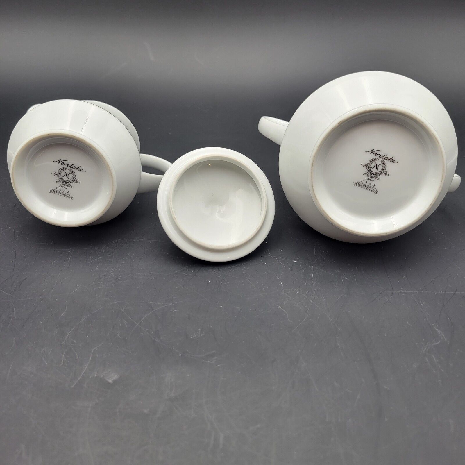 This Noritake Marywood four-piece set includes a creamer and sugar bowl, both featuring platinum trim. The set is made of high-quality bone china and has a beautiful multicolor pattern that is perfect for all occasions. The set is an original and comes with a printed backstamp.