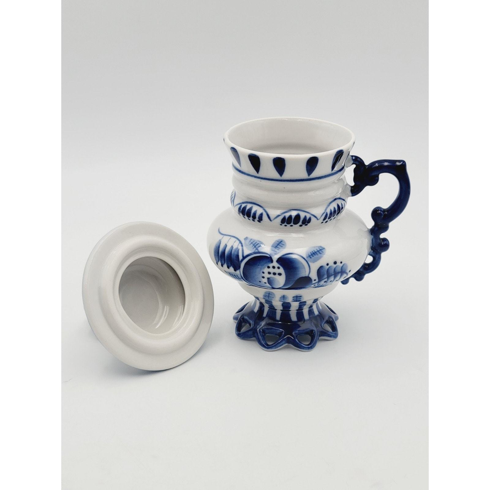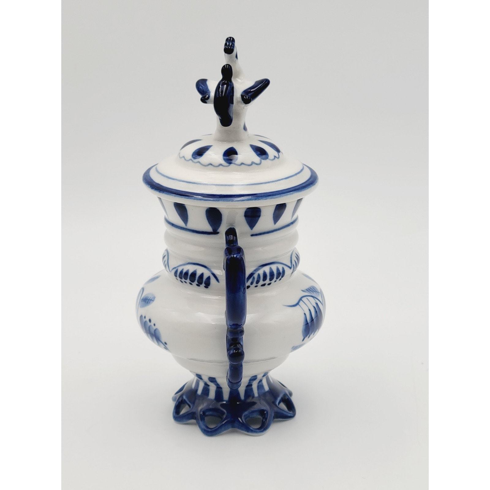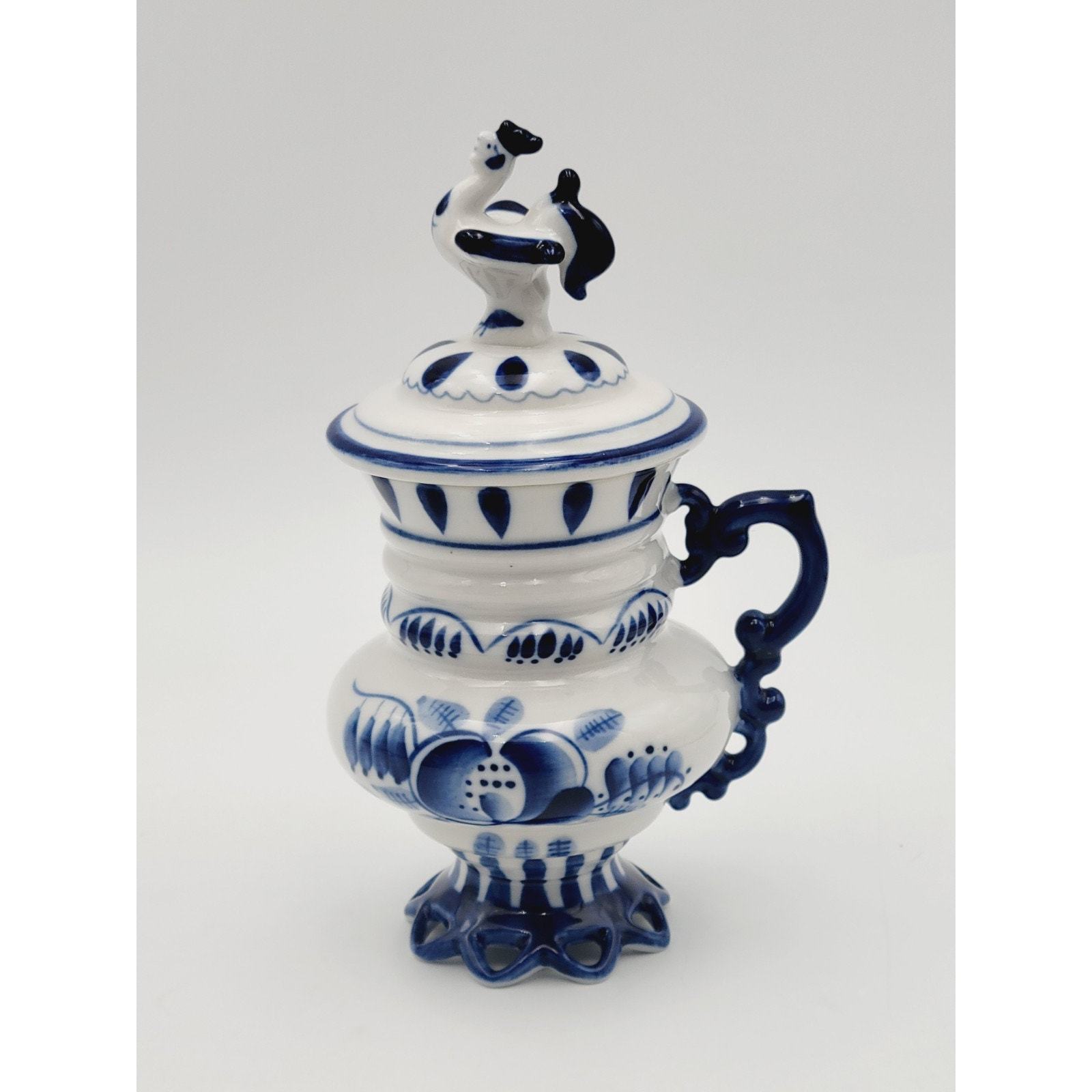 This vintage Gzhel Russian porcelain goblet mug stands at 7 inches tall and features a classic blue and white color scheme. Handmade in the Russian Federation, this unique piece showcases traditional Russian culture through its intricate design. The craftsmanship of this item reflects the artistry and heritage of Gzhel porcelain, making it a charming collectible for those interested in Russian culture and craftsmanship.