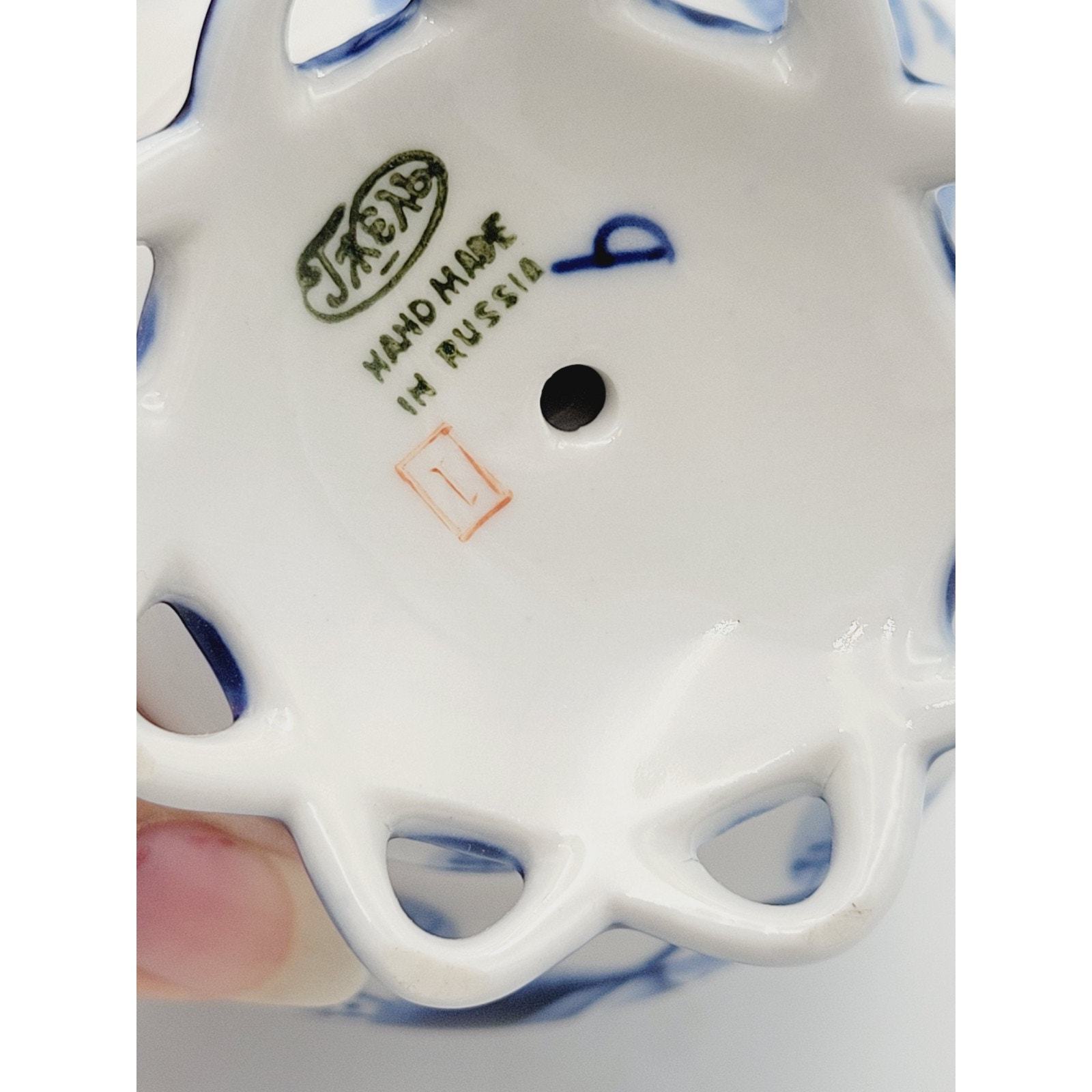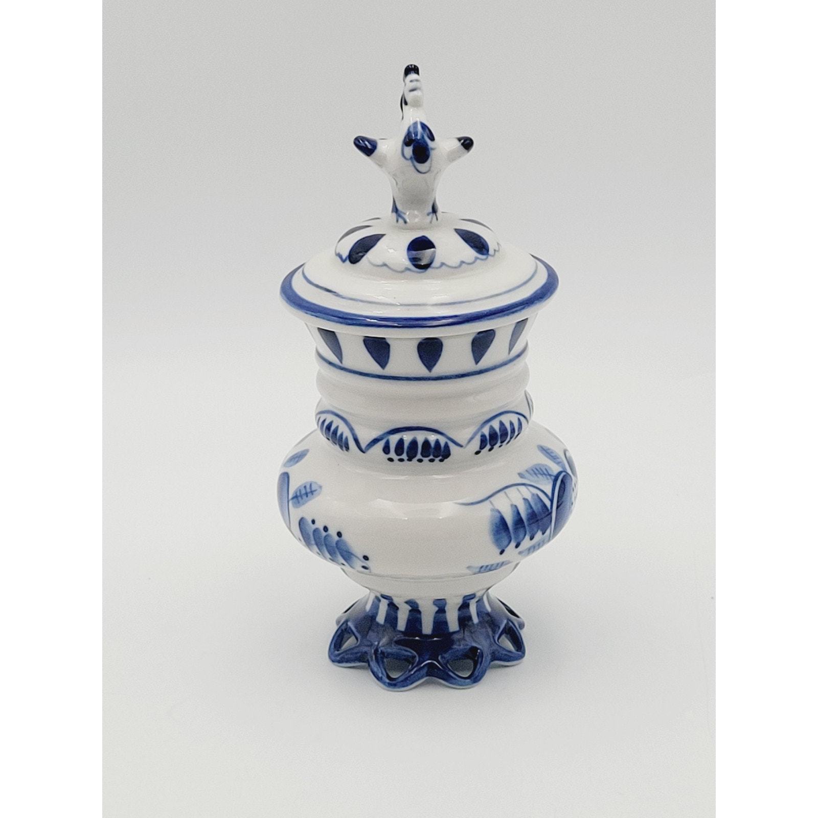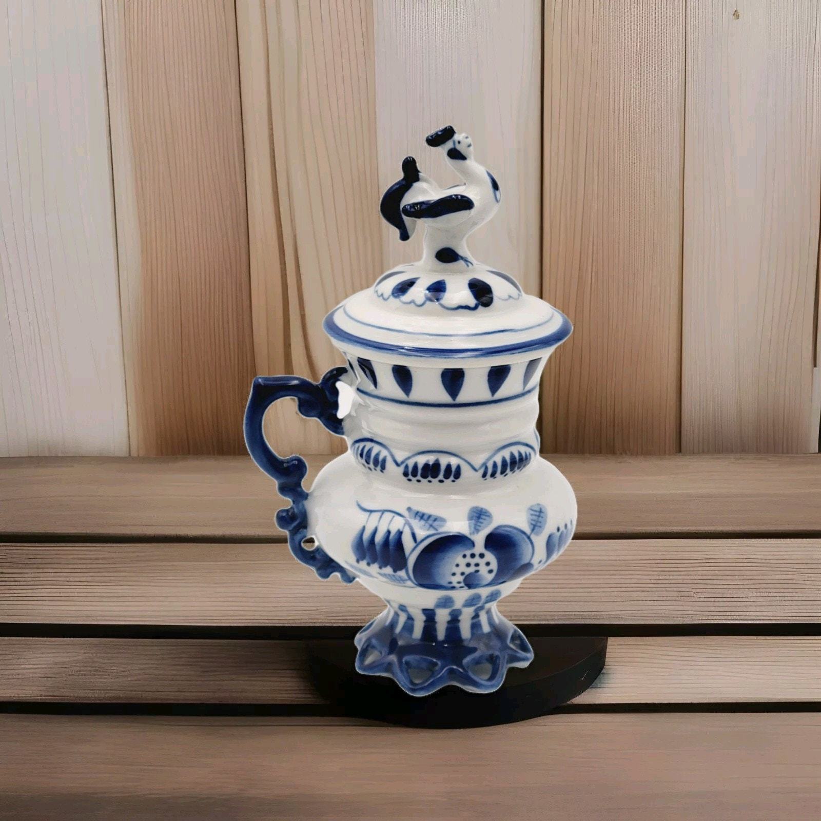 This vintage Gzhel Russian porcelain goblet mug stands at 7 inches tall and features a classic blue and white color scheme. Handmade in the Russian Federation, this unique piece showcases traditional Russian culture through its intricate design. The craftsmanship of this item reflects the artistry and heritage of Gzhel porcelain, making it a charming collectible for those interested in Russian culture and craftsmanship.