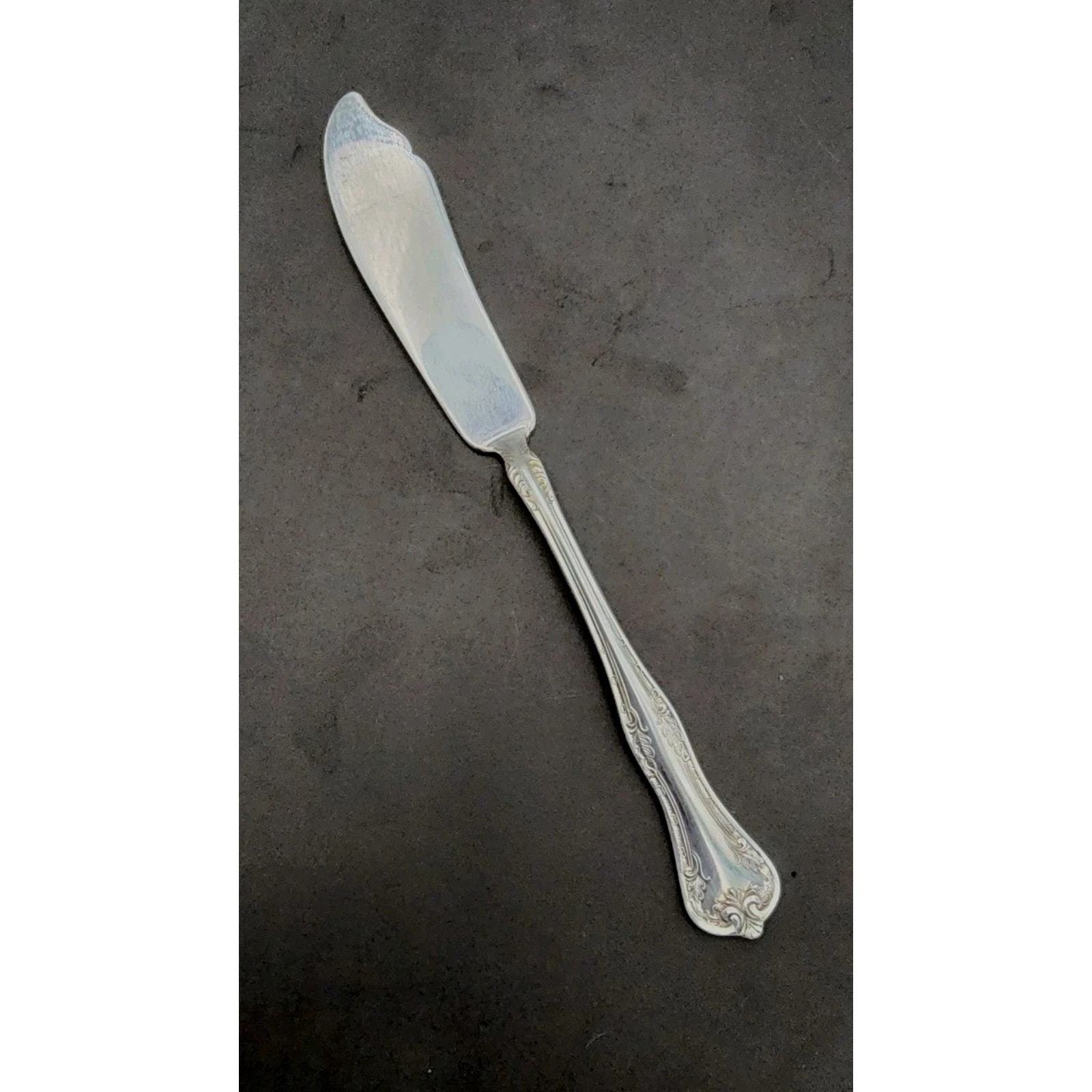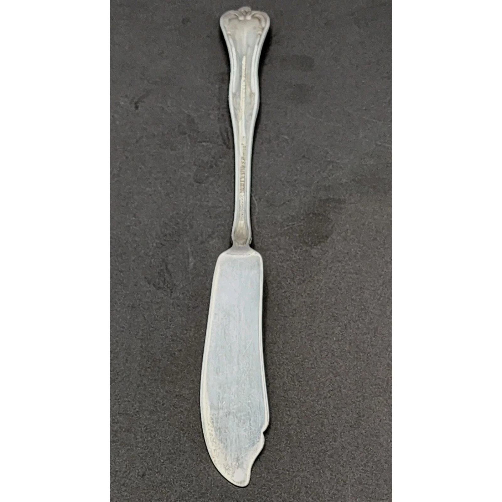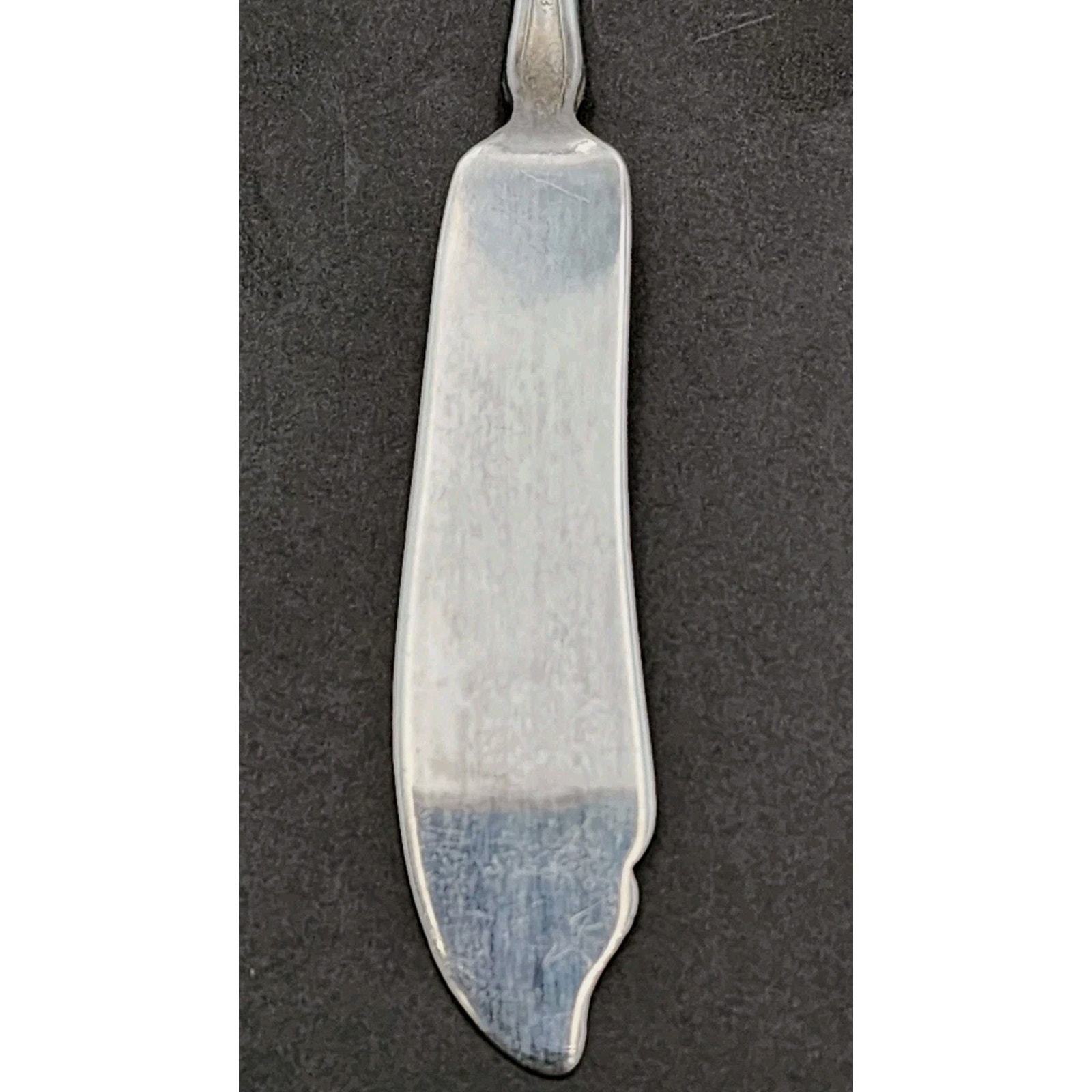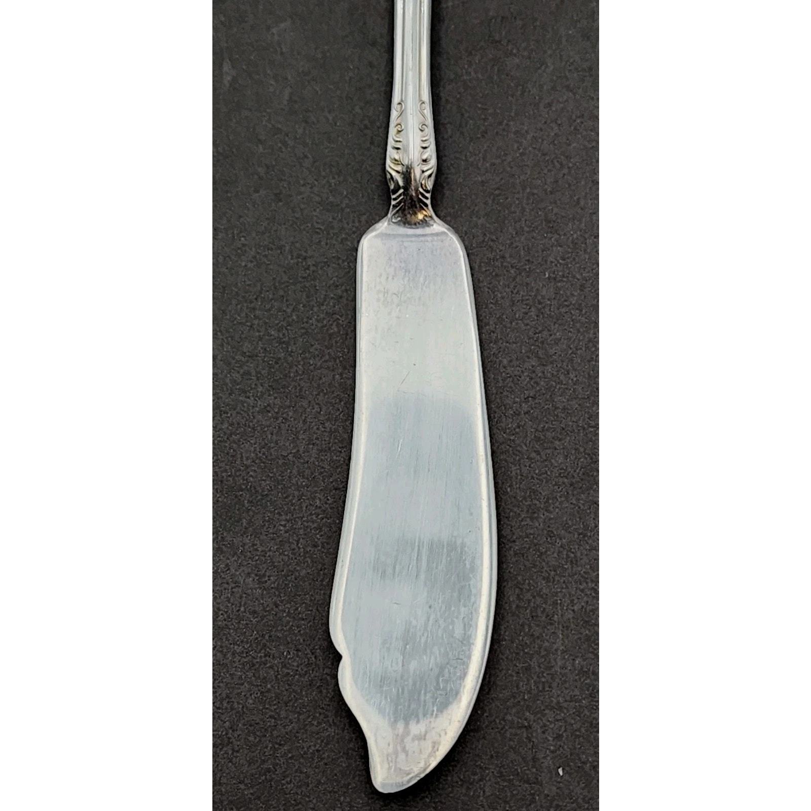 The butter knife features the fine attention to detail and superior quality that is characteristic of pre-war silverware. Its intricate pattern and gleaming finish reflect the high craftsmanship of the era, making it a fine addition to any collection of antique silver. Ideal for those who appreciate the historical beauty of silver tableware, this piece is a tangible connection to the past and a testament to the enduring style of National Silver Co. craftsmanship.