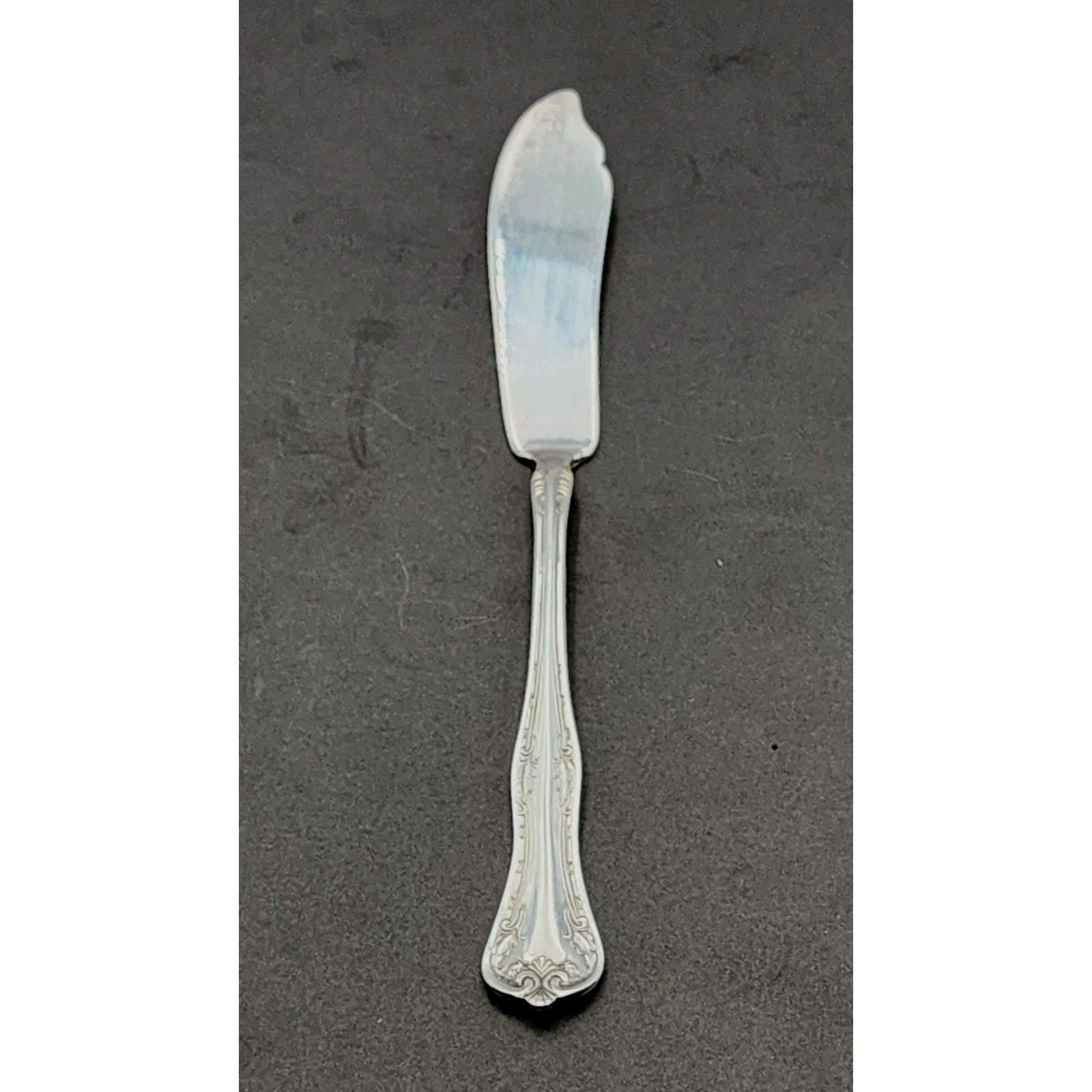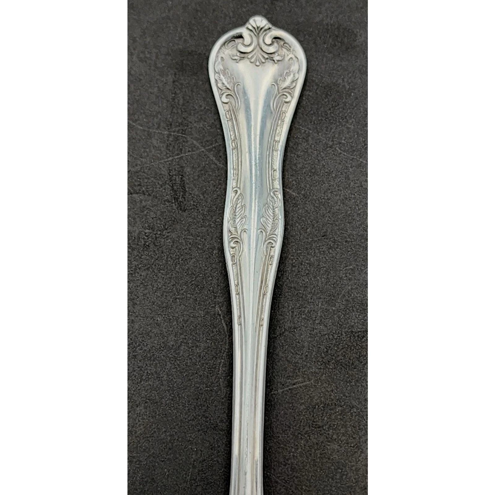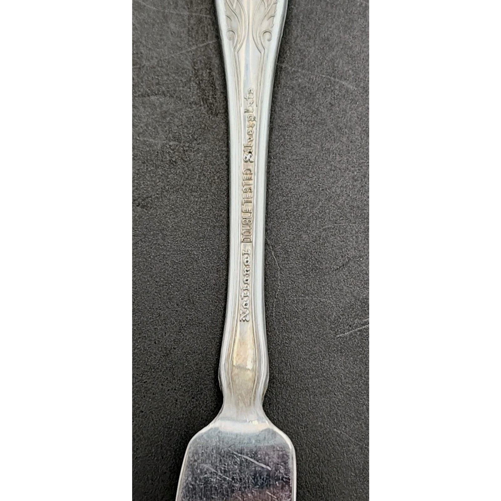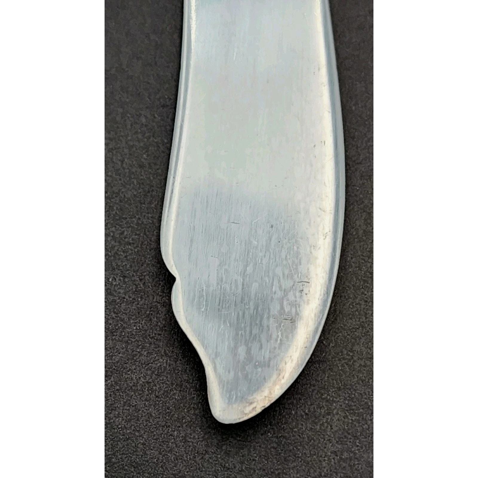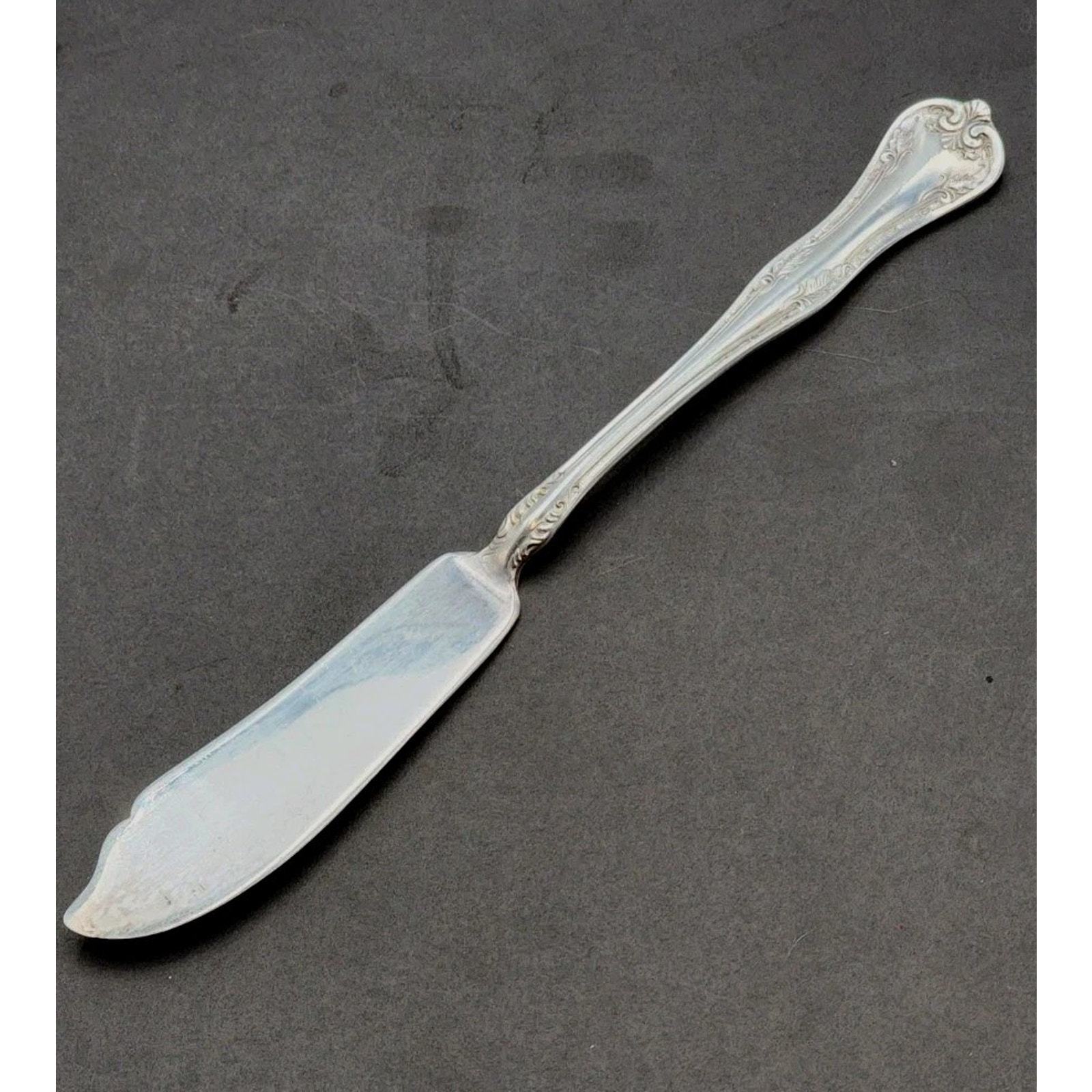 The butter knife features the fine attention to detail and superior quality that is characteristic of pre-war silverware. Its intricate pattern and gleaming finish reflect the high craftsmanship of the era, making it a fine addition to any collection of antique silver. Ideal for those who appreciate the historical beauty of silver tableware, this piece is a tangible connection to the past and a testament to the enduring style of National Silver Co. craftsmanship.