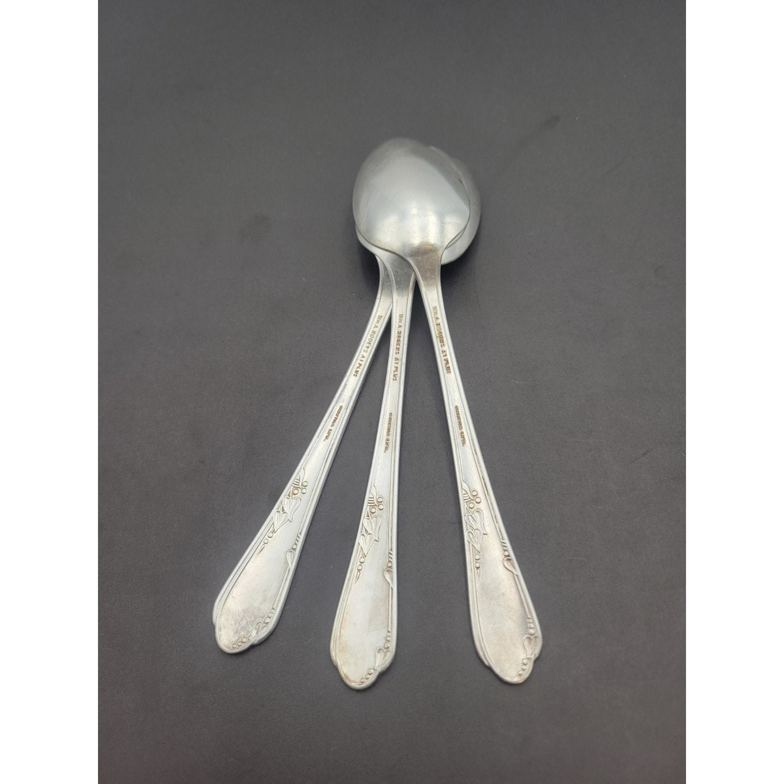 Add this beautiful set of three oval spoons from Wm. Rogers A1+ Oneida Ltd. to your collection today! These silverplated spoons were manufactured in the United States in 1936 and feature the Meadowbrook Heather design. Perfect for any kitchen or collection, these spoons are sure to impress. The set includes three spoons, each with a silverplated handle and a silver color. Don't miss out on this vintage set!