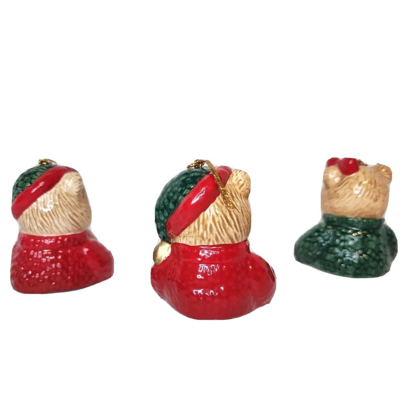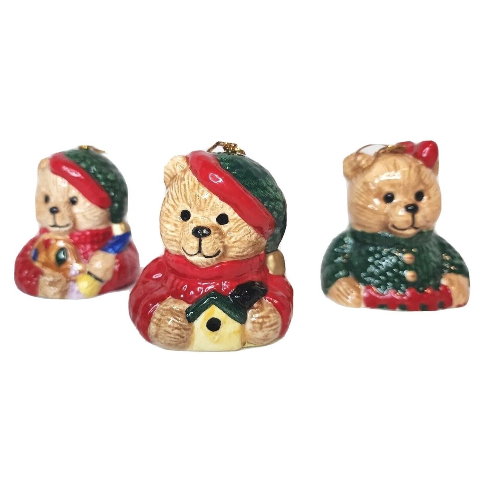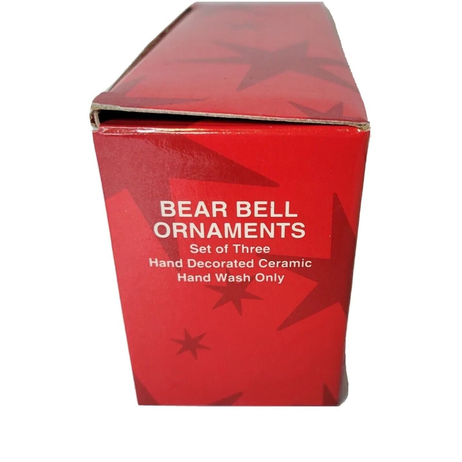 1996 Vintage Christmas Bear Bell Ornaments Set Of 3 Hand Decorated Ceramic Boxed.