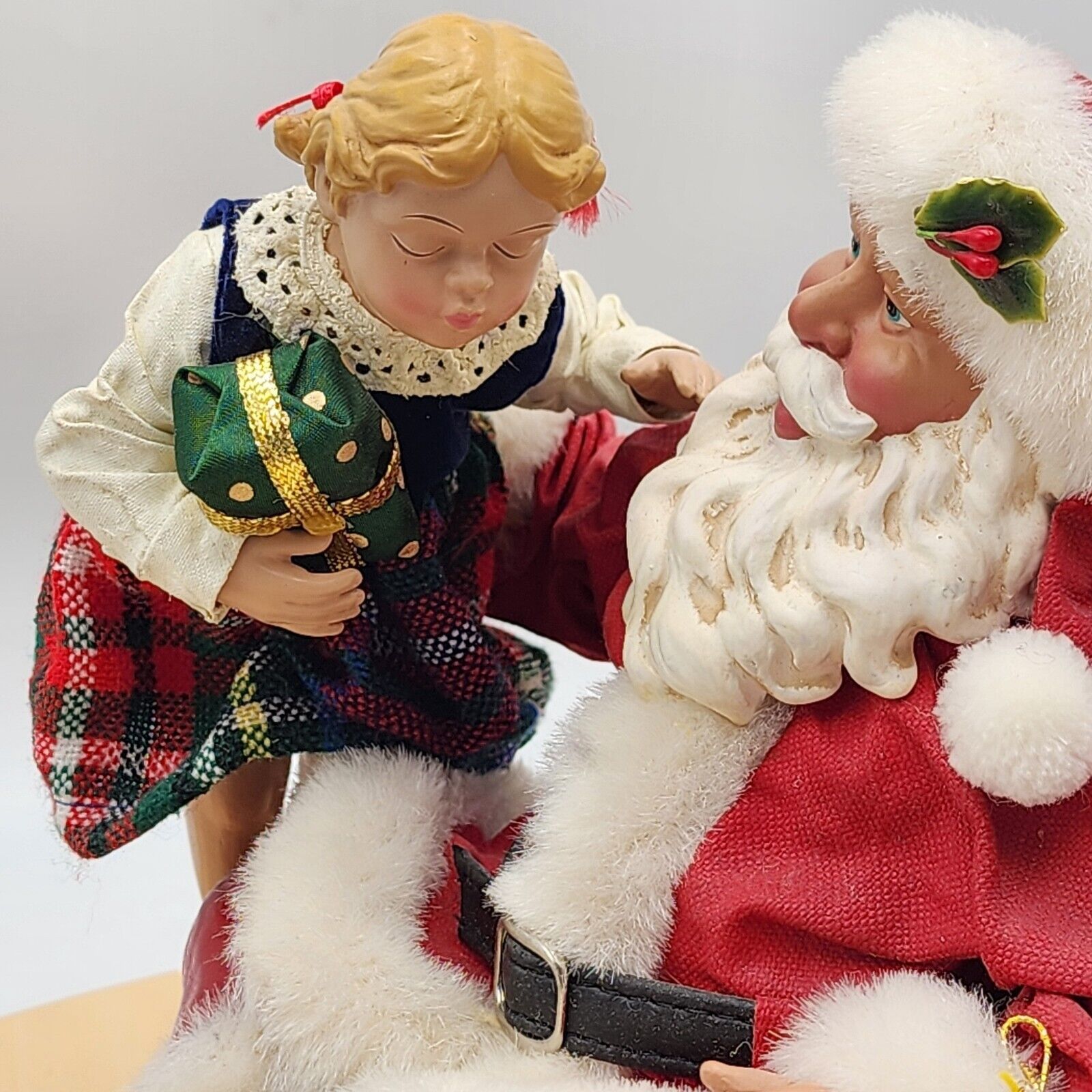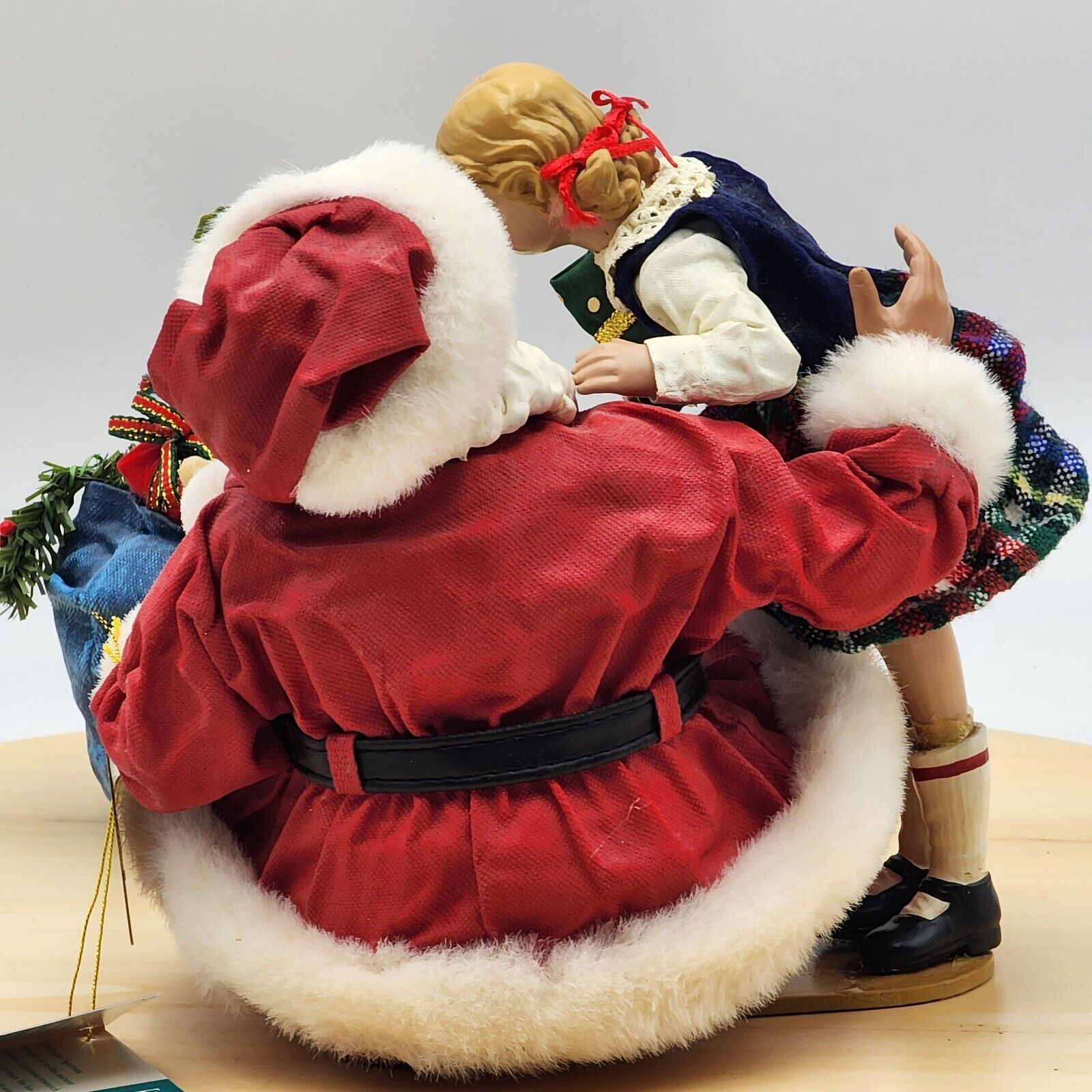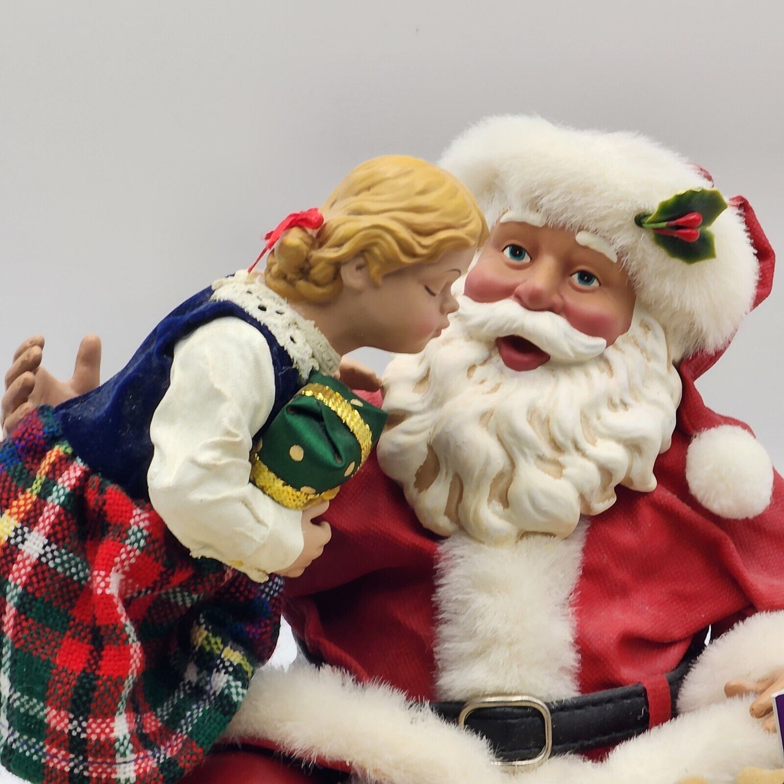 This Clothtique figurine is a must-have for any Christmas collector. It features a sweet girl kissing Santa Claus, with a musical tune playing in the background. The figurine is unboxed and comes with original tags, making it a great addition to any collection.