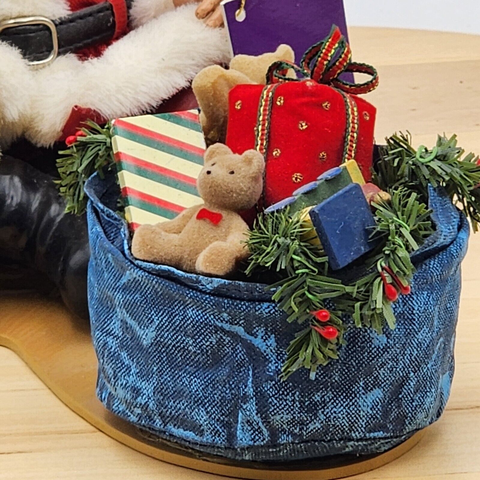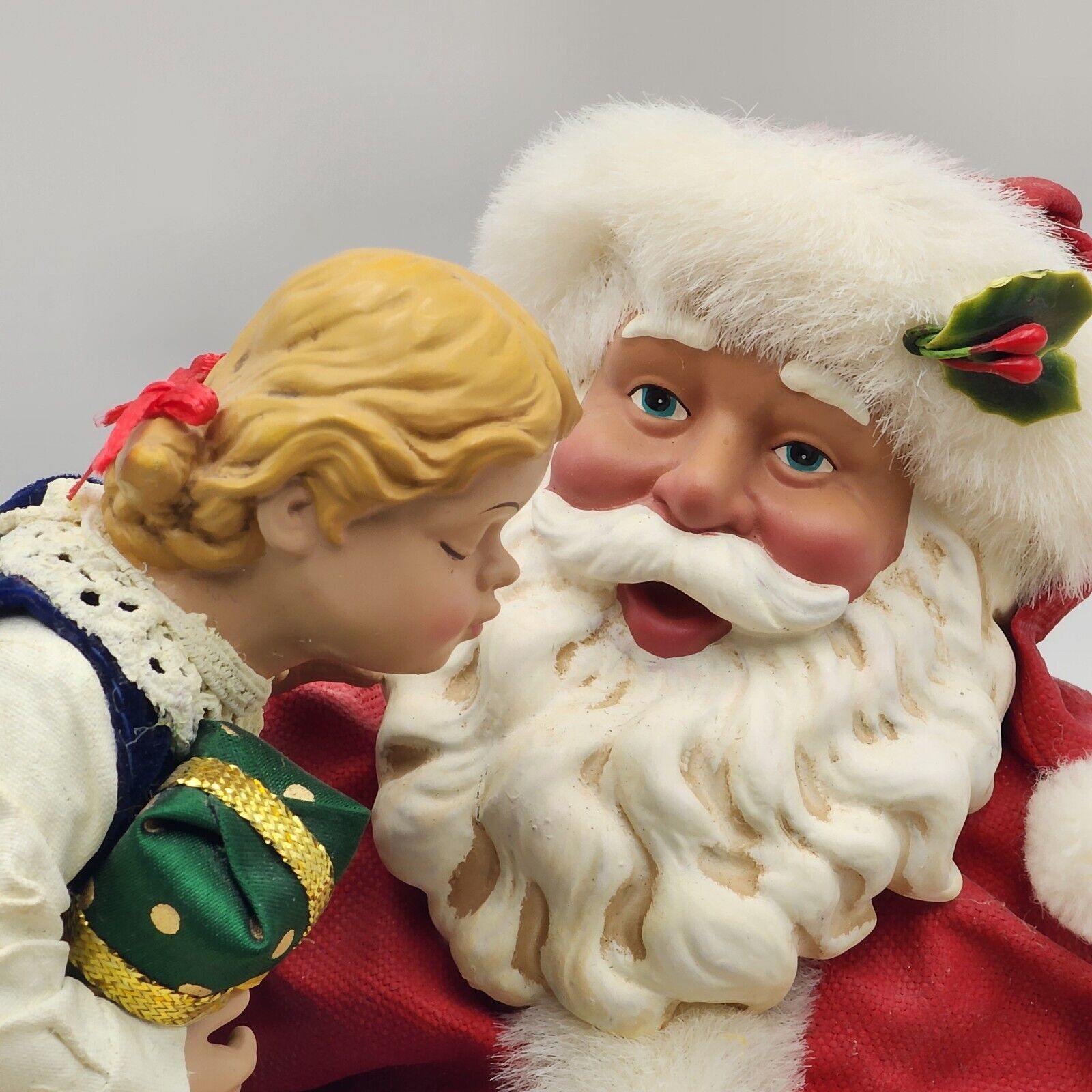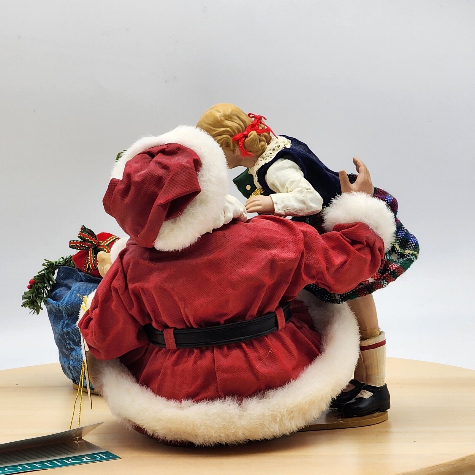 This Clothtique figurine is a must-have for any Christmas collector. It features a sweet girl kissing Santa Claus, with a musical tune playing in the background. The figurine is unboxed and comes with original tags, making it a great addition to any collection.