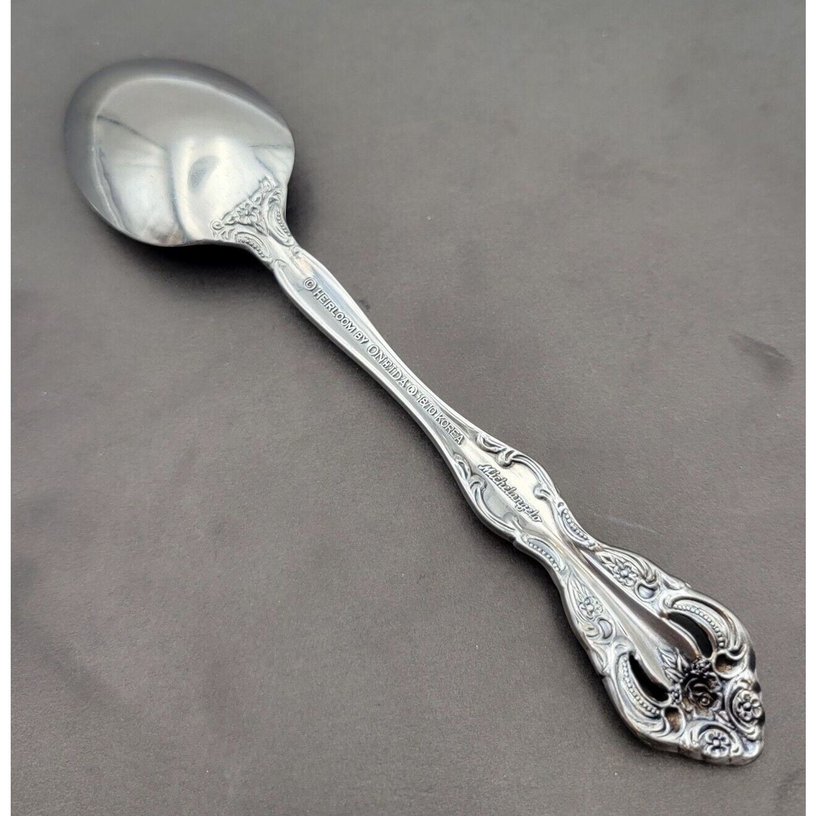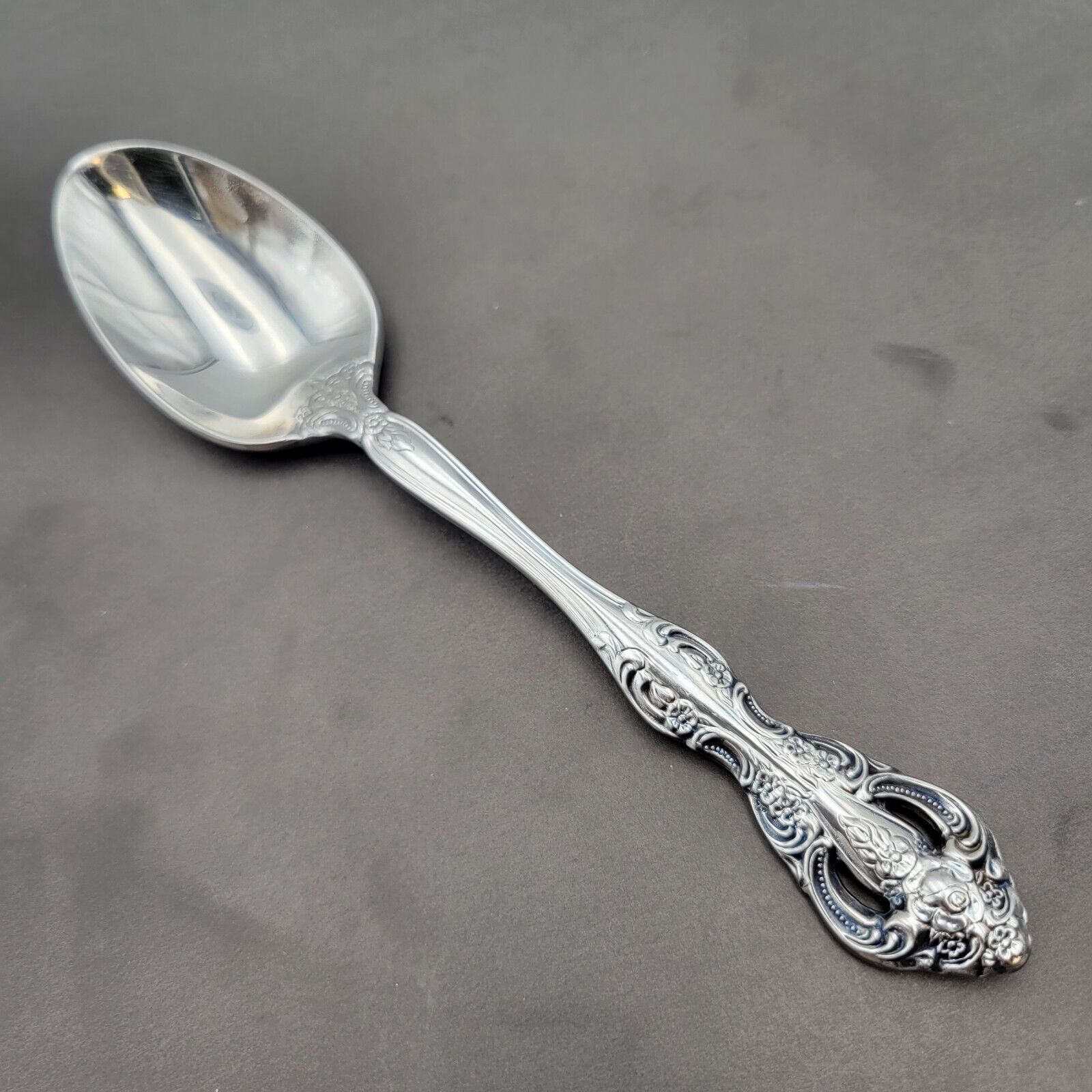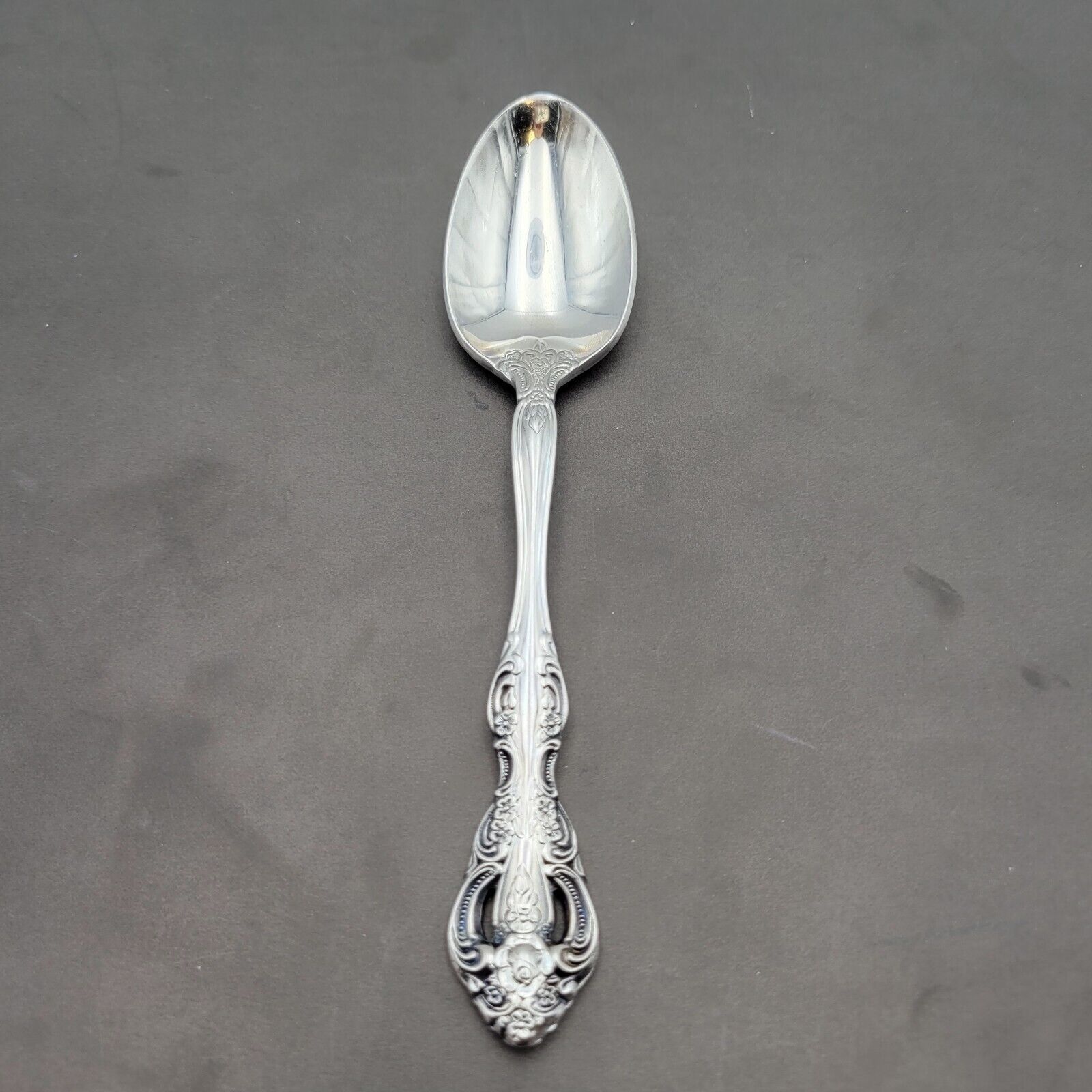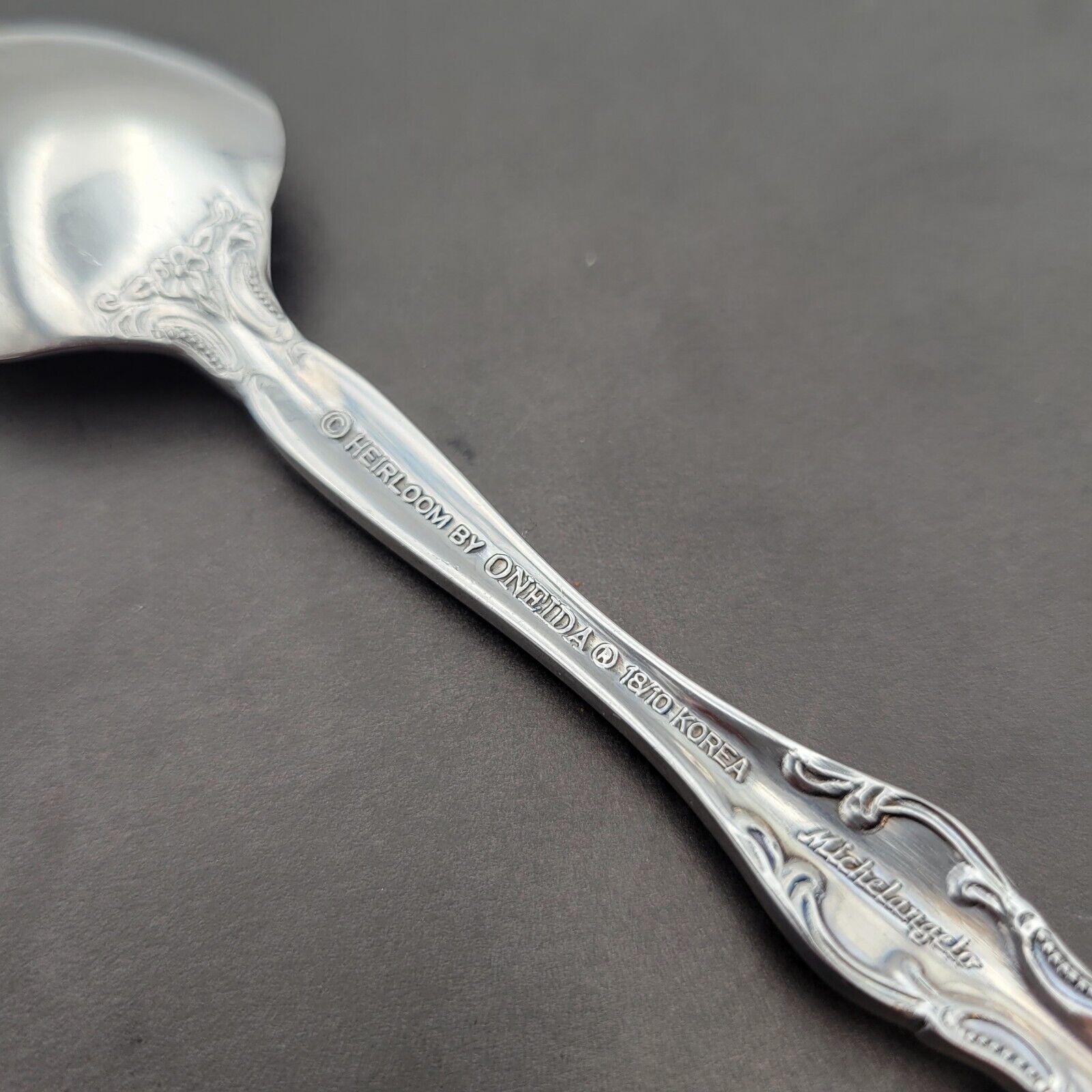 This is a vintage Oneida stainless steel teaspoon or coffee spoon from the Michelangelo collection. It has a glossy finish and a floral handle pattern. The spoon is 6 inches long and made in Korea. It is reusable, BPA-free, and dishwasher safe. The traditional style and silver color make it suitable for any occasion.
