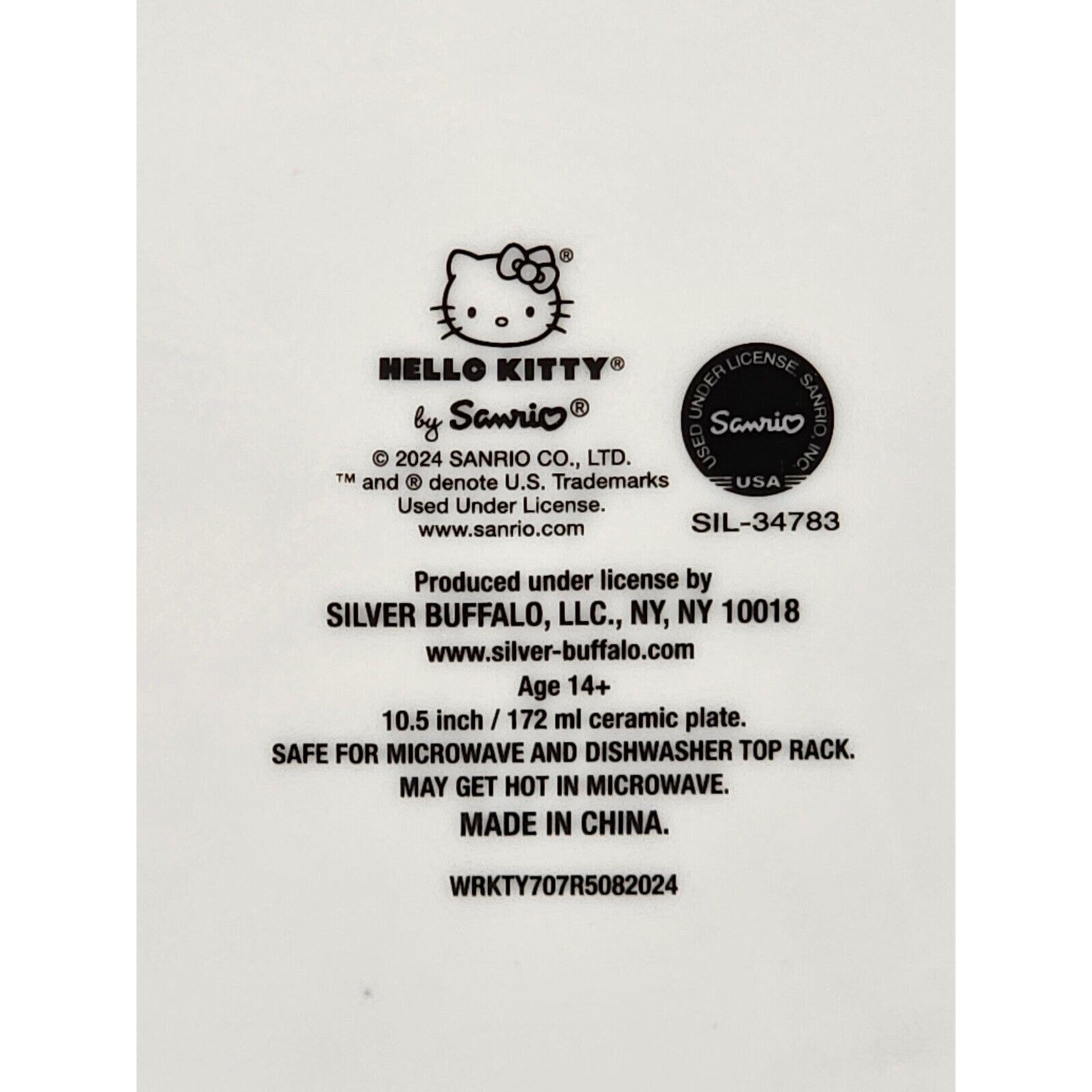 This product is a set of four Sanrio Hello Kitty Christmas dinner plates featuring candy cane and snowflake designs. The plates are made of ceramic and are 10.5 inches in size. Each plate is adorned with festive elements in a multicolor scheme, perfect for adding a touch of holiday cheer to your dining table. These dinner plates are part of the Hello Kitty franchise and are ideal for collectors or fans of the beloved character looking to add a festive touch to their tableware collection.