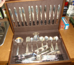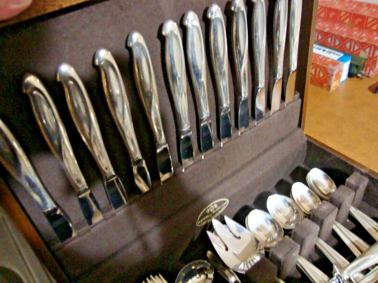 Excellent condition. No monogram. Light oxidation. Lengths are approximate. The carving set, ladles, serving spoons and most other pieces appear to have little to no use. I believe the Reed and Barton wooden storage chest is mahogany, but am not sure. I do not have a scale, so you will have to do your own research for weight. The knives, carving set, and pie servers have stainless steel blades. Eight of the dinner knives have been professionally serrated in Germany, and cut like steak knives. See the pics. Shipping includes full insurance. Not counting the hollow handles on the stainless steel blades (26) , I estimate the weight to be about 82 ounces of sterling silver (2551 grams) based on published weights. The pictures of the dinner forks and soup spoons do not show ten units, but there are.