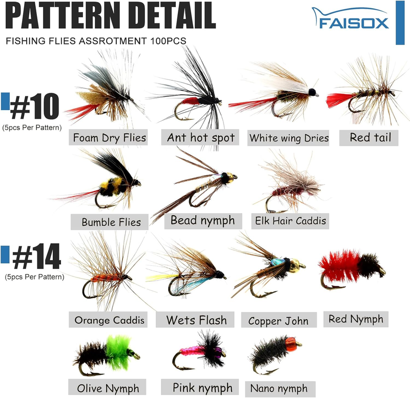 Get ready for a successful day on the water with this 100PCS Fly Fishing Flies Kit, featuring some of the greatest fly patterns of all time. Perfect for both beginners and experienced anglers, this set includes Woolly Buggers, Poppers, Bumbles, Peacock Nymphs, and more ? all hand-tied on sharp, durable hooks.