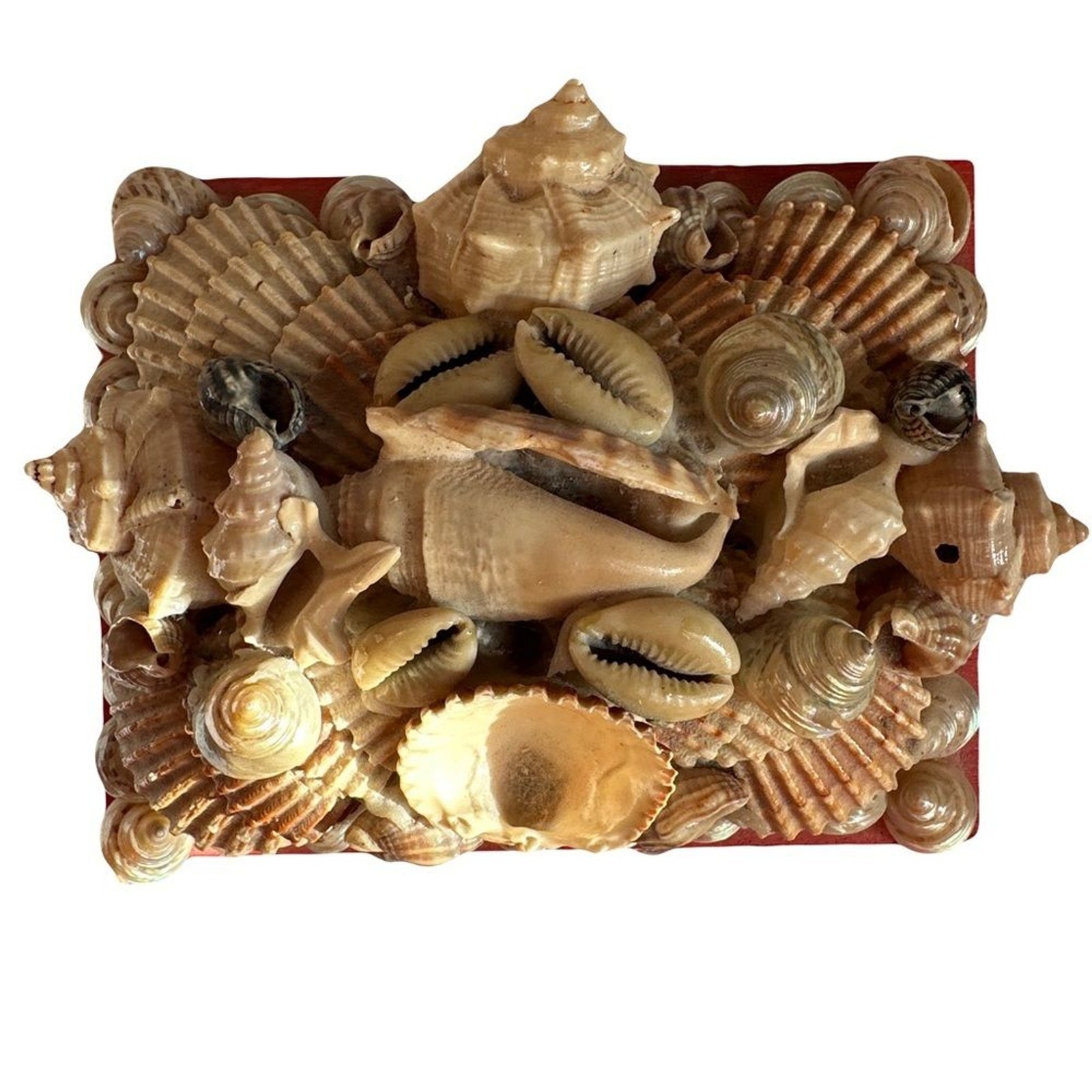 Charming jewelry box with a rich red interior. Decorated with intricate seashell designs. Ideal for storing your precious items. Handmade from France. A couple of the shells appear to be chipped/broken but they blend with others. Small round mirror inside. Overall, in a good vintage condition.