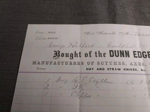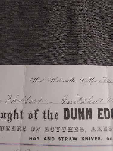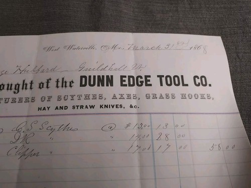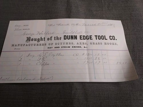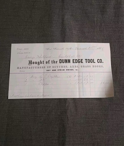 1868 DUNN EDGE TOOL CO Axe Scythe LETTERHEAD BILLHEAD West Waterville Maine RARE. Condition is Used. Shipped with USPS Ground Advantage.