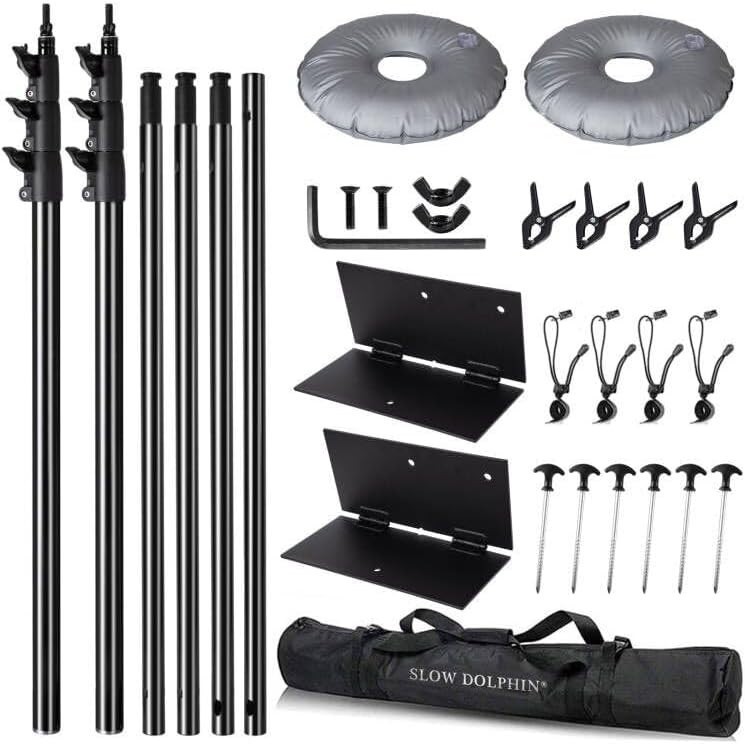 The Kit included 2 x Heavy Metal Base, 2 x Support Sand, 2 x Cross Bar, 2 x wing nut,4 x Spring Clamps, 4 x Multifunctional Clips Holder, 2 x Water weight bag,2 x Screw,1 x Wrench,1 x Carrying Case,6 x Metal Ground Nails