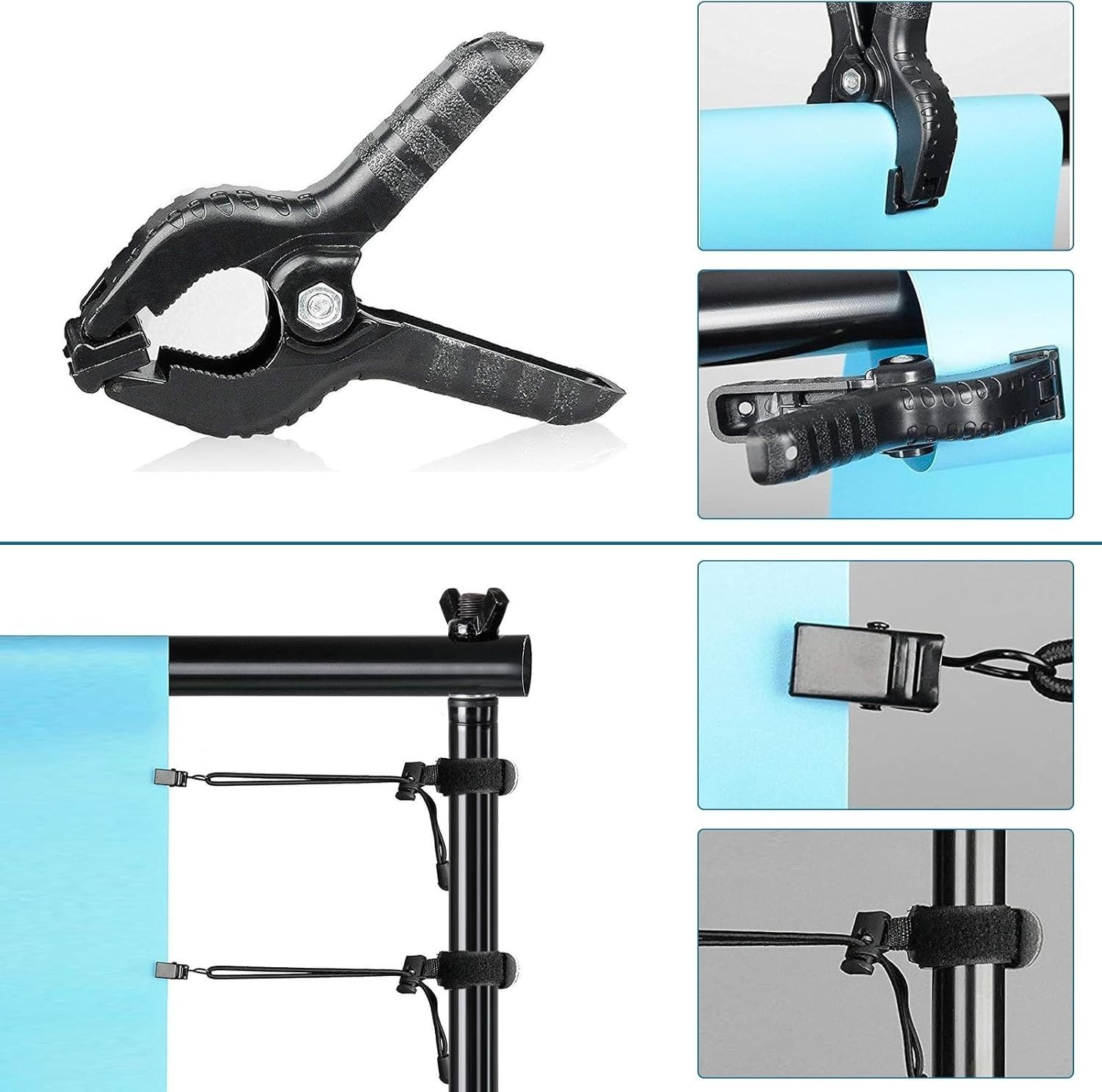 [4 x Spring Heavy Duty clamps] Holds canvas, muslin, paper / photo clamps provides comfortable strong grip to prevent backdrop slip-out. keep it fixed on the background stand. [4 x Background Multifunctional Clips] Helps Securely Tighten Background Simply attach the screen to the clips at even intervals to keep the screen tight and wrinkle free..[1x Portable Carry Bag] Premium Quality Nylon Material with sturdy zipper .Easy to transport and store.