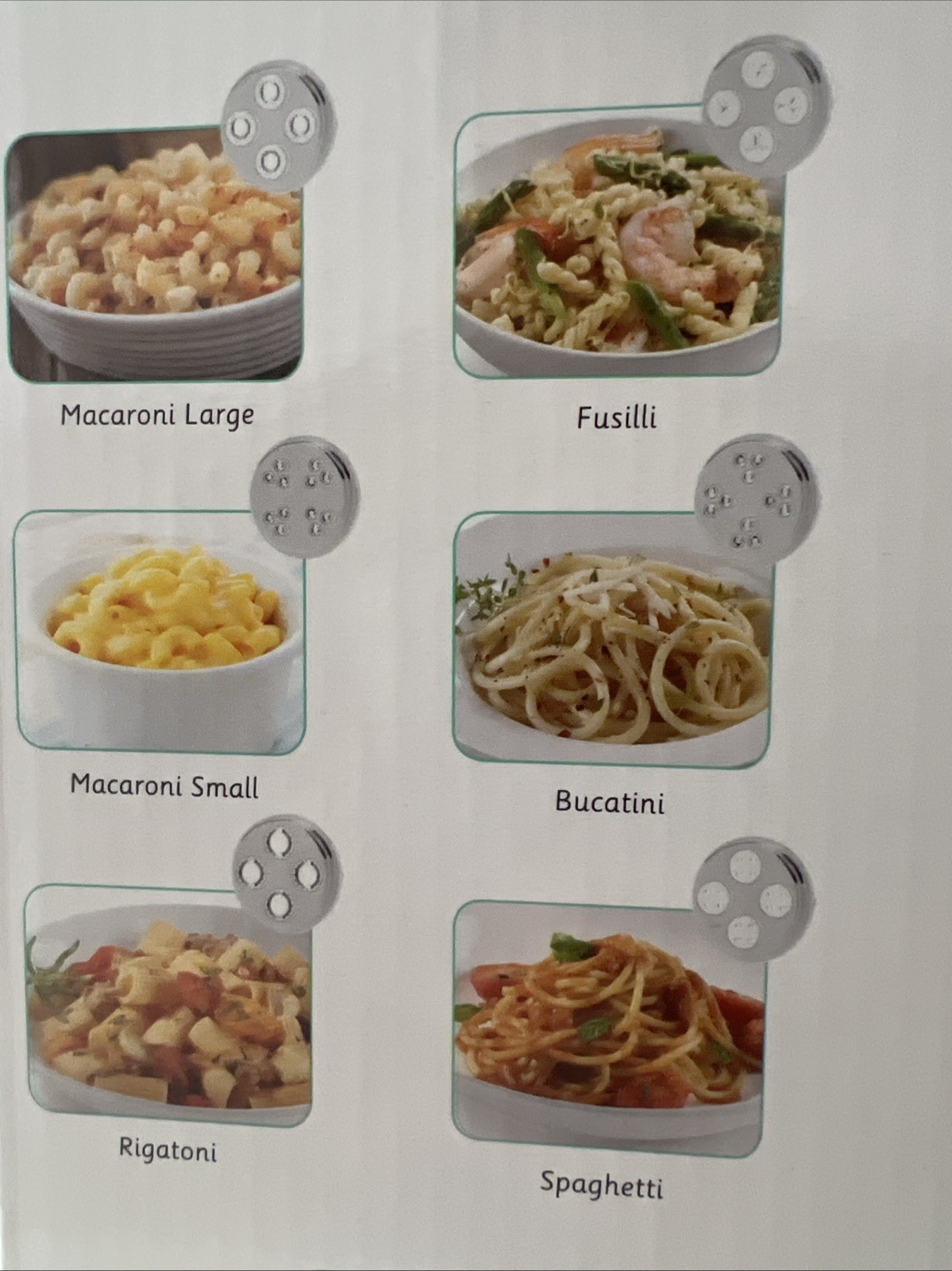 INCLUDES: 6 pasta plates for spaghetti, small macaroni, rigatoni, fusilli, large macaroni, bucatini and a storage case - also includes recipe book