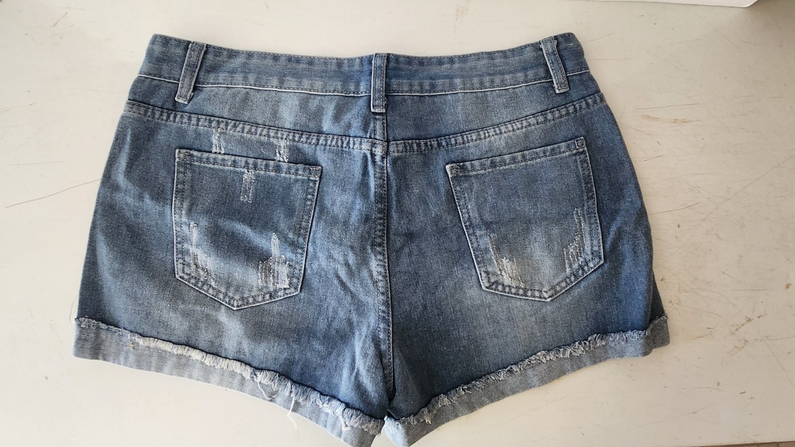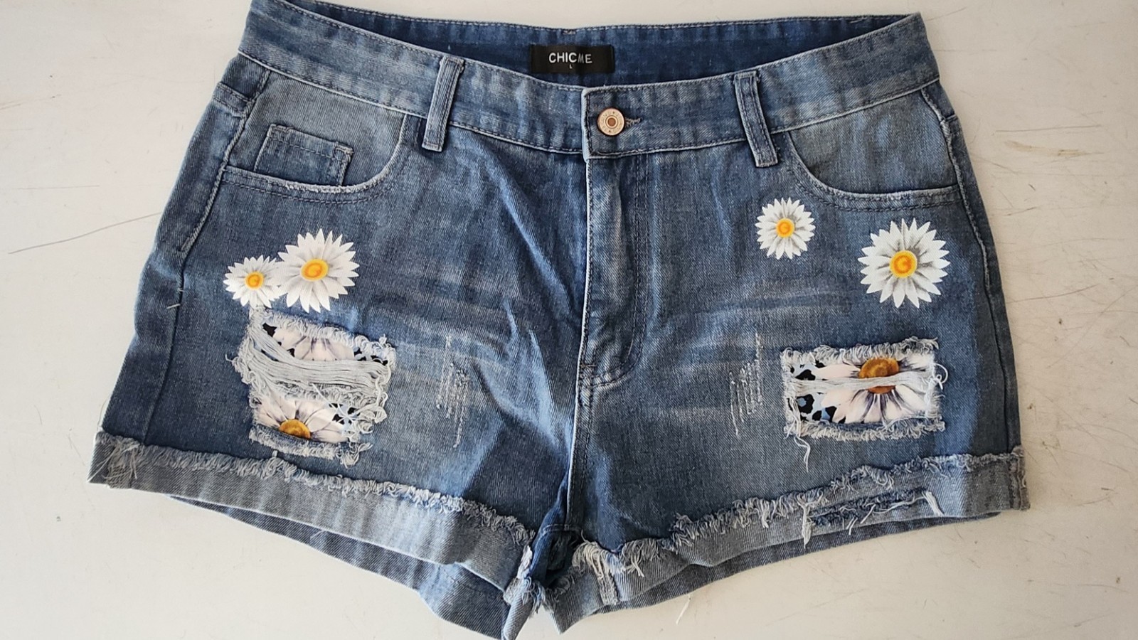 These women's size large cutoff shorts in daisies distressed denim are perfect for a casual occasion with a zip closure and mid-rise fit. Made of 100% cotton denim, these shorts feature a 5-pocket design and a 3-inch inseam. The floral daisy pattern and light fabric wash add a stylish touch, while the comfort and regular fit make them suitable for year-round wear in any season. Perfect for walking activities, these shorts by Chic Me are machine washable and a great addition to any woman's wardrobe.