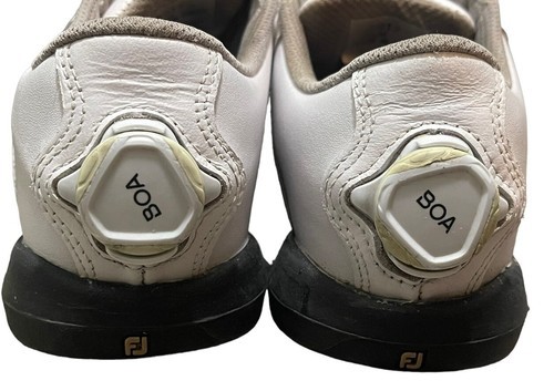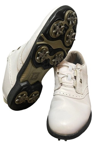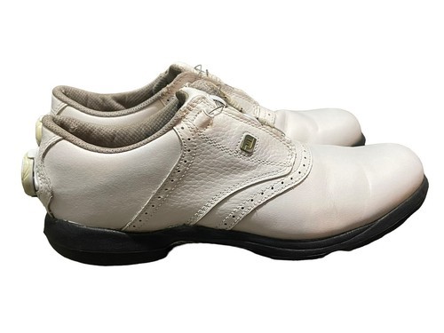 FootJoy's Dryjoys Women's Leather Golf Shoes in size 7.5. Designed for athletic performance, these shoes are perfect for any golf enthusiast. The upper material is made of high-quality leather that guarantees durability and comfort.
