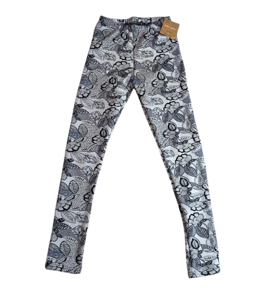 These are absolutely beautiful. Brand new. Get cozy boutique leggings. Size extra small/small. The interior is completely lined with super soft brushed fleece. They have a white background with black and gray floral design. The retail price is over $50