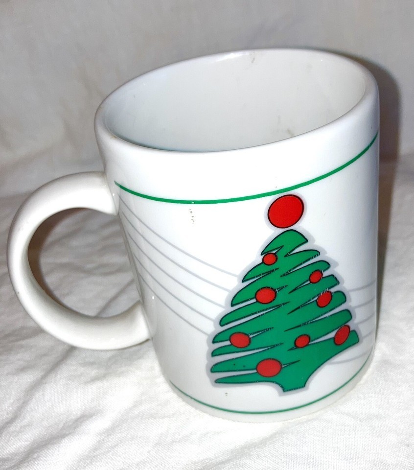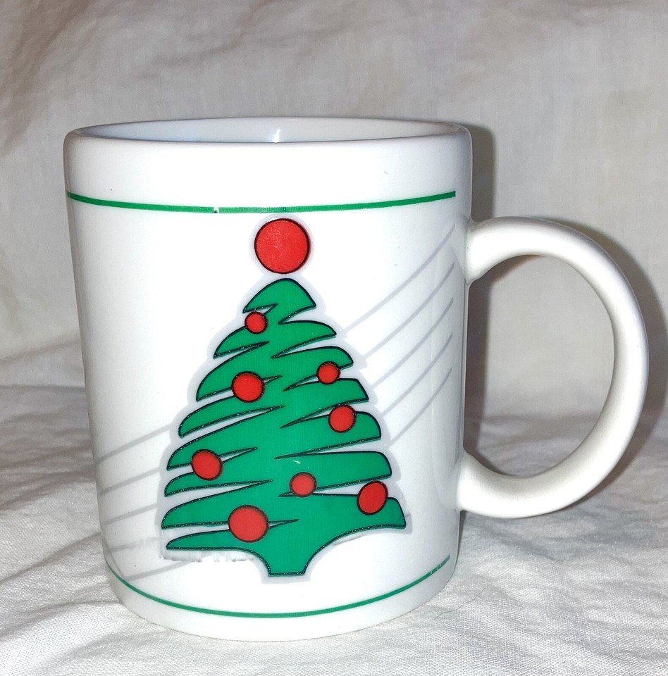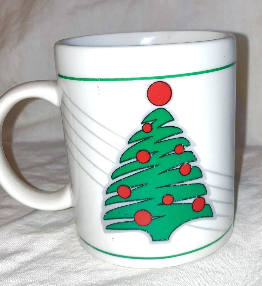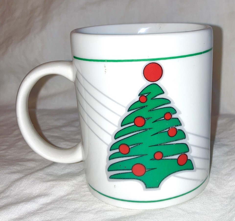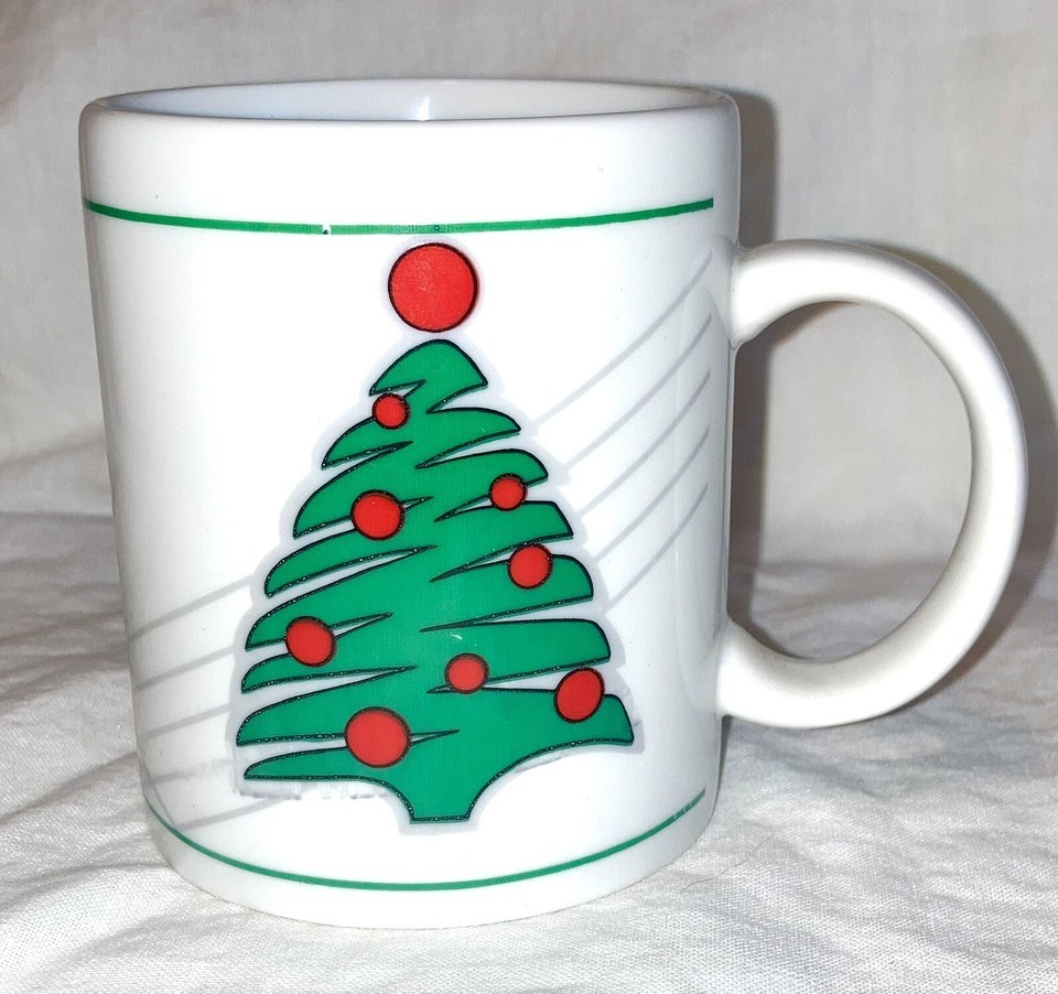 Mug. Coffee or Cocoa white green CHRISTMAS Tree Design