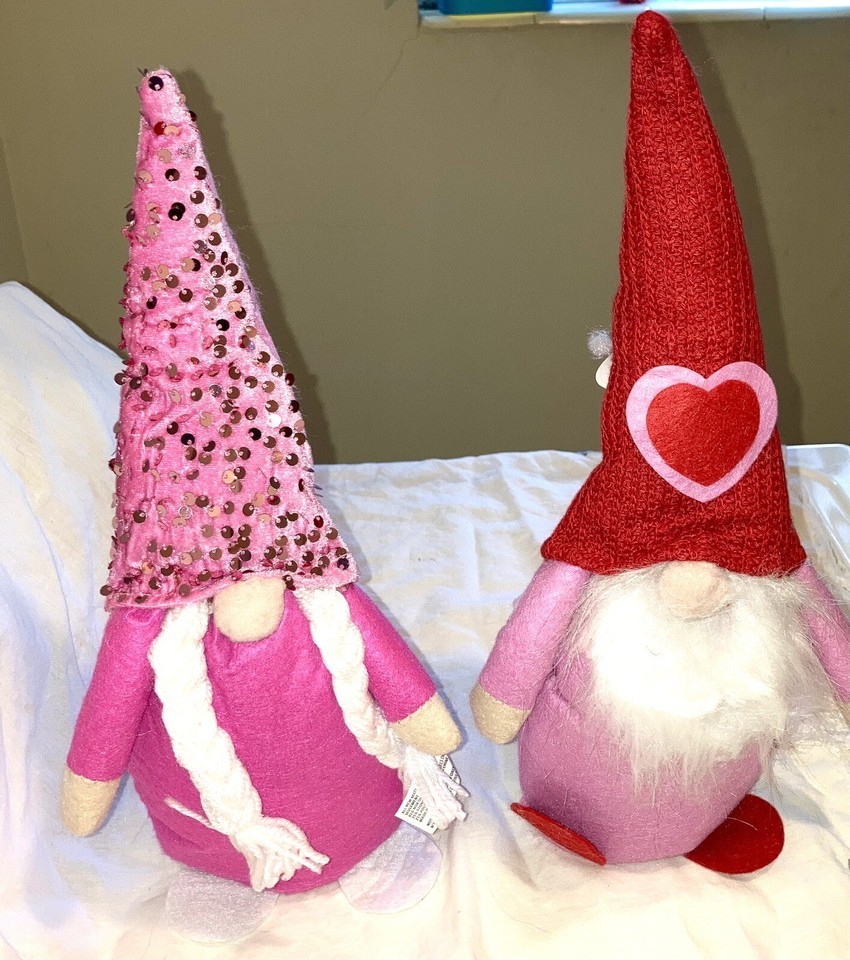 These gnomes, him and hers, are adorned with sparkling sequins in red and pink hues, adding a pop of color to any room