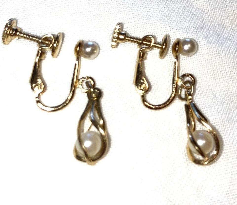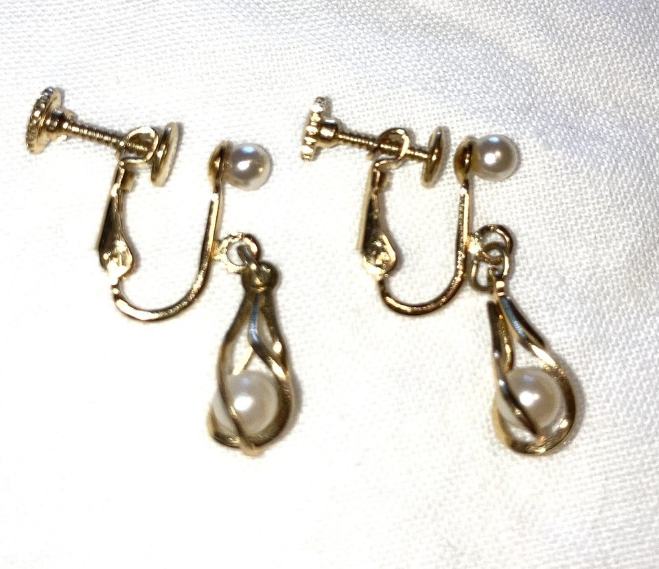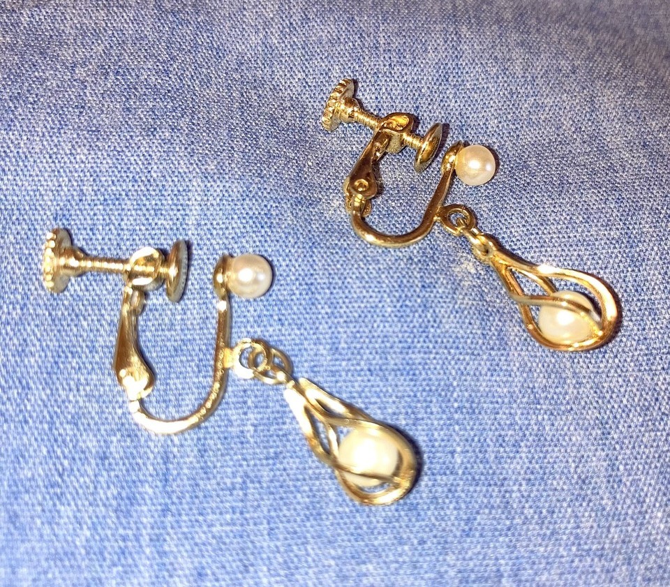 Earrings Drop caged Pearl Vintage Napier Dangling screw back in Gold Tone