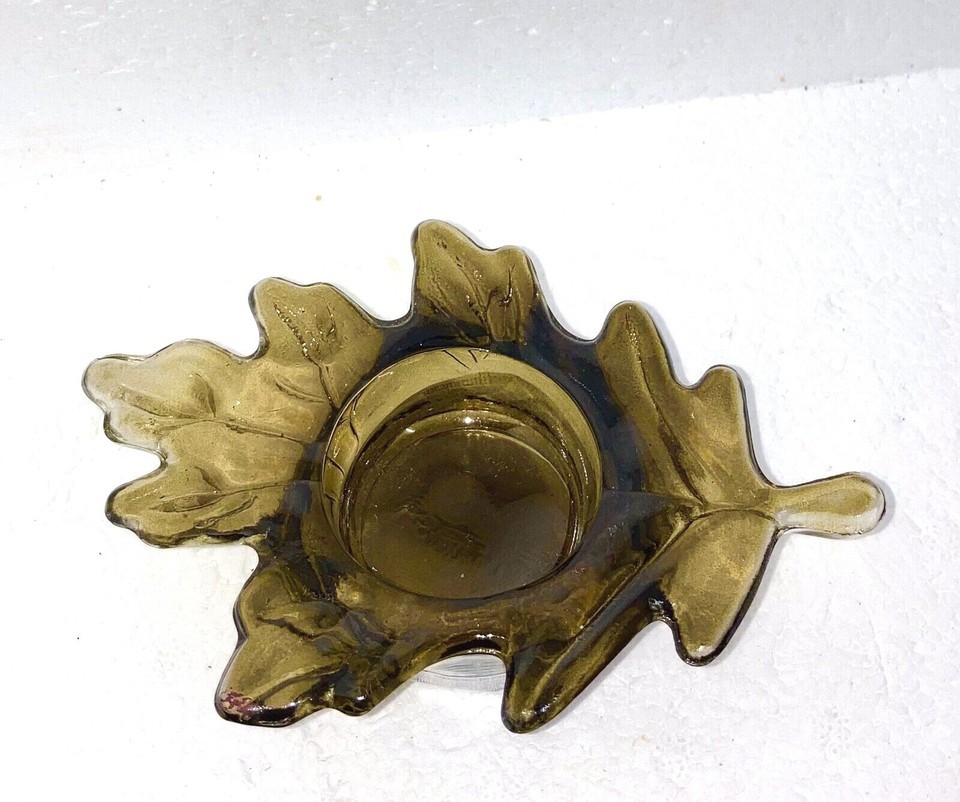 Votive Candle Holder with candles AUTUMN FALL LEAF design Green Glass