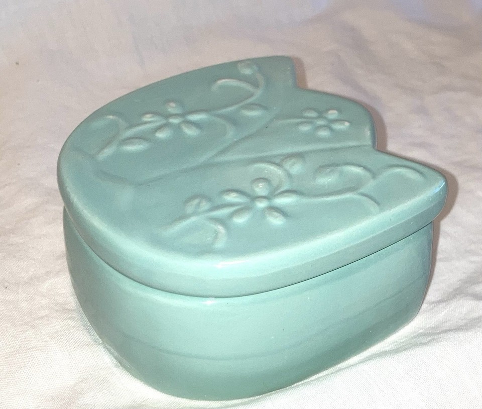 Crafted from delicate porcelain and featuring a beautiful shade of green , this box is perfect for storing small treasures or displaying as a decorative piece.