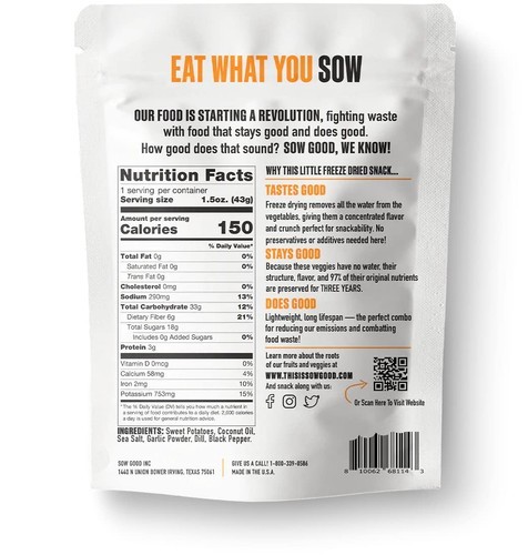 Sow Good Freeze Dried Dill Flavored Sweet Potatoes, One 1.5 oz Bag of Freeze Dried Vegetables *01/26*