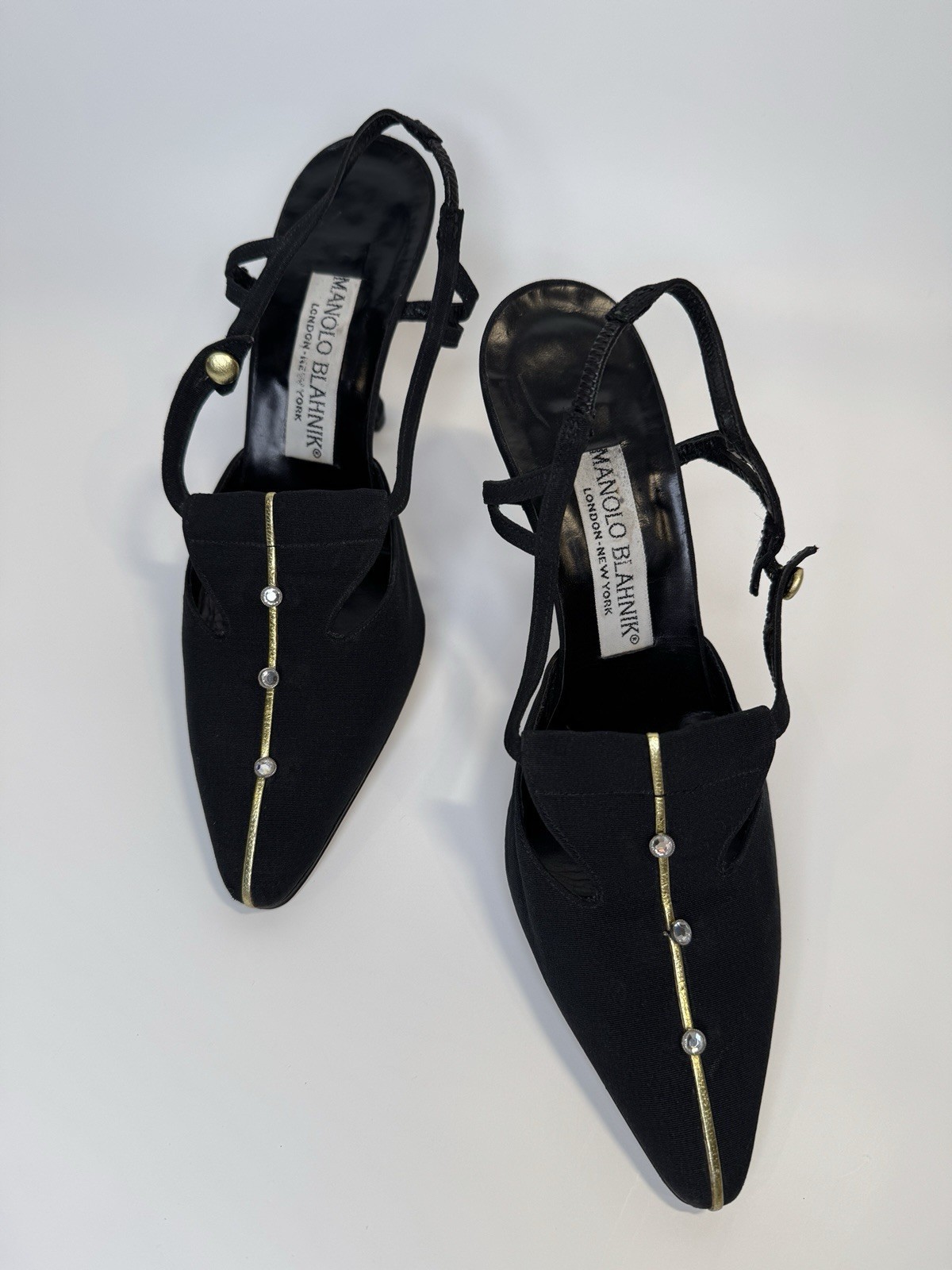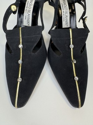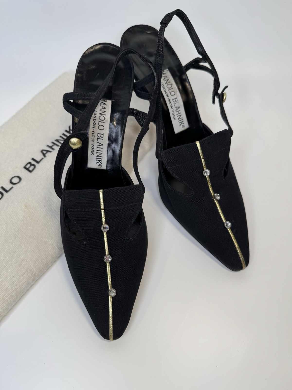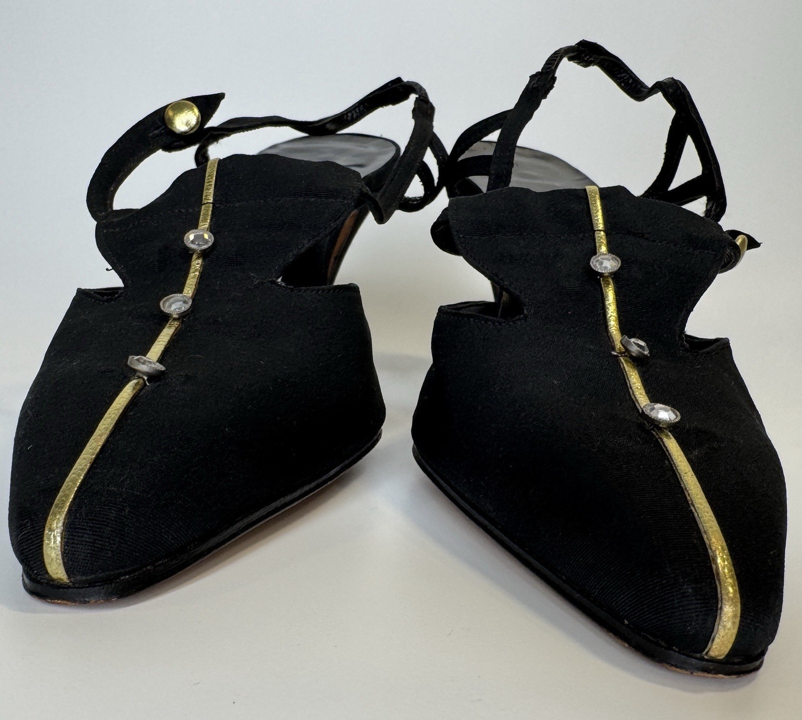 Vintage Manolo Blaknik Size 37 6 Heels Slingback Pointy Black Gold Fabric