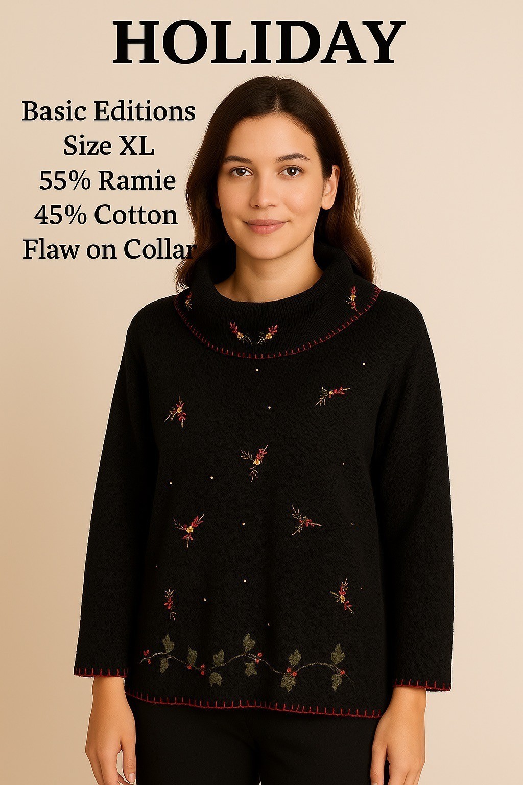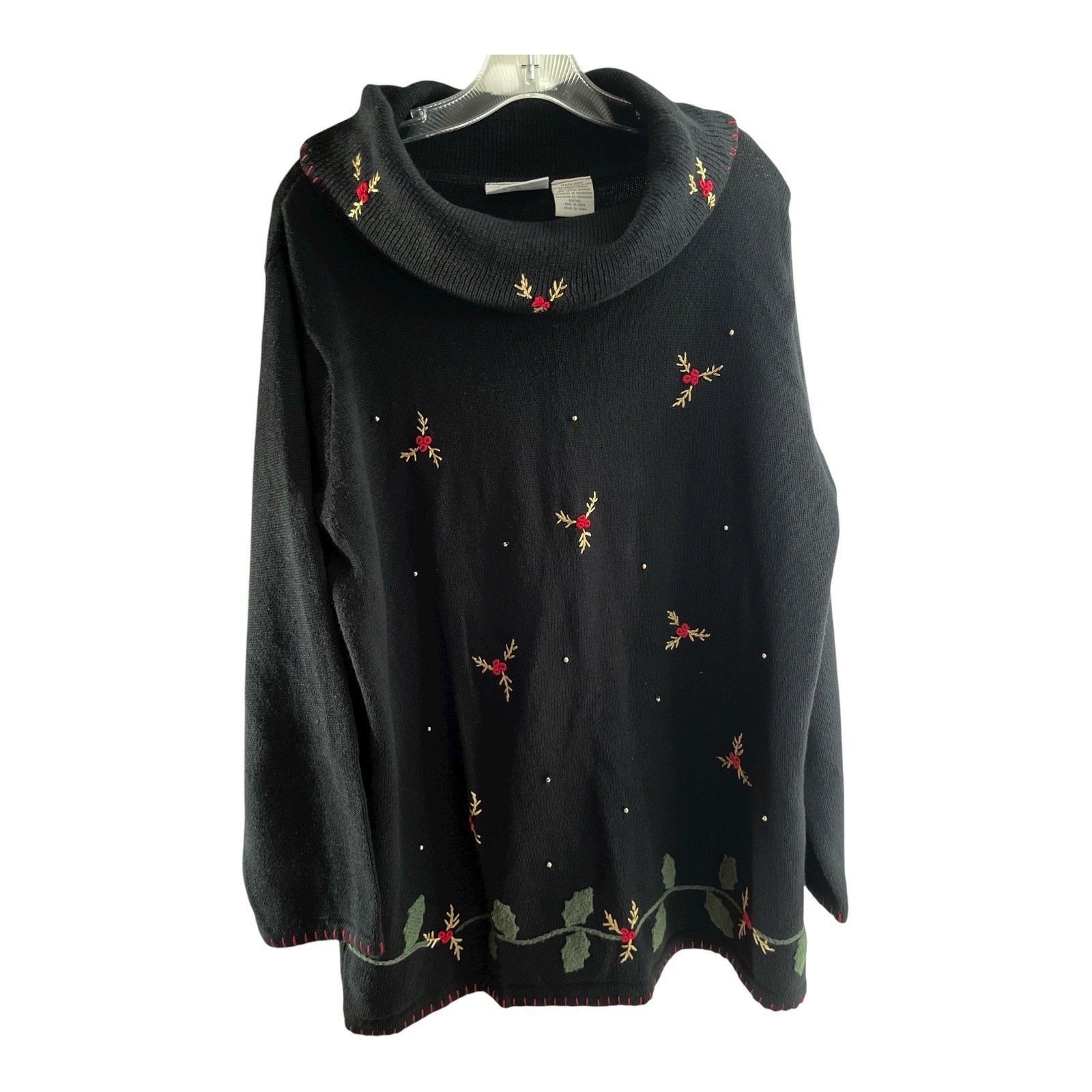 Festive Basic Editions Holiday women?s sweater in black, featuring a cozy cowl neckline with embroidered holly accents, scattered red and green holiday embroidery, and subtle beading for sparkle. The hem is trimmed with embroidered holly leaves, making this a charming seasonal sweater for holiday gatherings and casual wear.