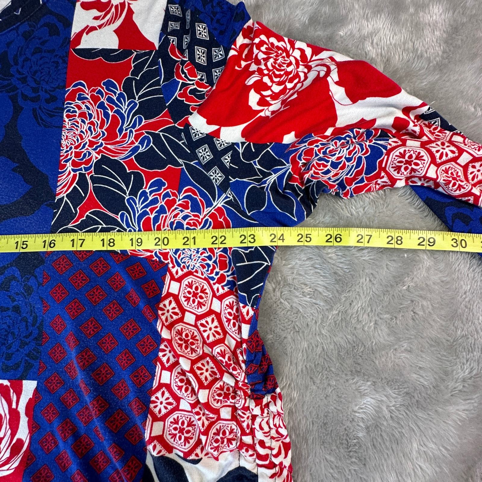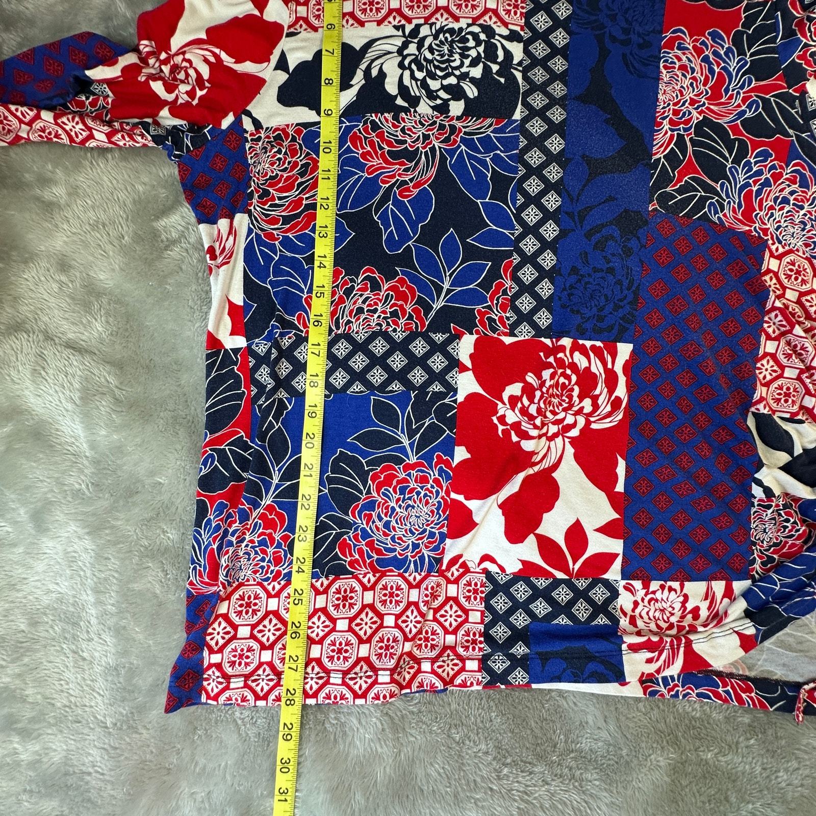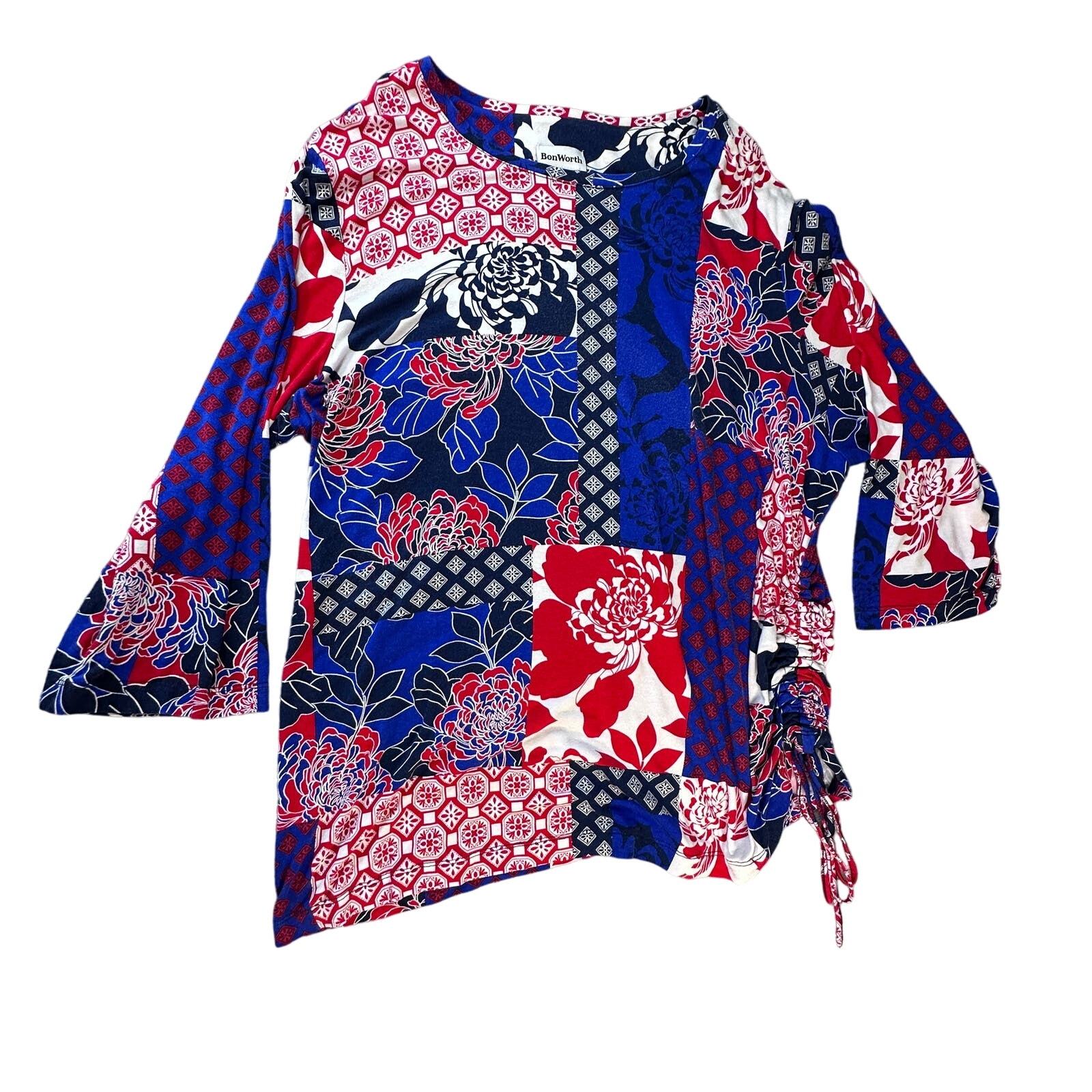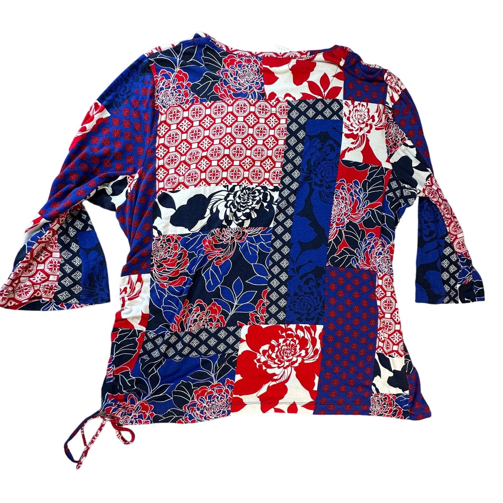 BonWorth Shirt Womens XL Blue Red White Bell Sleeve Floral Patchwork Office Soft