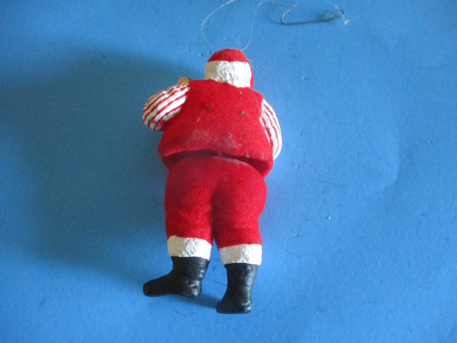 SANTA XMAS TREE ORNAMENT CERAMIC & FELT MOVABLE LOWER BODY 5" W/PIPE, BOOK, BEAR
