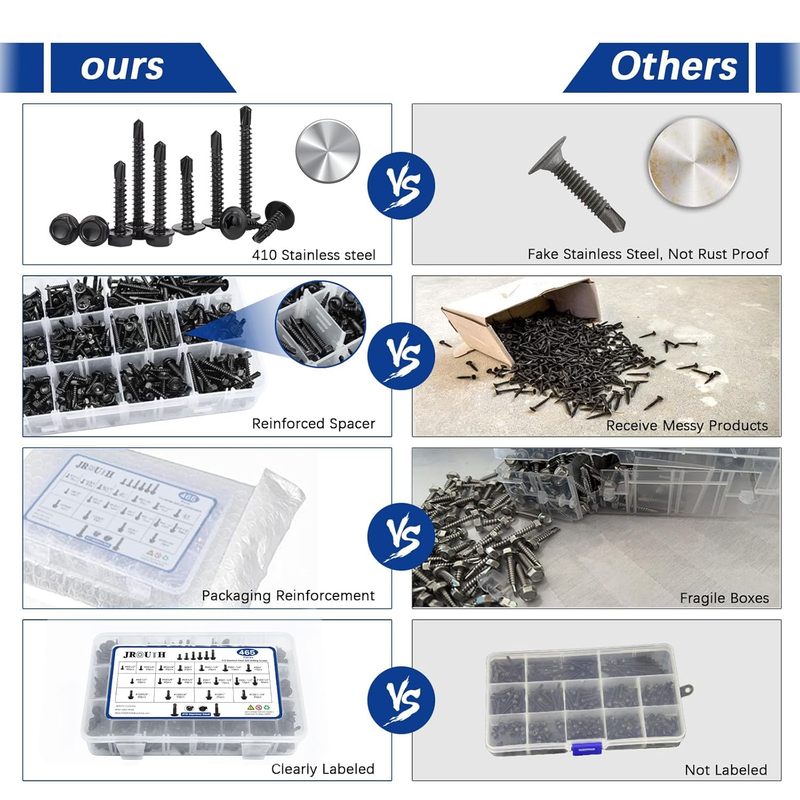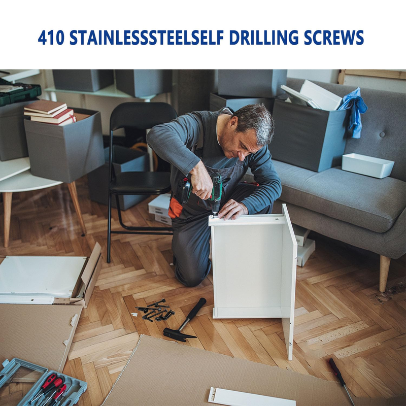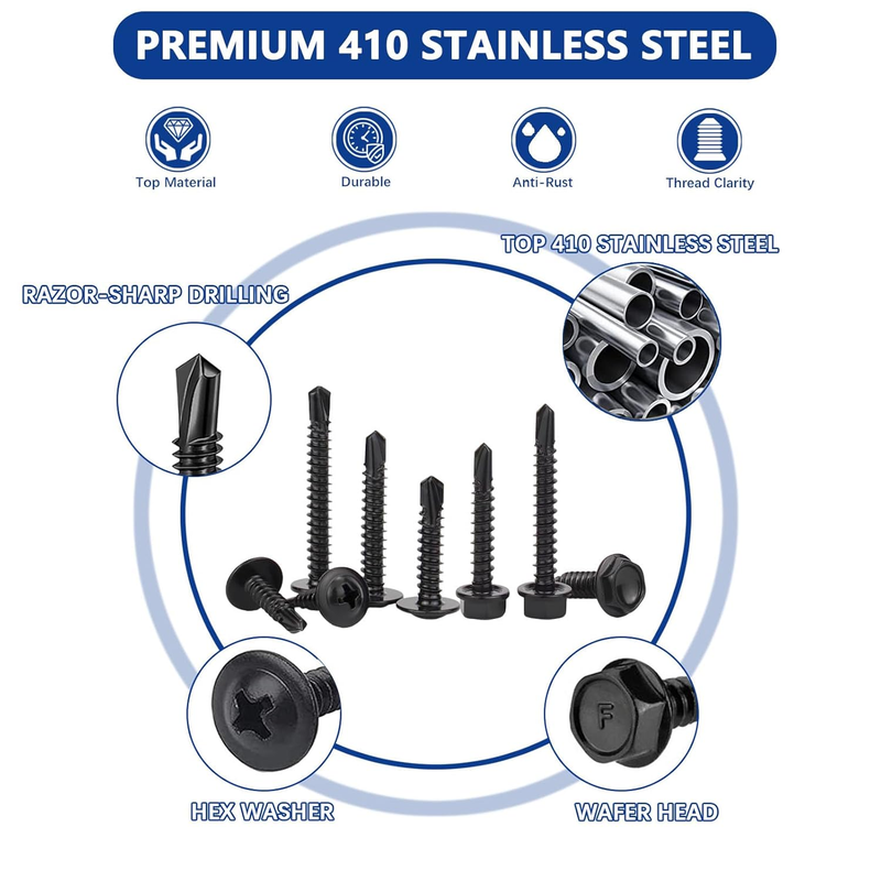 ?410 STAINLESS STEEL?: Crafted from high-grade 410 stainless steel, these assorted sheet metal screws are designed for reliable penetration into metal sheets. This material offers superior hardness, stability, and durability compared to traditional 304 stainless steel, making them ideal for a variety of applications, including metal, wood, and plastic.