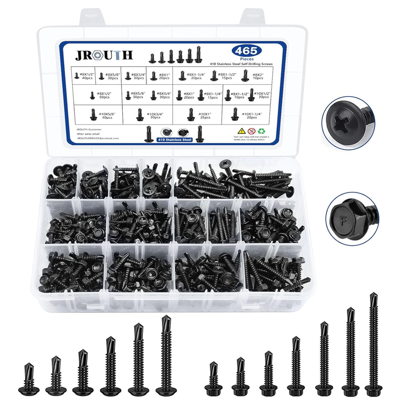 ?MULTIPLE SIZE?: This comprehensive assortment includes 465 pieces of stainless steel self-tapping screws in 18 different sizes and 2 head types. The Phillips Round heads are available in sizes #8x (1/2'', 5/8'', 3/4'', 1'', 1-1/4'', 1-1/2'', 2") and Hex Washer heads in sizes #8x (1/2'', 5/8'', 3/4'', 1'', 1-1/4'', 1-1/2'') #10x (1/2", 5/8", 3/4", 1", 1-1/4").
