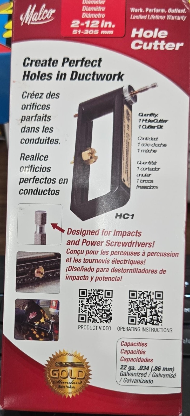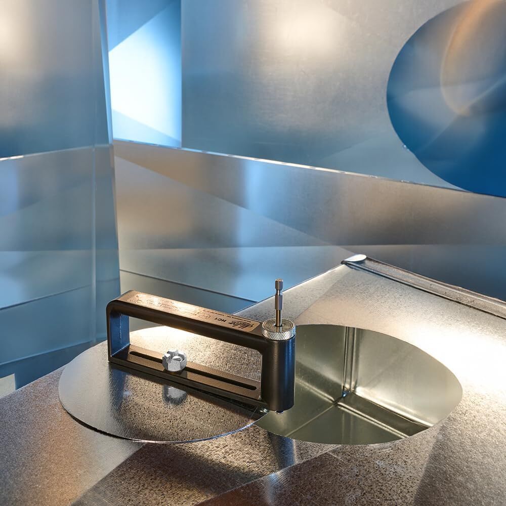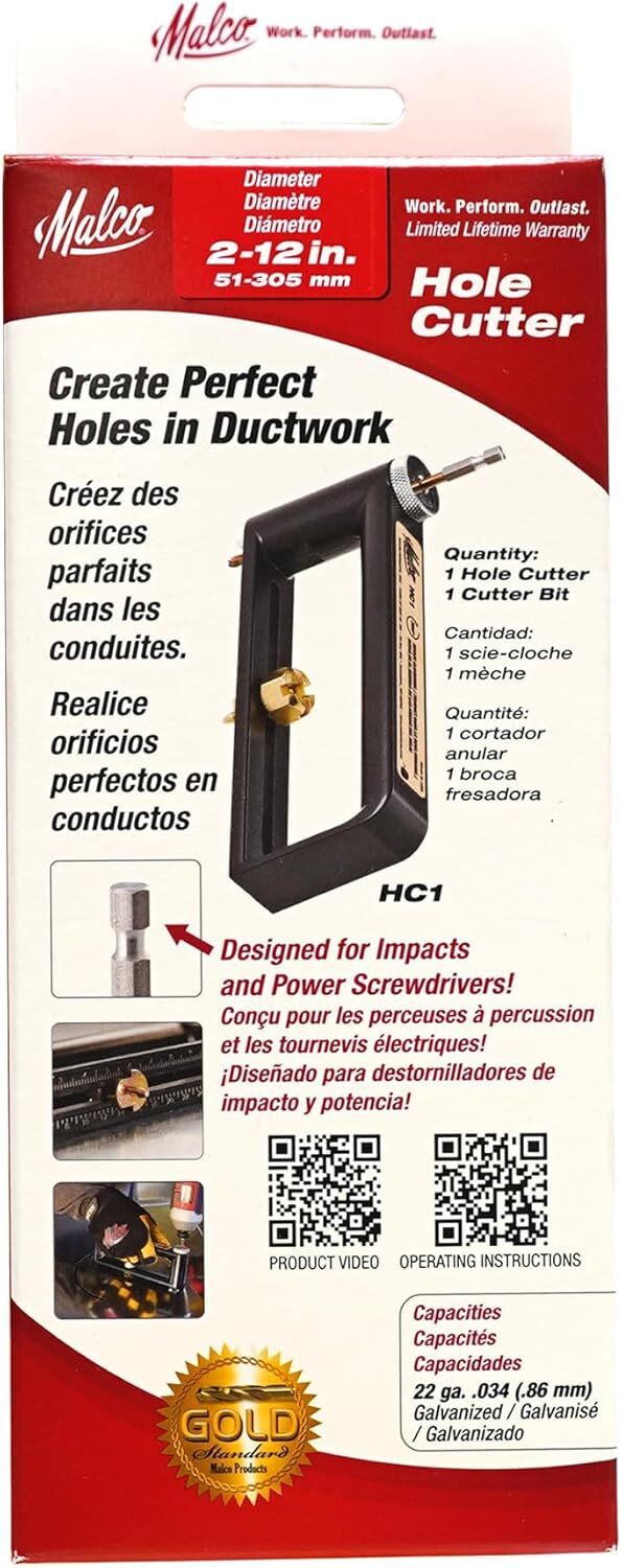 The Malco 2-Inch-to-12-Inch Sheet Metal Hole Cutter Accessory adjusts for cutting varying size holes in galvanized sheet metal. This hole cutter installs into the chuck of a standard electric drill as small as 1/4-inch. It stores easily in a tool box and features a lightweight aluminum frame and high-speed bearings at the top and bottom of the drill shaft to assure perfect cutting balance and long cutting life. This 22-gauge capacity Malco sheet metal hole cutter comes with replaceable cutting bits.