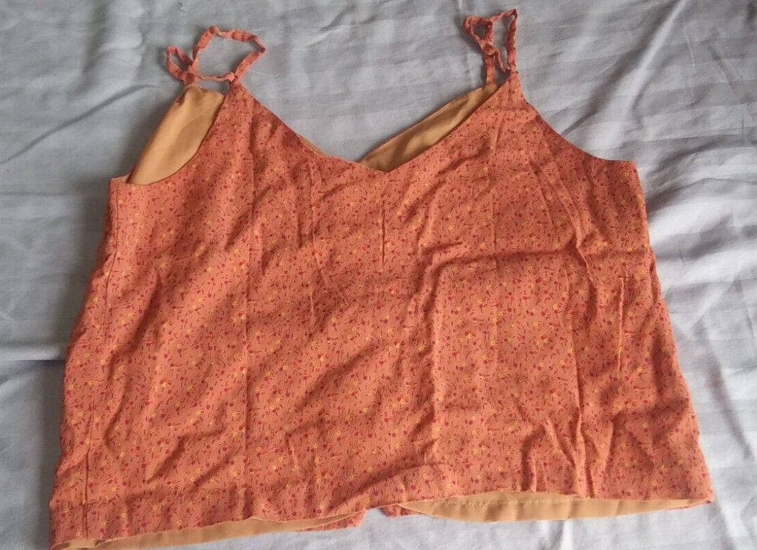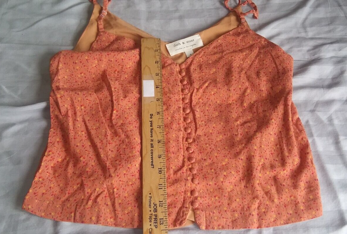This Cloth Stone women's top in size S features a beautiful orange and peach floral pattern that is perfect for any occasion. The sleeveless tank top has a relaxed fit and a V-neckline with a pullover closure. The cold shoulder sleeves add a touch of elegance to the top and the adjustable straps provide comfort and convenience.