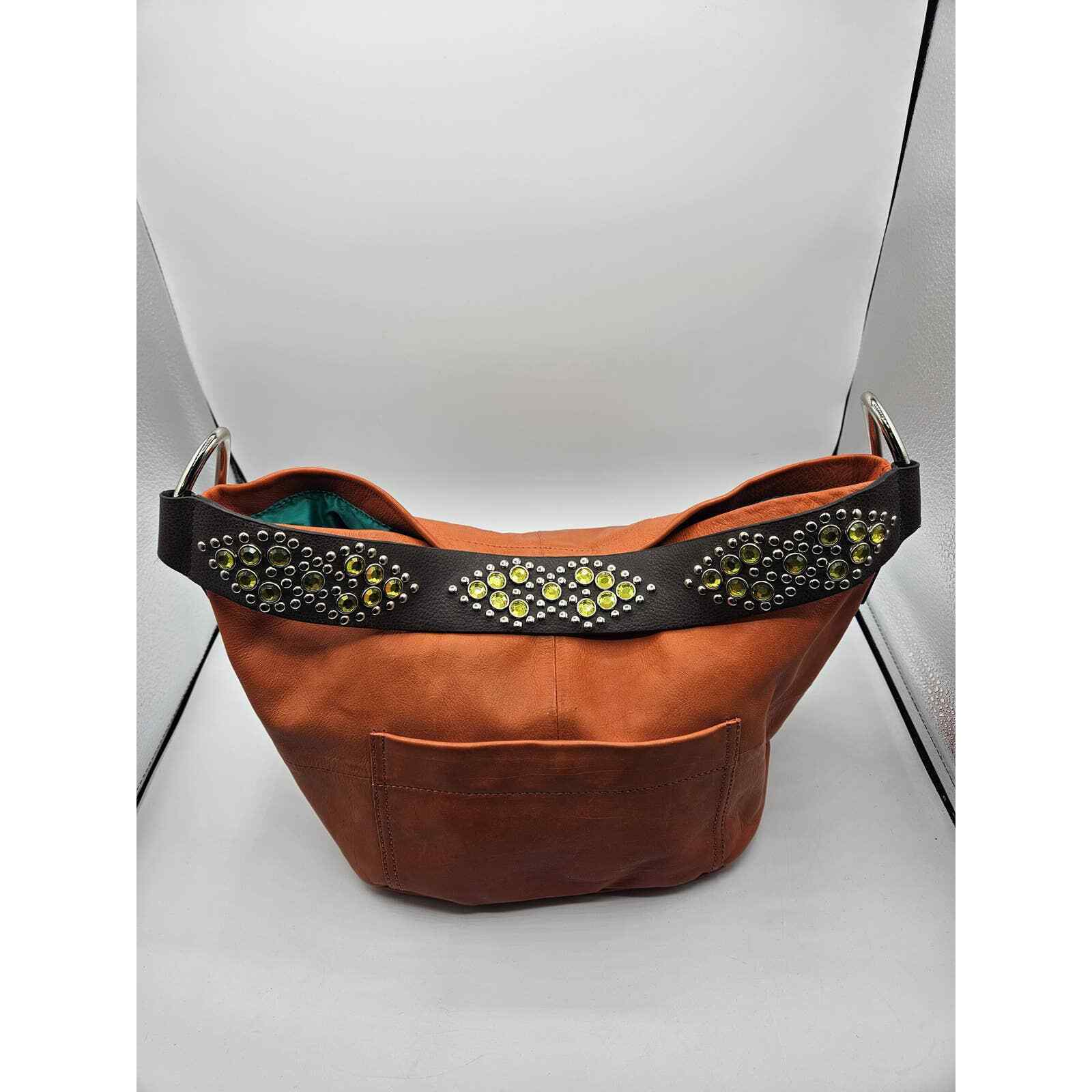This cute purse is a brownish orange color with a brown strap bejeweled with fun accent colors