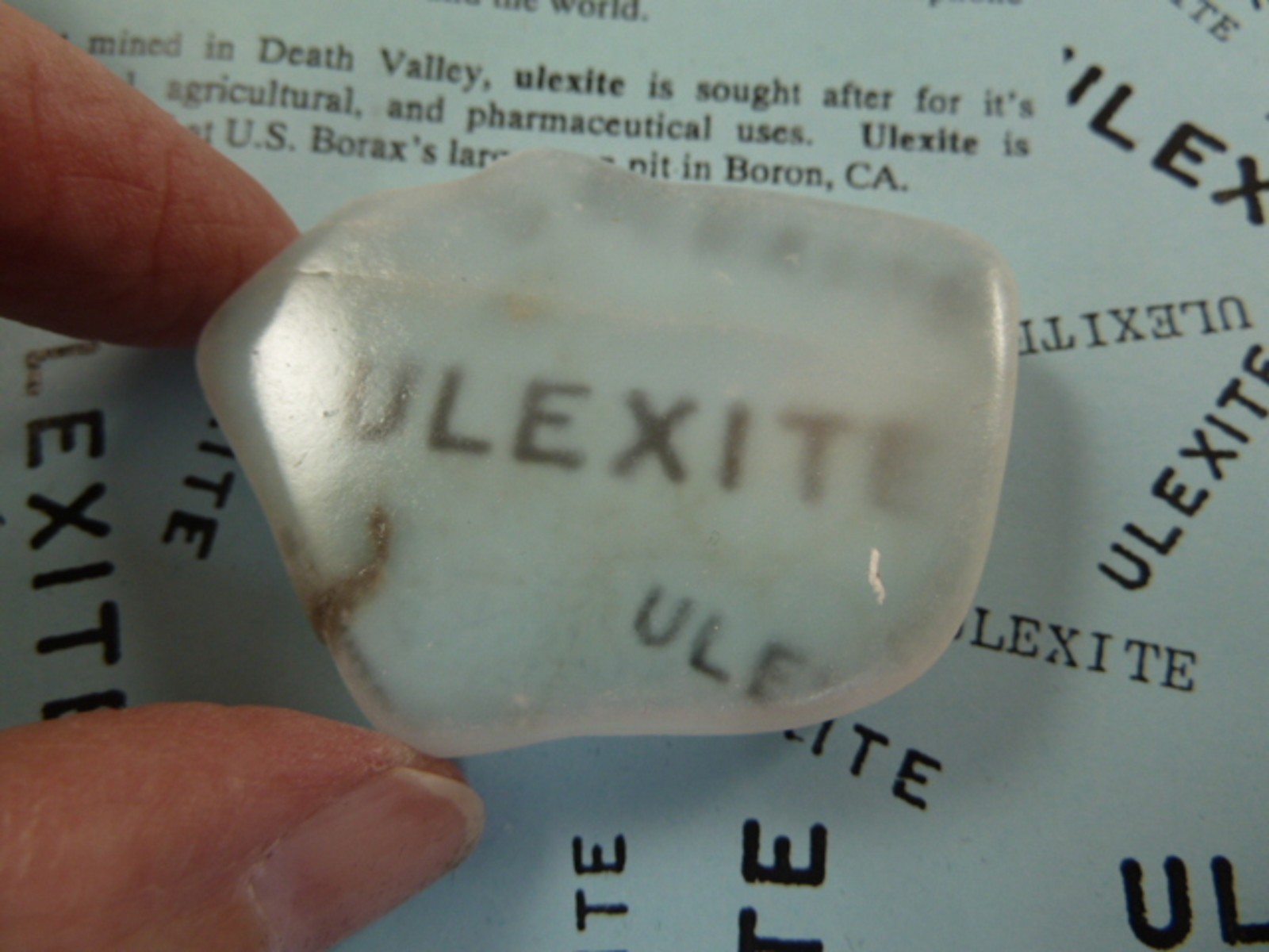 This is by far the most interesting and popular mineral we sell! "Ulexite" is a natural mineral (NaCaB5O9.8H2o) from a borax mine in Boron, California. Our specimens are straight from the mine so it's all A grade clarity. It is calcium-sodium hydrated borax. It exhibits a unique fiber-optic property - when one polished end is placed on a newspaper or picture, the capillary fibers transmit or project the picture to the top of the rock! This is NOT a transparent stone. Kids just know it's weird and wonderful!