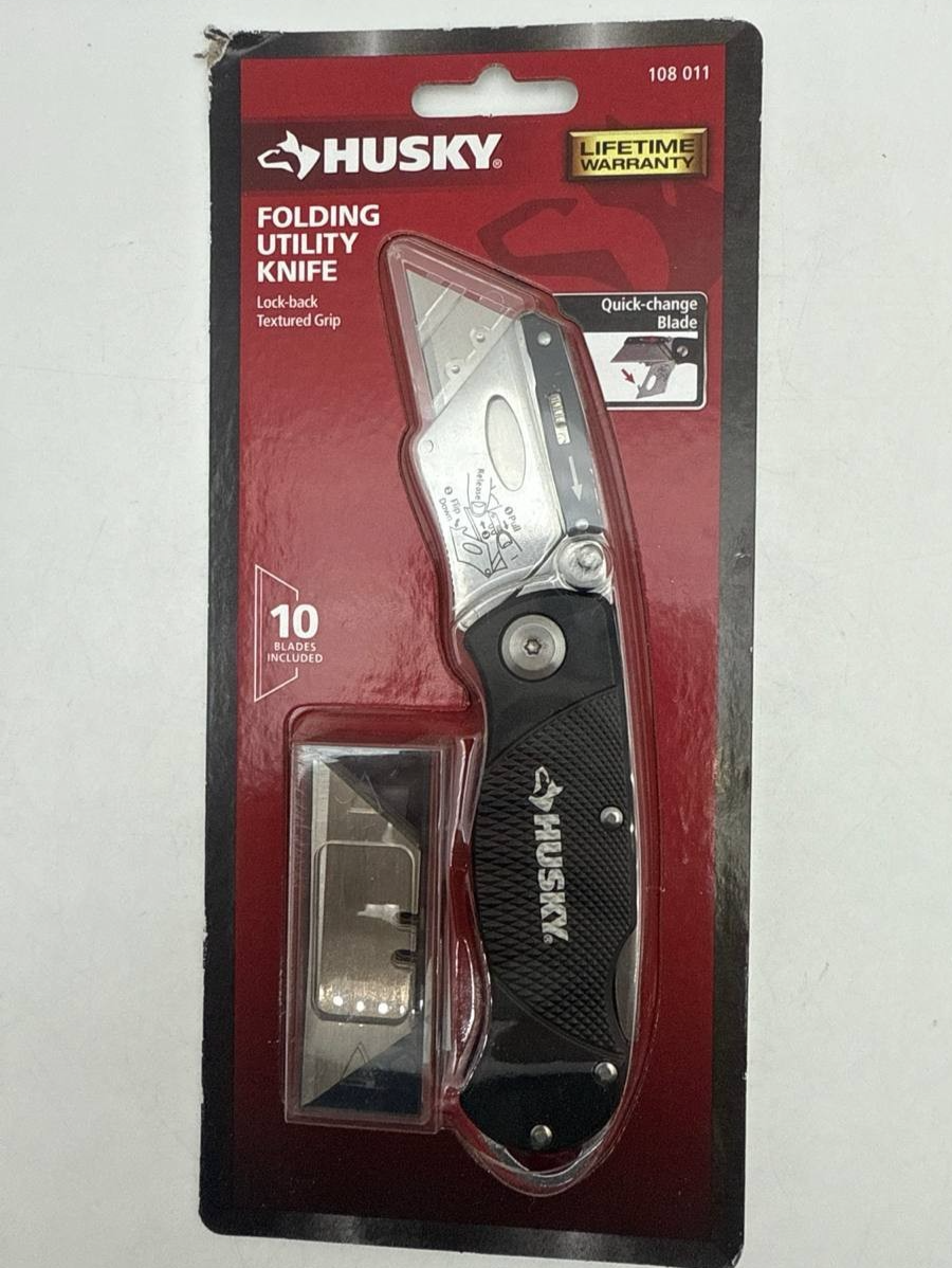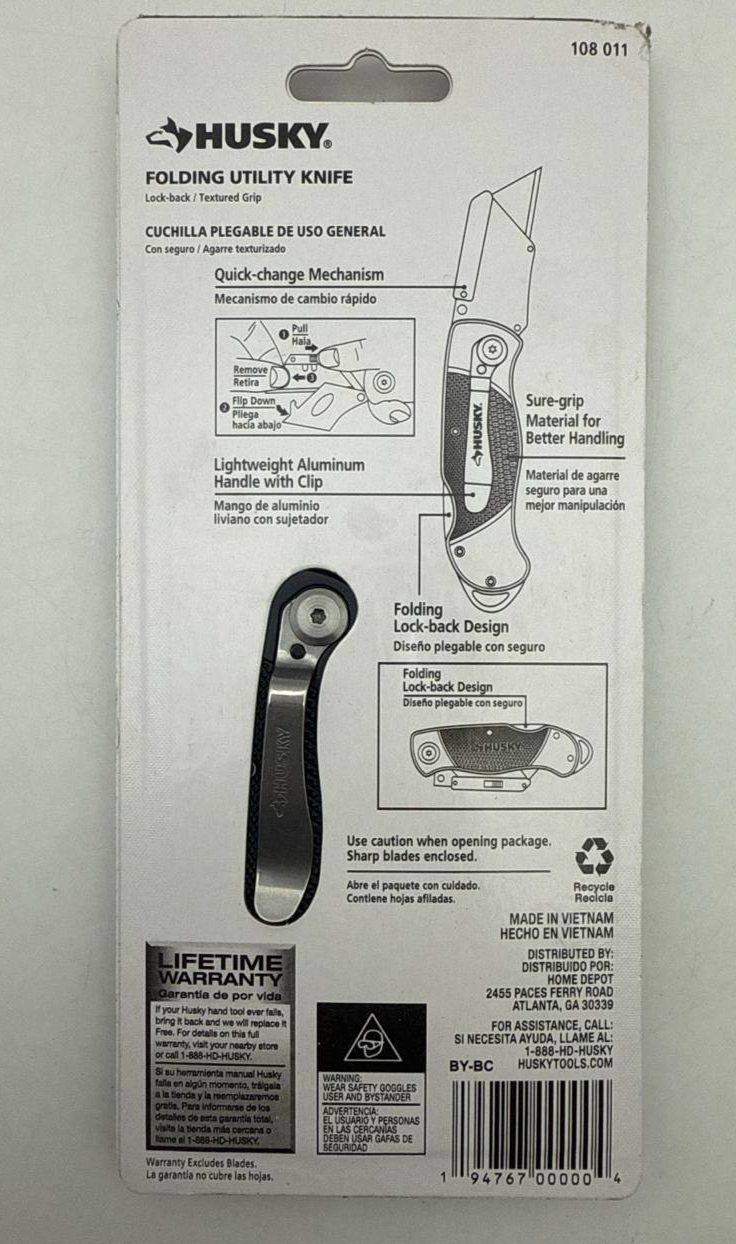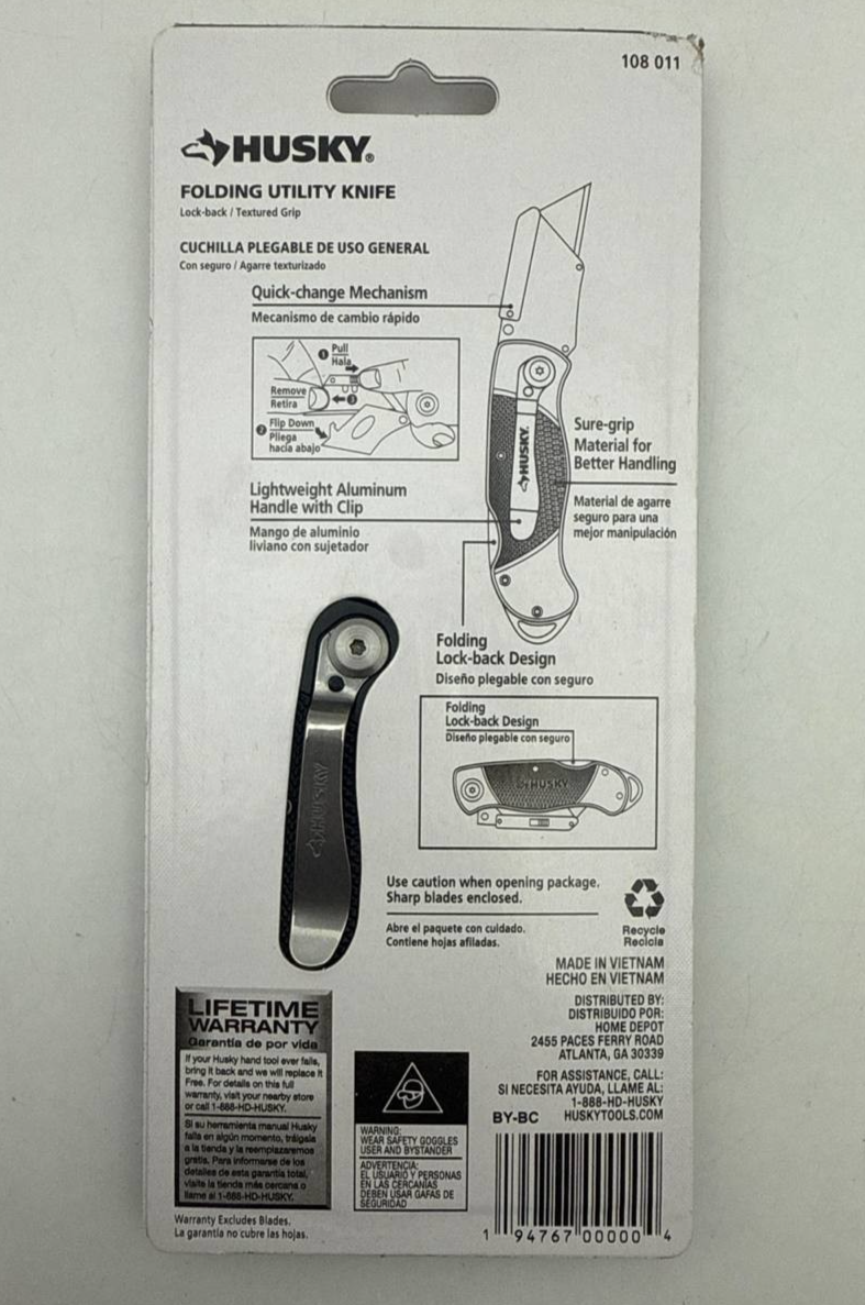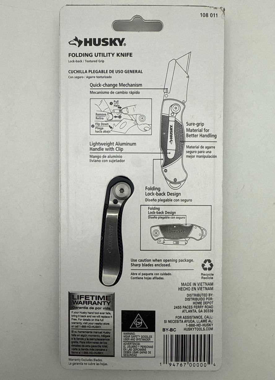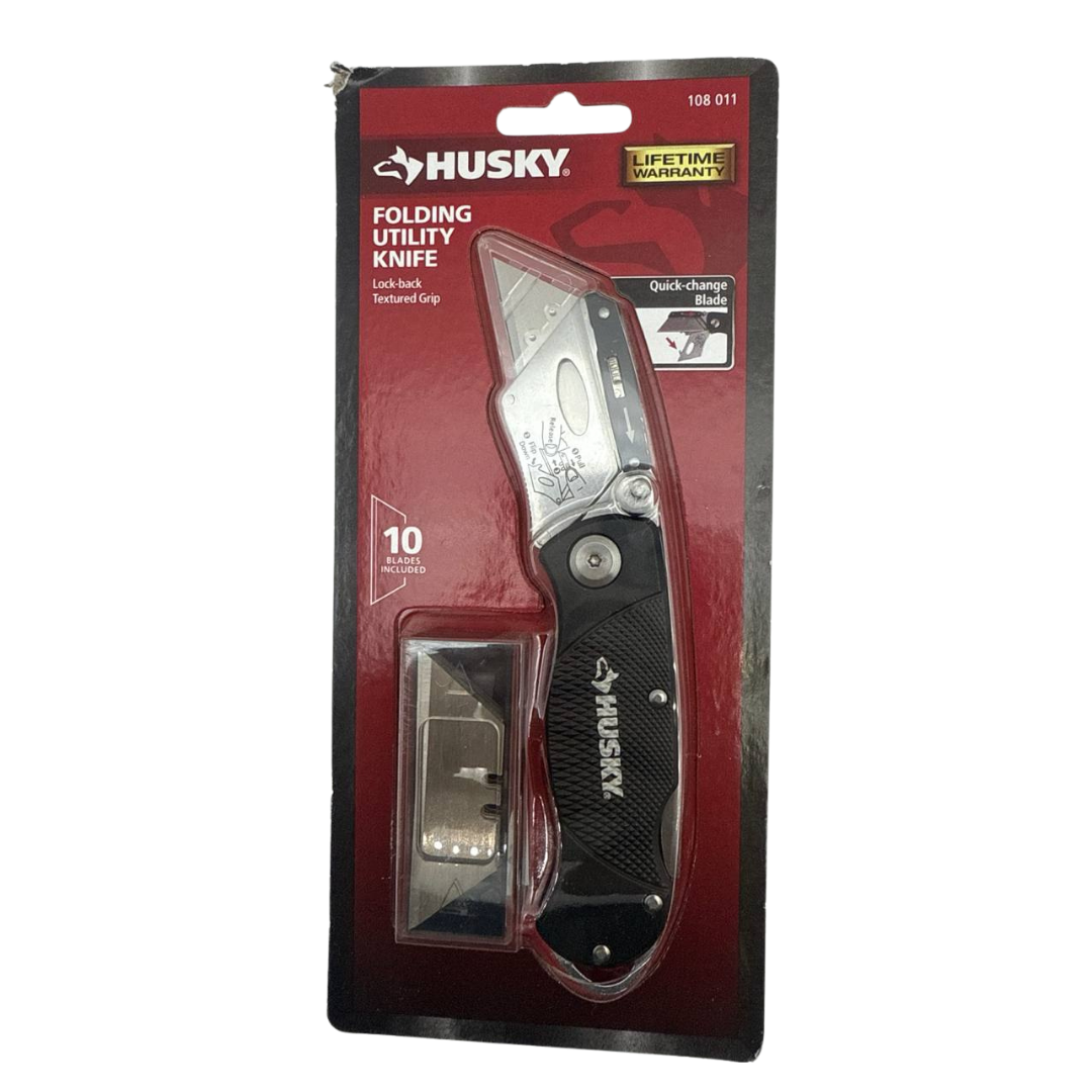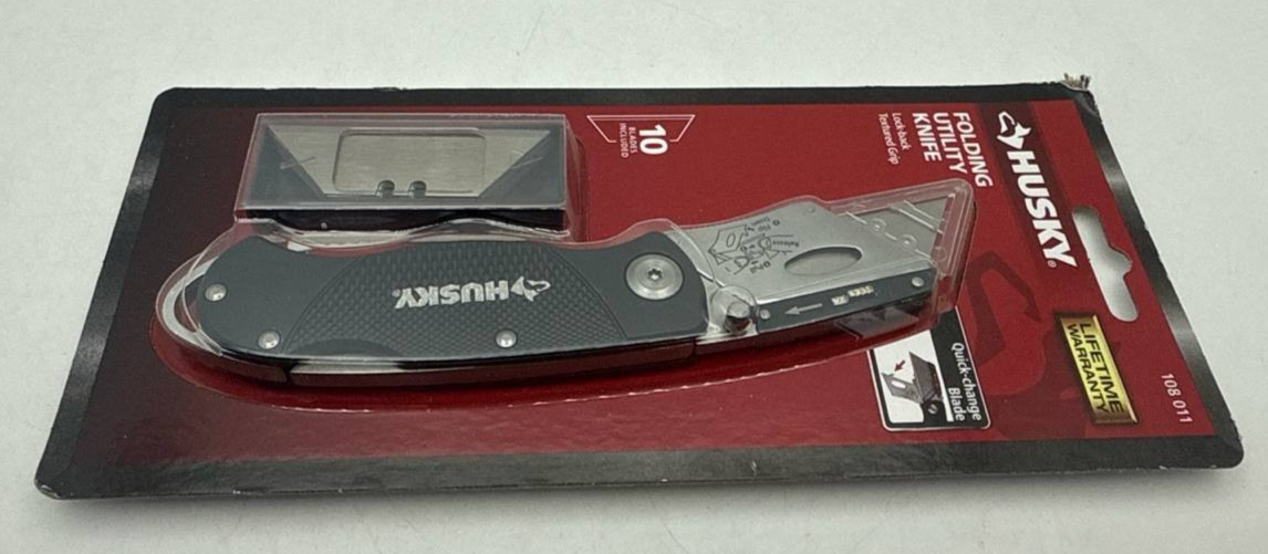 ?Husky Folding Lock-Back Utility Knife locks in place for efficient cutting. The handle is crafted of aluminum for strength. The knife features a folding design to help ensure safety. Includes 10 blades. All Husky hand tools are backed by a Lifetime warranty-the best in the industry. In the unlikely event that a Husky tool breaks, we'll replace it free of charge. See product packaging for details.