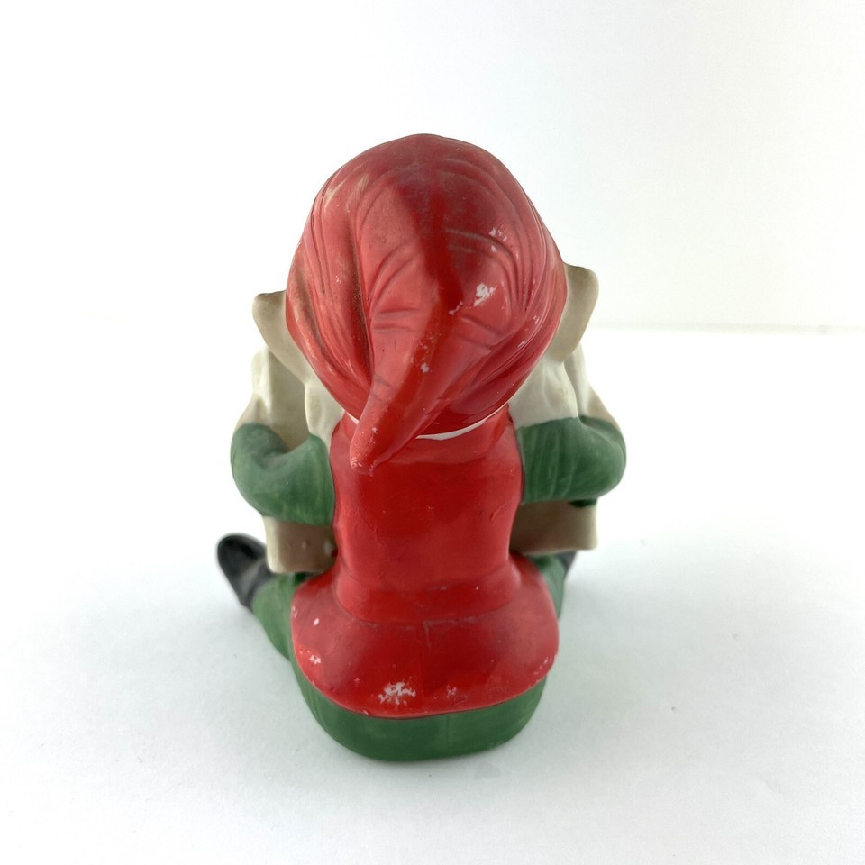 Sweet faced elf reads the book of "Naughty and Nice" while sitting down. Colors are red, green, white and black. Vintage 1960s look. Had older gold Homco label. Model No. 5205. Pre-owned figurine has paint wear and has only been lightly cleaned. See photos. Approximately 4" Tall and 3" Wide. A great addition to your holiday decor.