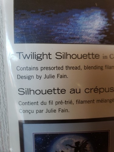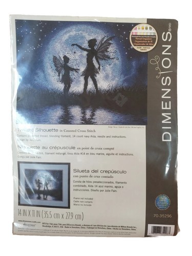 COUNTED cross stitch kit, "Twilight Silhouette" ~ a lovely design of two fairies dancing in front of the full moon. The blues and whites of the face of the moon fills 2/3 of the design and 1/2 the width. Silhouettes of a tall fairy and her smaller friend are in front of the large moon. They wear short tutu skirts, their butterfly wings translucent in the bright moonlight. A dark sky background is filled with bright stars, a pond in the foreground reflecting the moonlight and silhouettes. A perfect design for any fan of fairies, night scenes or mystical designs.
