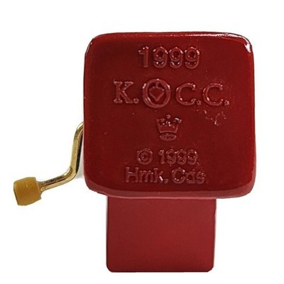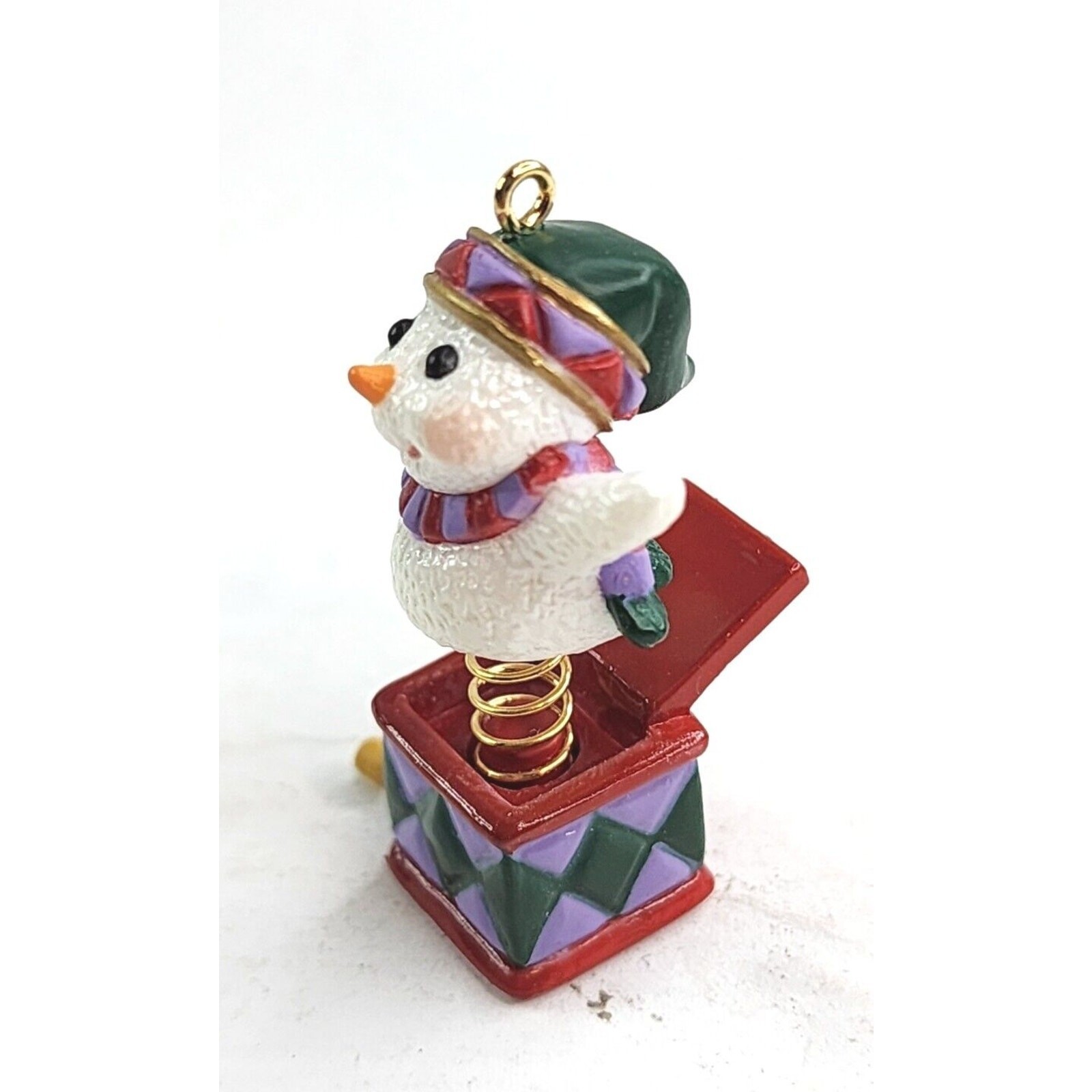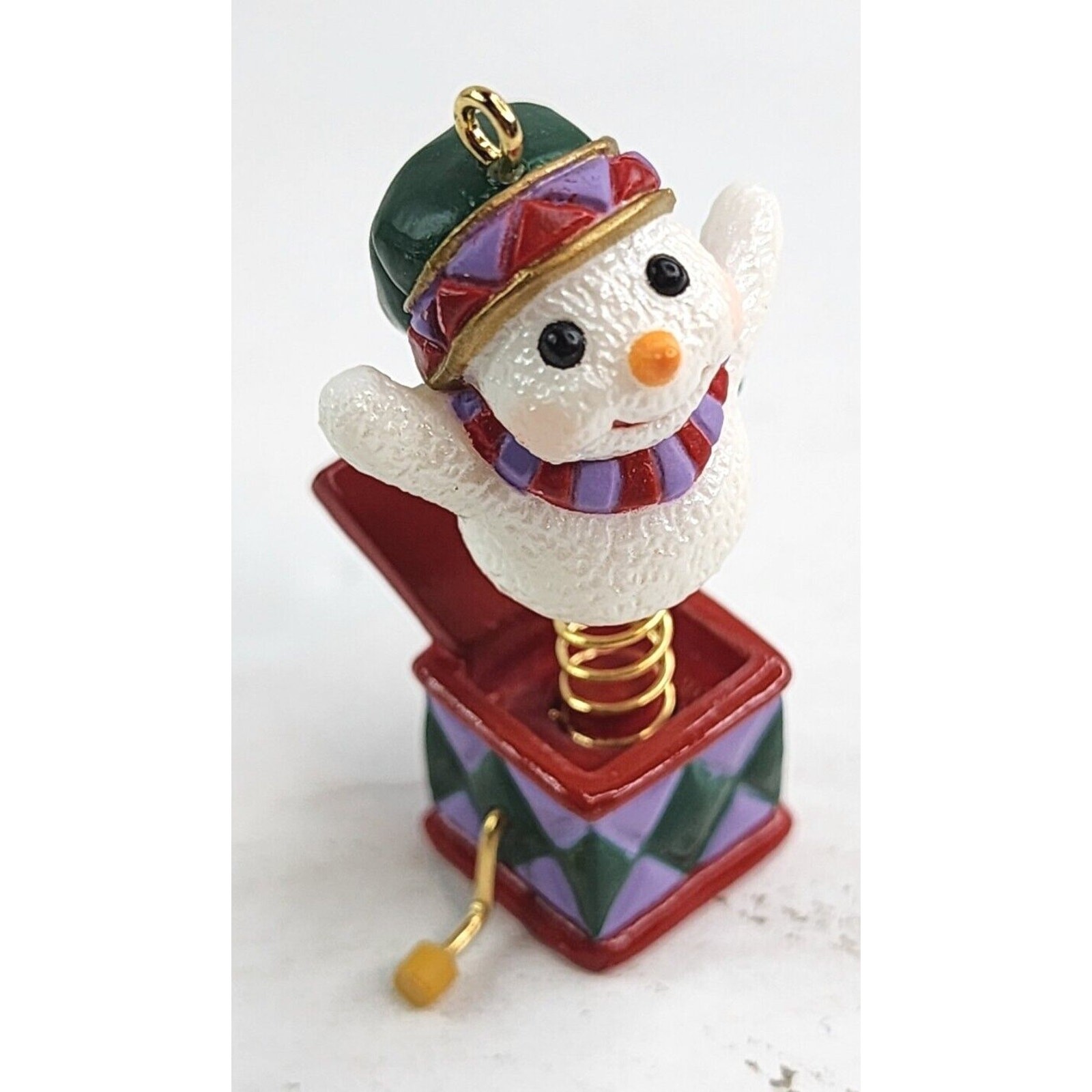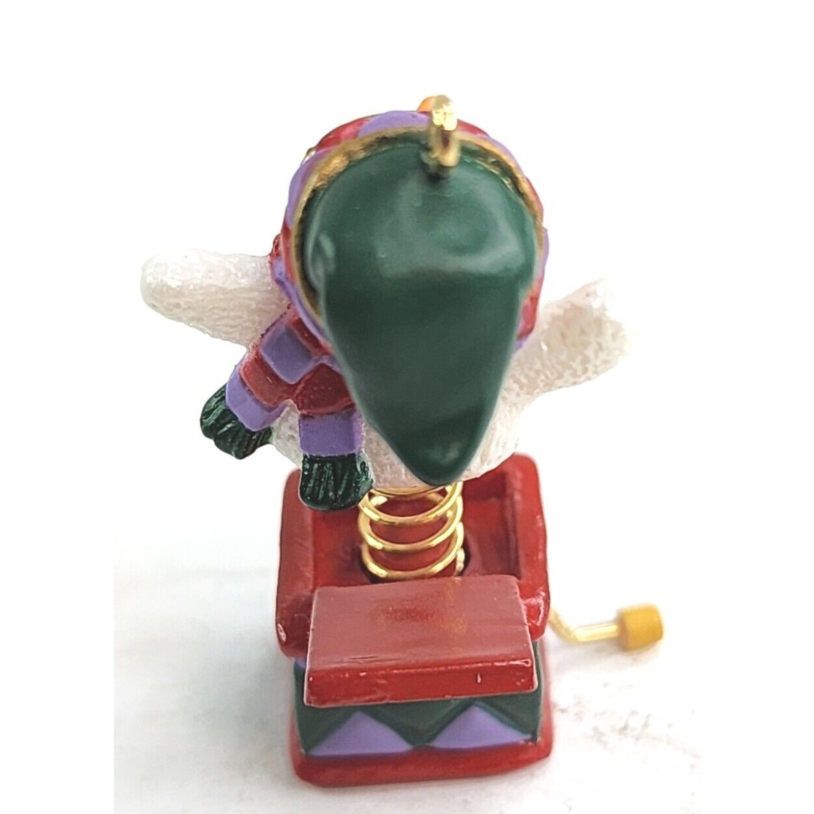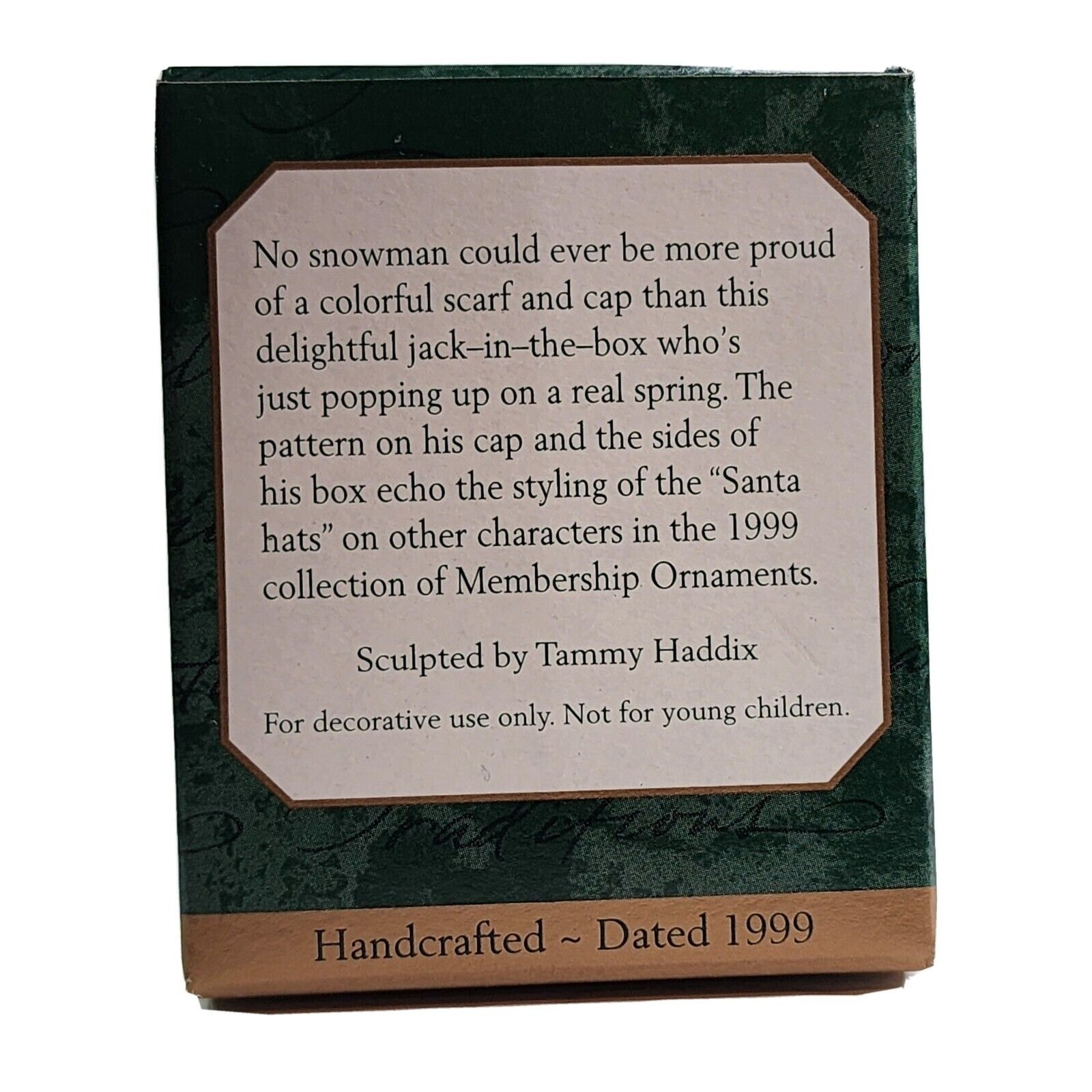 No snowman could ever be more proud of a colorful scarf and cap than this delightful jack-in-the-box who's just popping up on a real spring. The pattern on his cap and the sides of his box echo the styling of the "Santa hats" on other characters in the 1999 collection of Membership Ornaments.